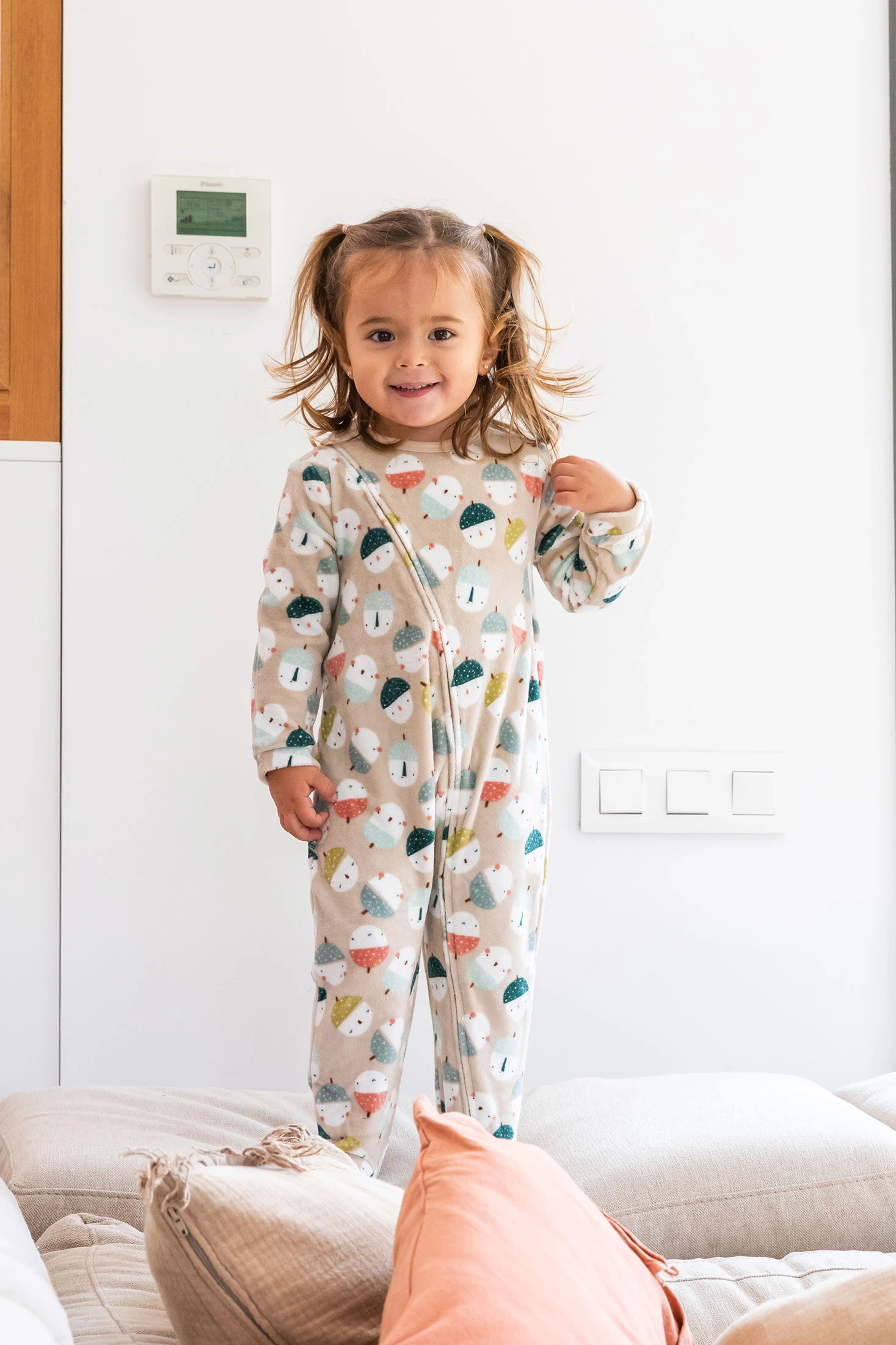 The baby romper is ideal for keeping the little ones warm during the colder seasons. It features a charming print in a neutral beige tone, making it easy to pair with other garments. The practical front diagonal zip closure makes changing clothes a breeze. Available in sizes from 0 to 24 months, this long-sleeved romper with covered feet ensures the baby is completely protected from the cold. It is an adorable and versatile garment for any occasion.