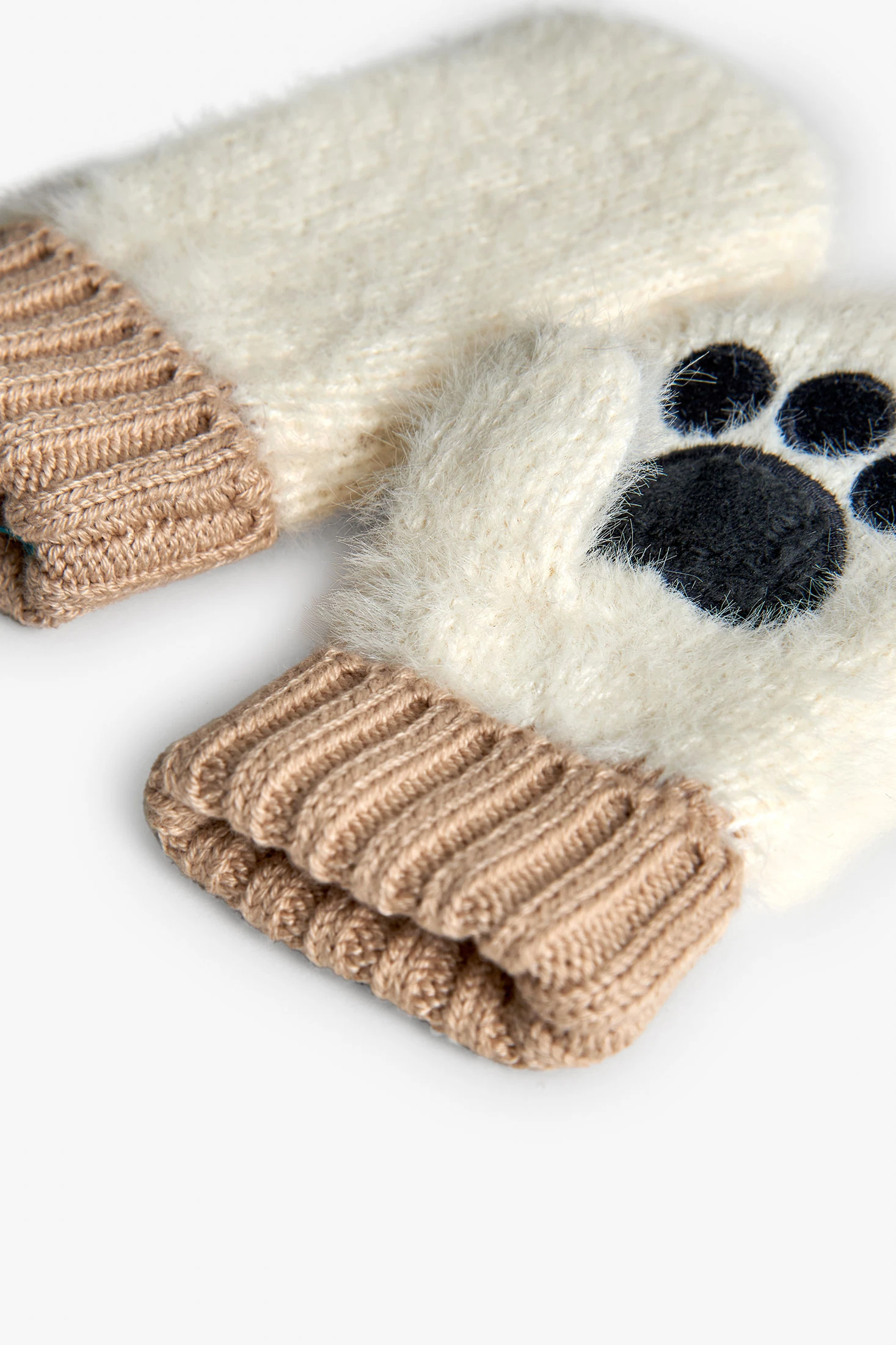 Baby gloves in white and beige, designed to keep your little one's hands warm and comfortable during the colder seasons. Made from a soft and delicate material, they are ideal for the sensitive skin of babies. The design featuring animal details adds a charming and fun touch. Available in sizes for babies aged 1 month to 24 months, these mittens easily match any winter outfit, making them a practical and cosy choice to complete your baby's wardrobe.