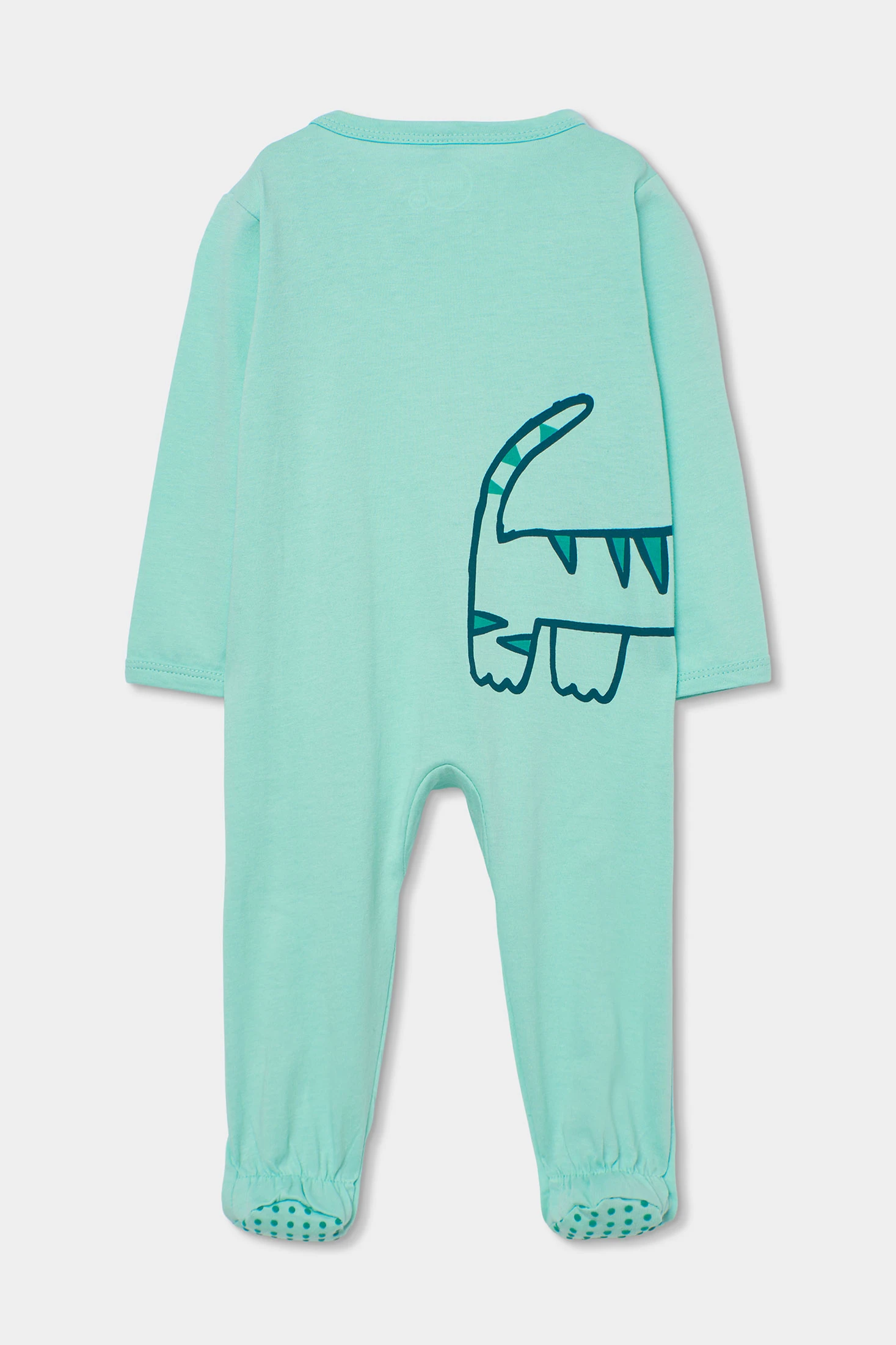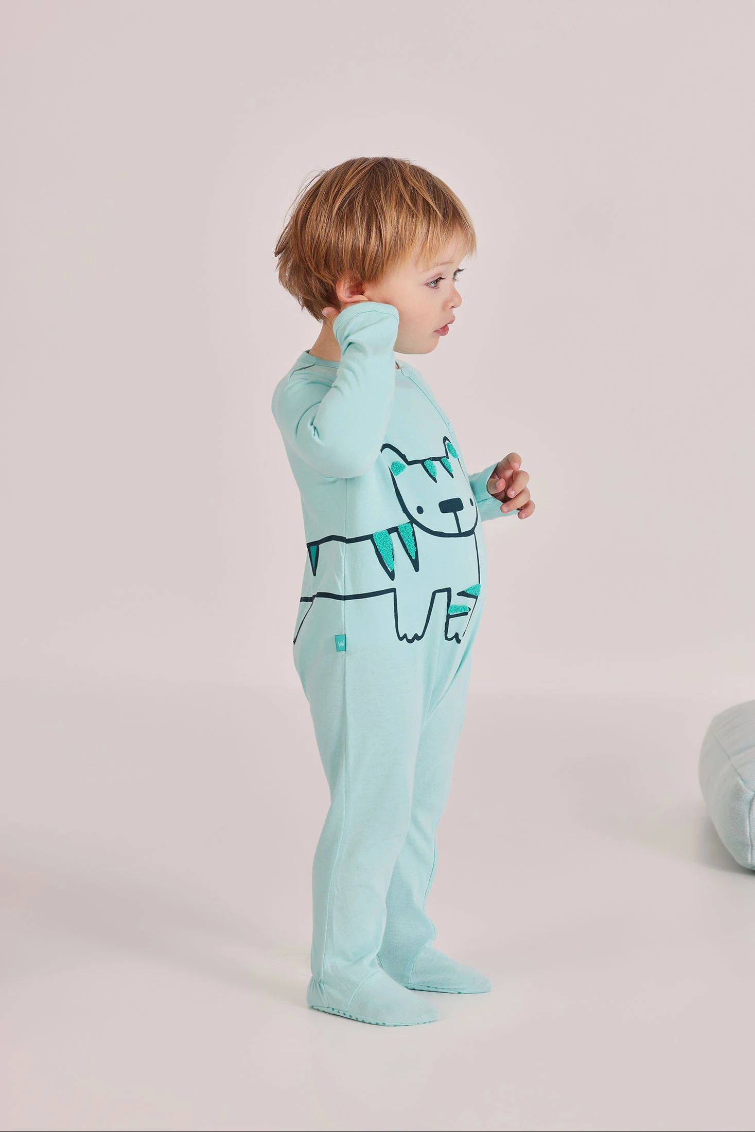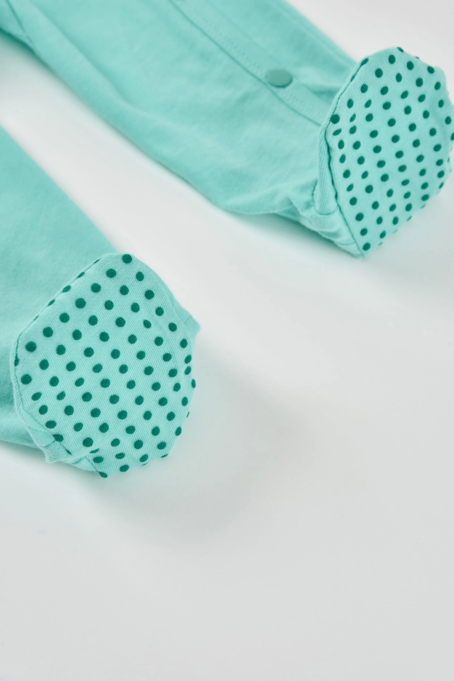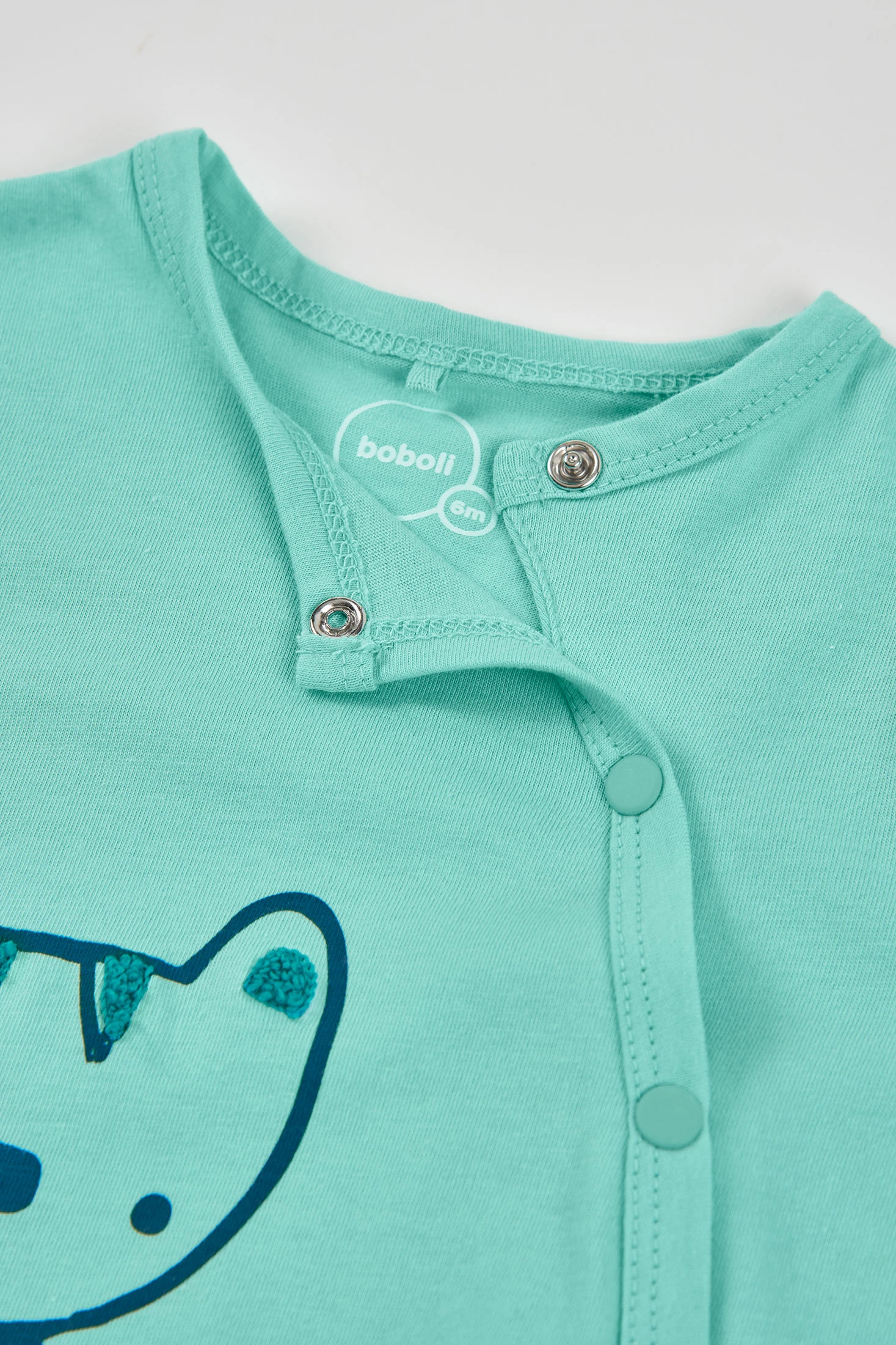 Knitted green romper for baby boy, perfect for keeping your little one comfortable and warm. Designed with a cute animal on the front, it adds an adorable touch to your baby's outfit. Its soft fabric is perfect for delicate skin. Available in sizes from 0 to 24 months, the button closure makes changing clothes and nappies easy. Long sleeves and covered feet ensure warmth on cooler days. A functional and charming set for the early stages of life.