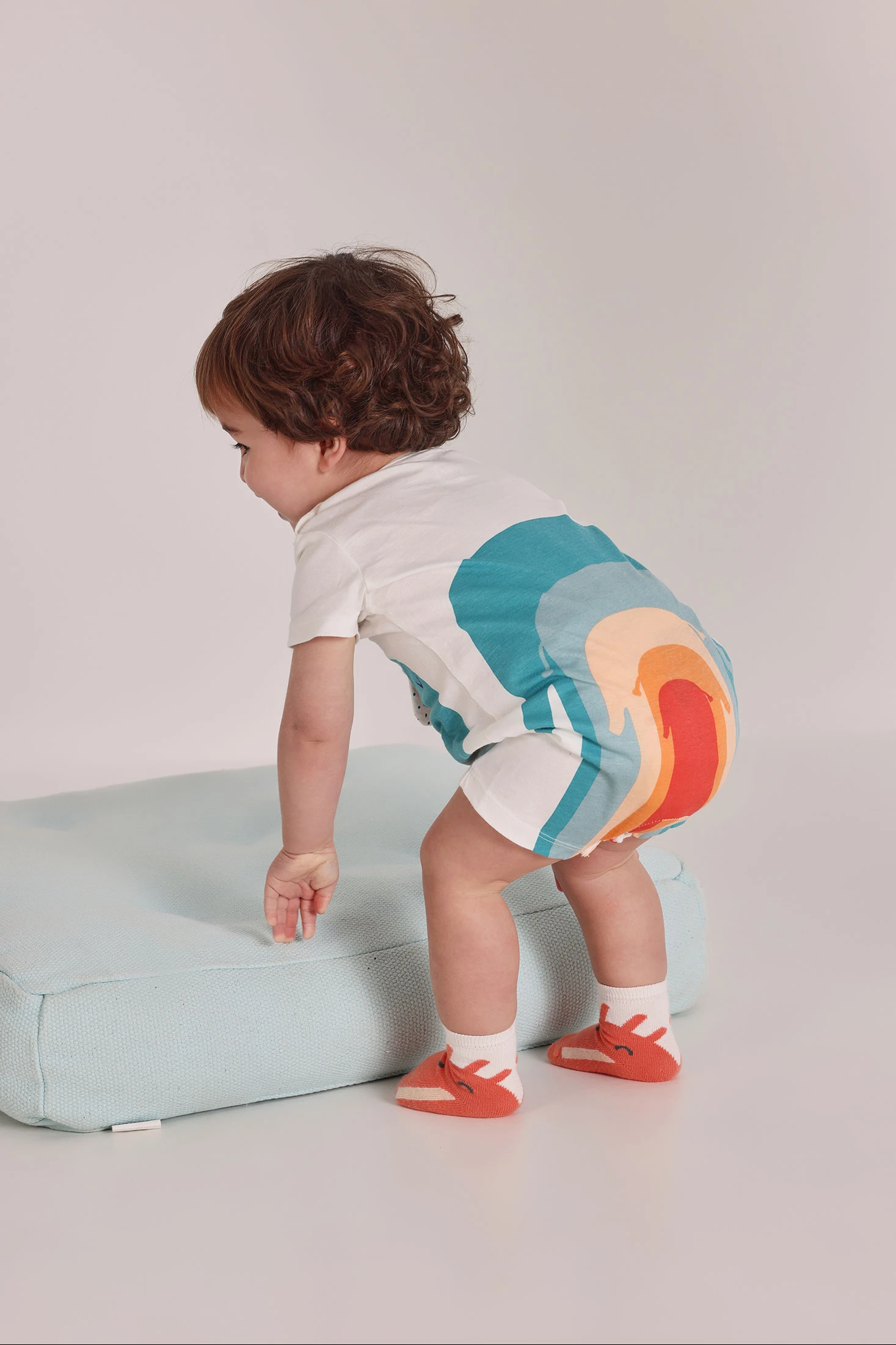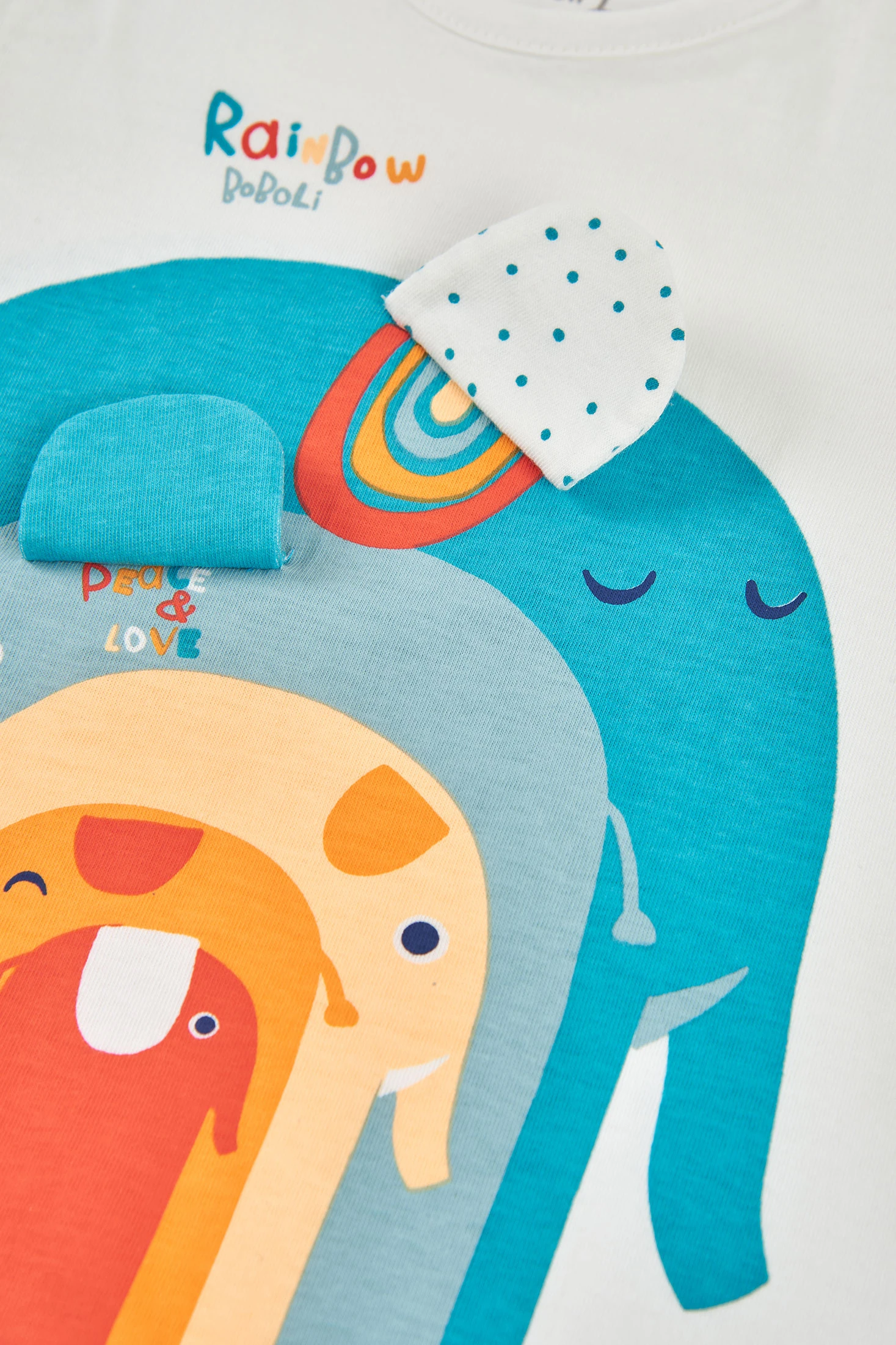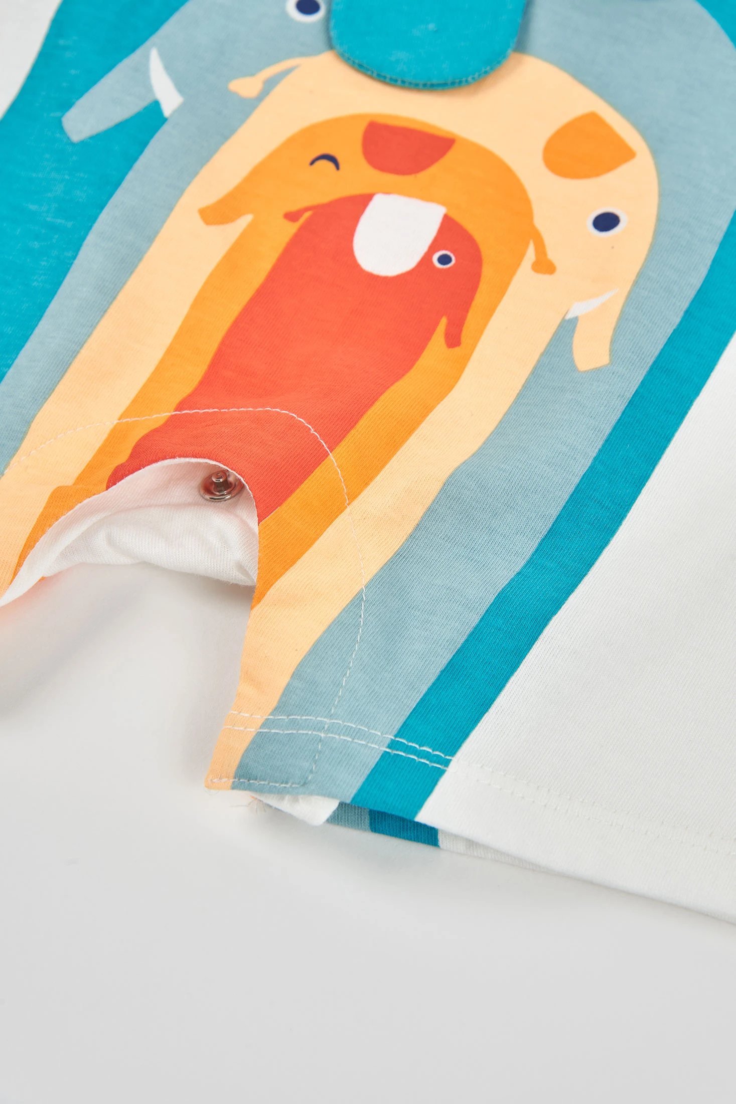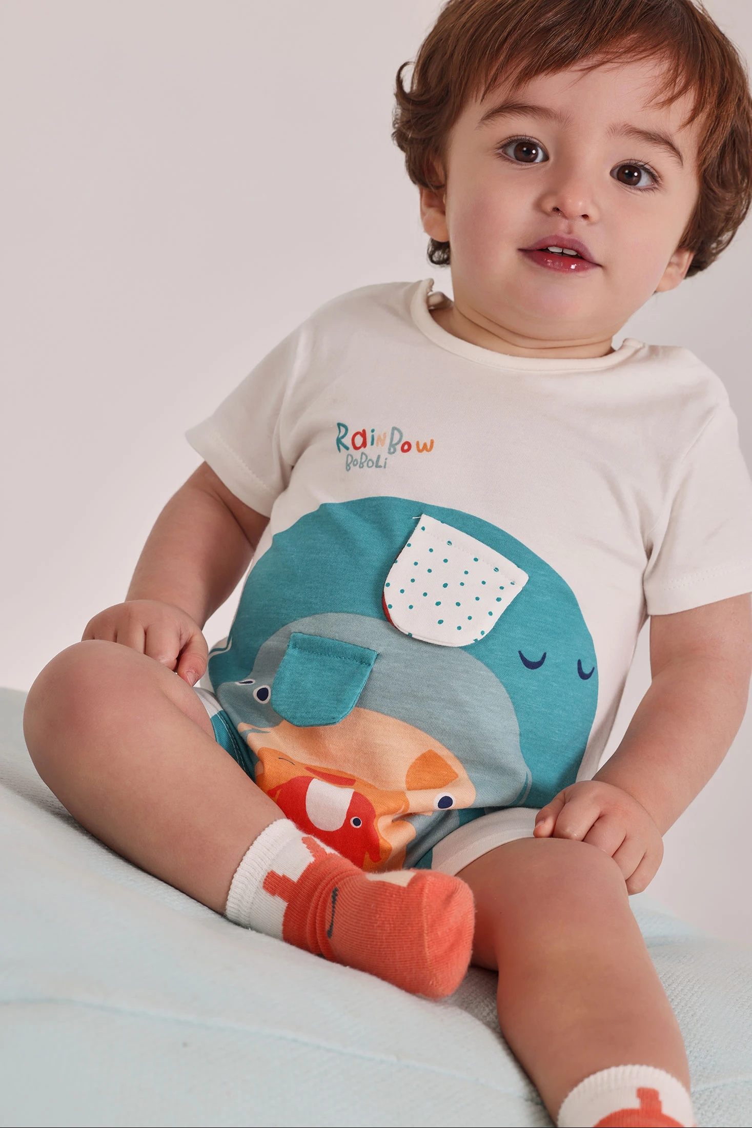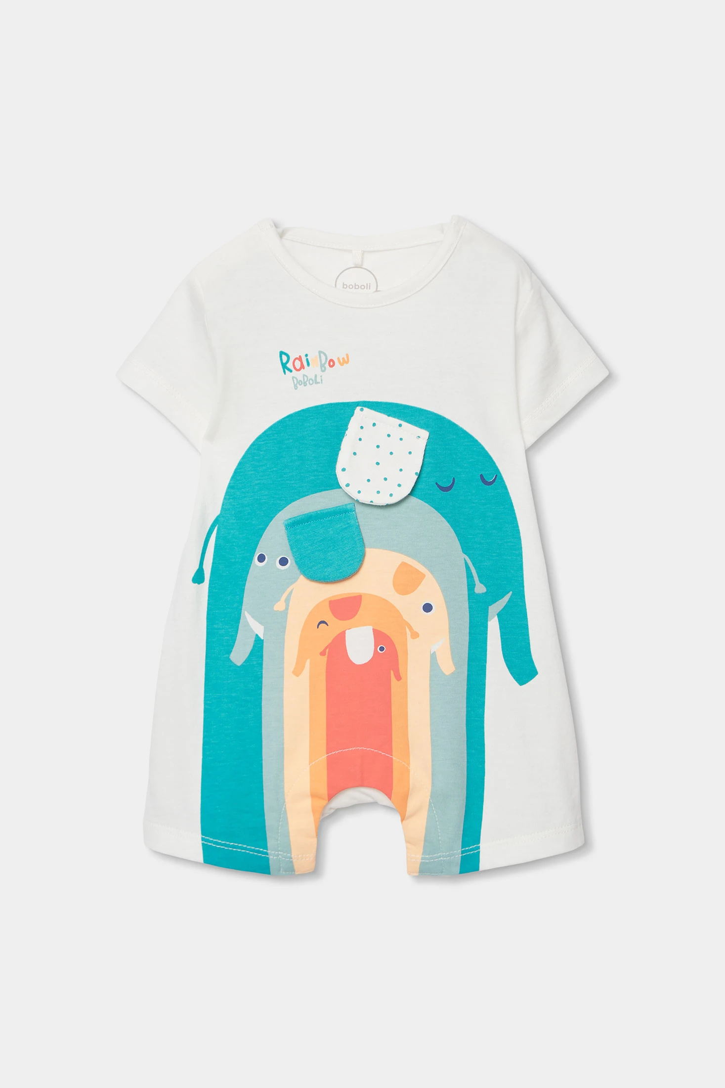 Baby romper in white cotton, perfect for the little ones. Its design features a colourful print of elephants that adds a playful touch. Ideal for maintaining the baby's comfort thanks to its soft and breathable fabric. Available in sizes from 0 months to 24 months, it is designed to accommodate the baby's growth. With a round neck and short sleeves, it is practical and easy to put on. Its neutral colour and vibrant print make it a charming and functional choice for daily use.