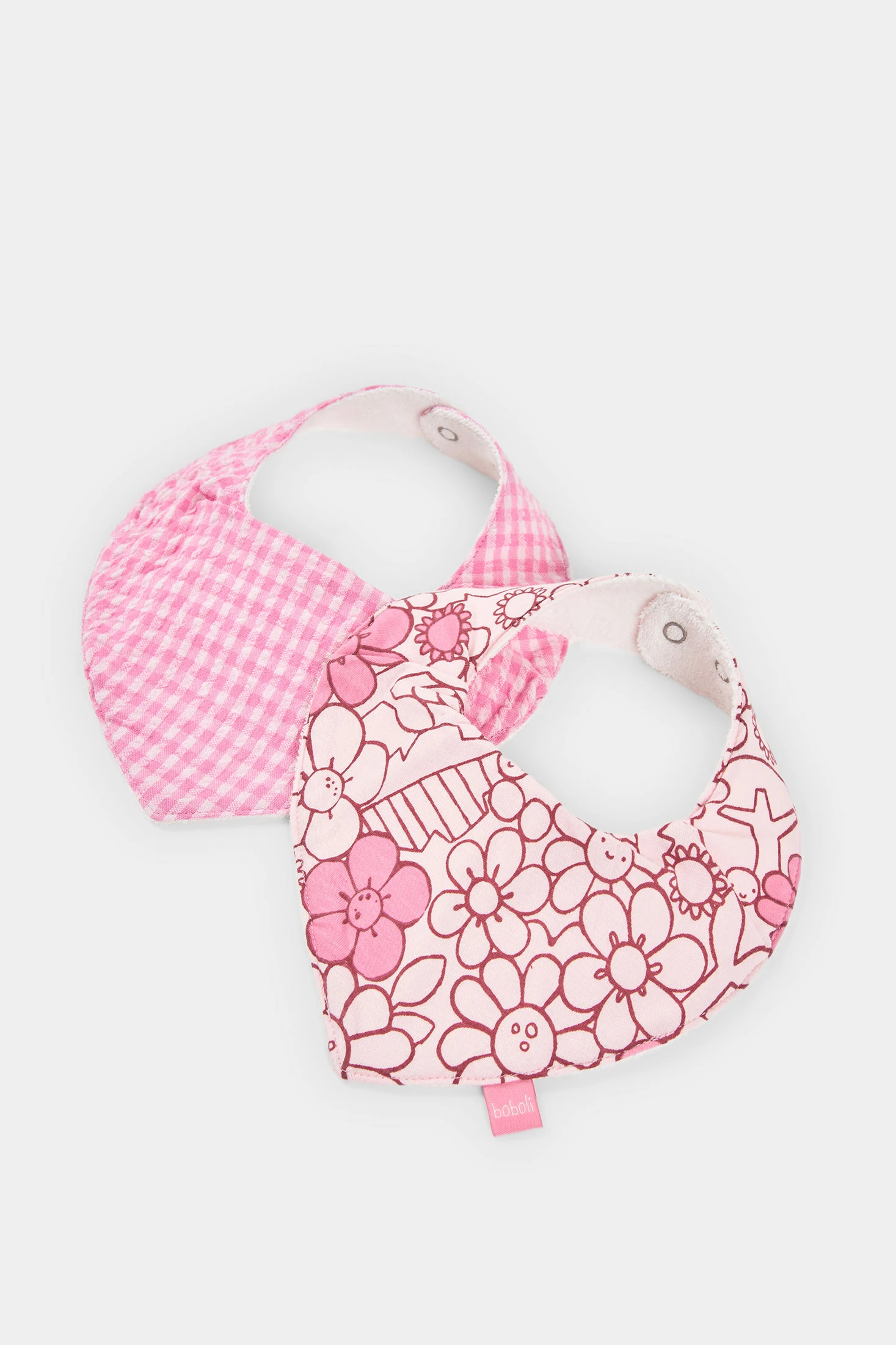 Pack of 2 cotton handkerchiefs for girls, perfect for babies. Made from soft cotton fabric, they offer comfort and delicacy. One features a pink checkered design in poplin, while the other has a floral print in the same colour palette. Ideal for ages from 0 months to 24 months, but in one size, they ensure practicality and style. These handkerchiefs, besides being functional, add a charming touch to the little one's daily ensemble, complementing outfits with their sweet and attractive floral and geometric design.