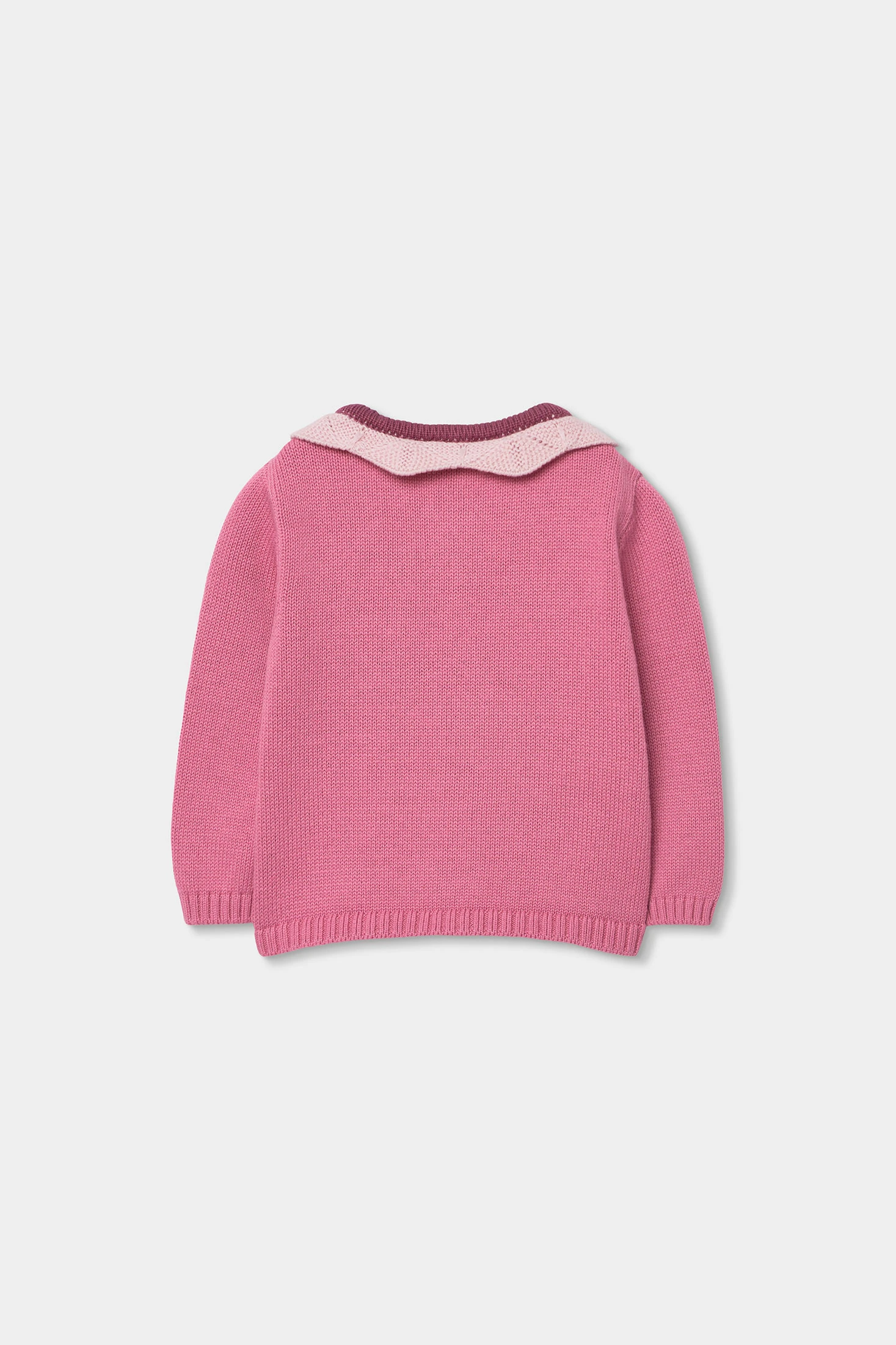 Pink knitted cardigan for baby girl, perfect for keeping your little one warm. With a contrasting leaf design, it adds a charming touch. The frill collar, resembling petals, gives it a sweet and elegant style. Made from soft knitted fabric, it is ideal for delicate skin. Available in sizes from 1 month to 24 months, it adapts to growth. An essential garment to pair with dresses or trousers for special occasions or daily wear, providing warmth and style in any season.