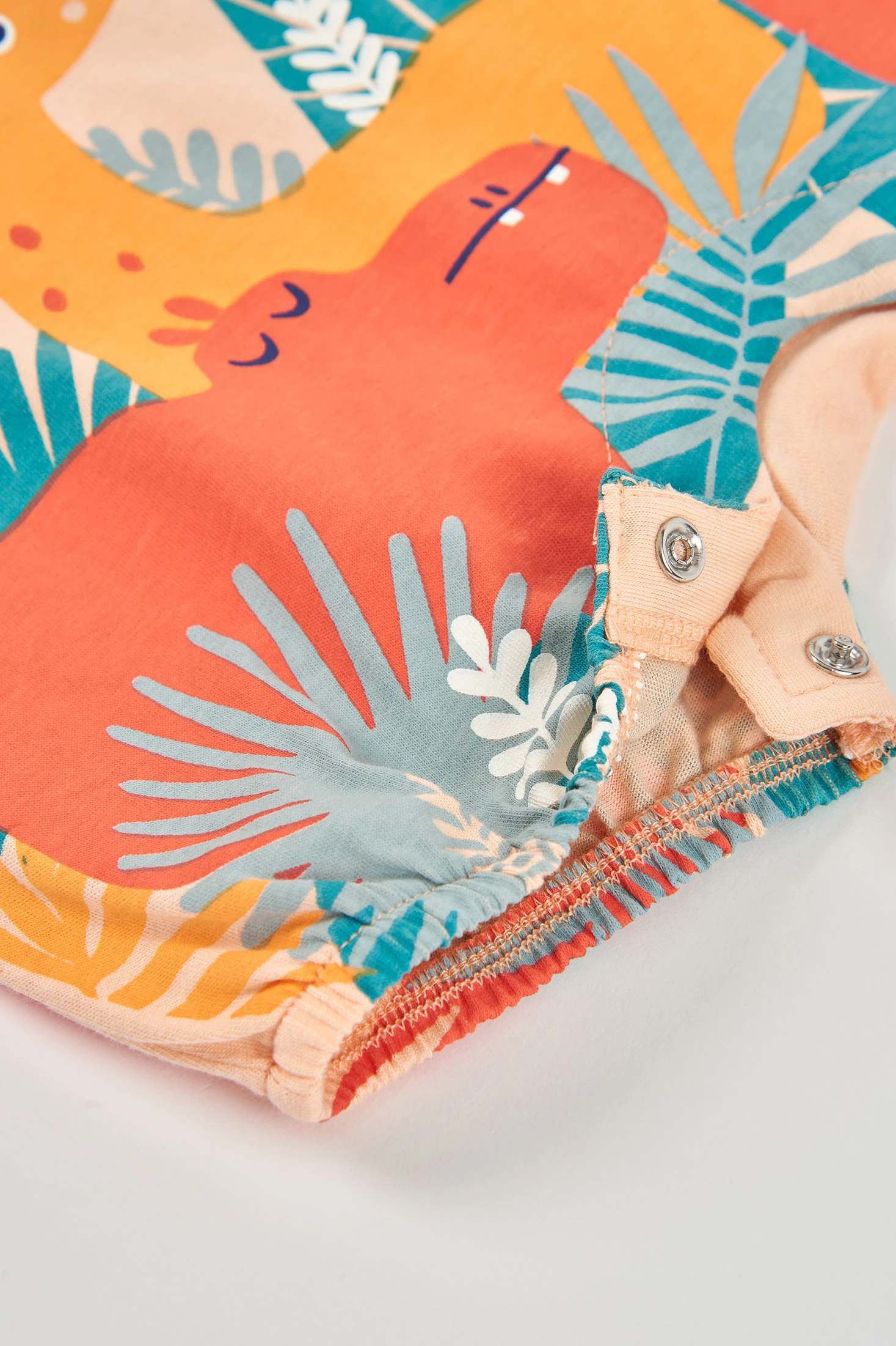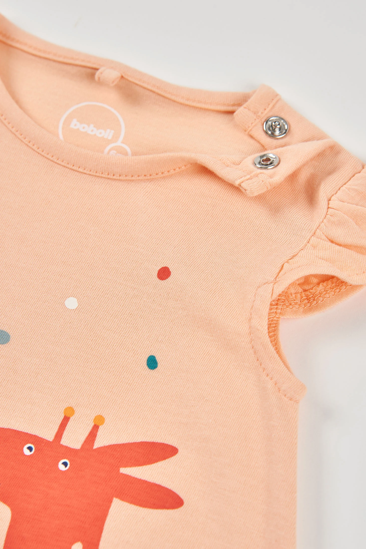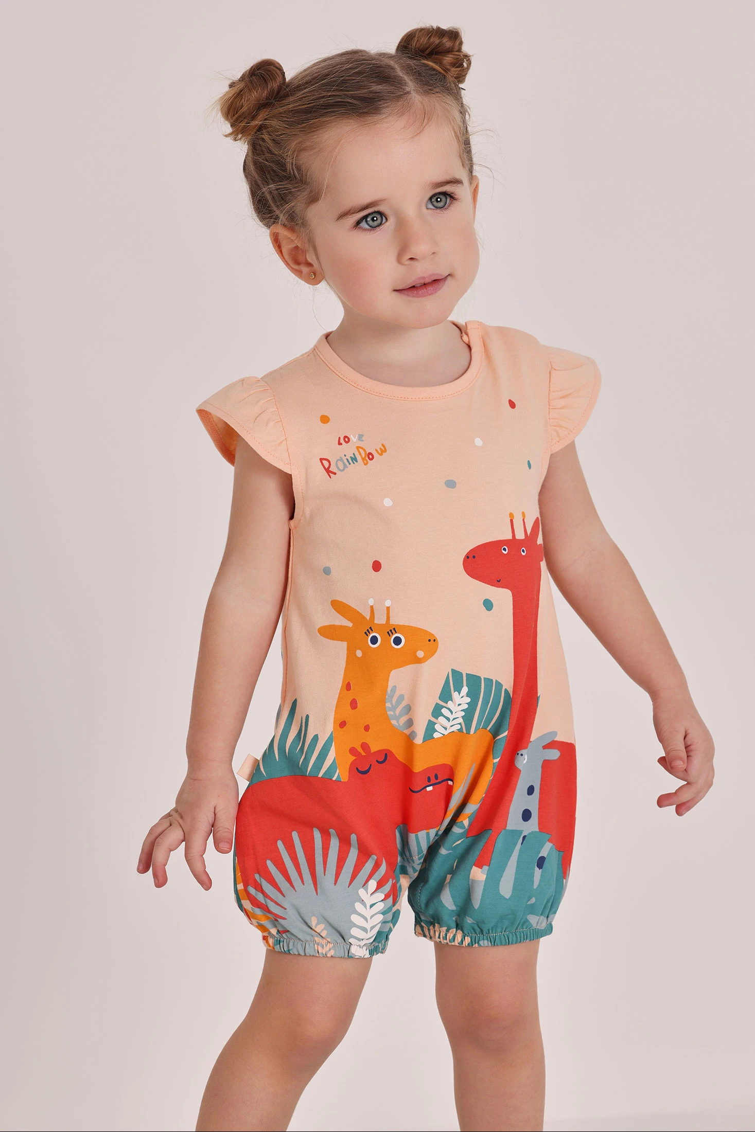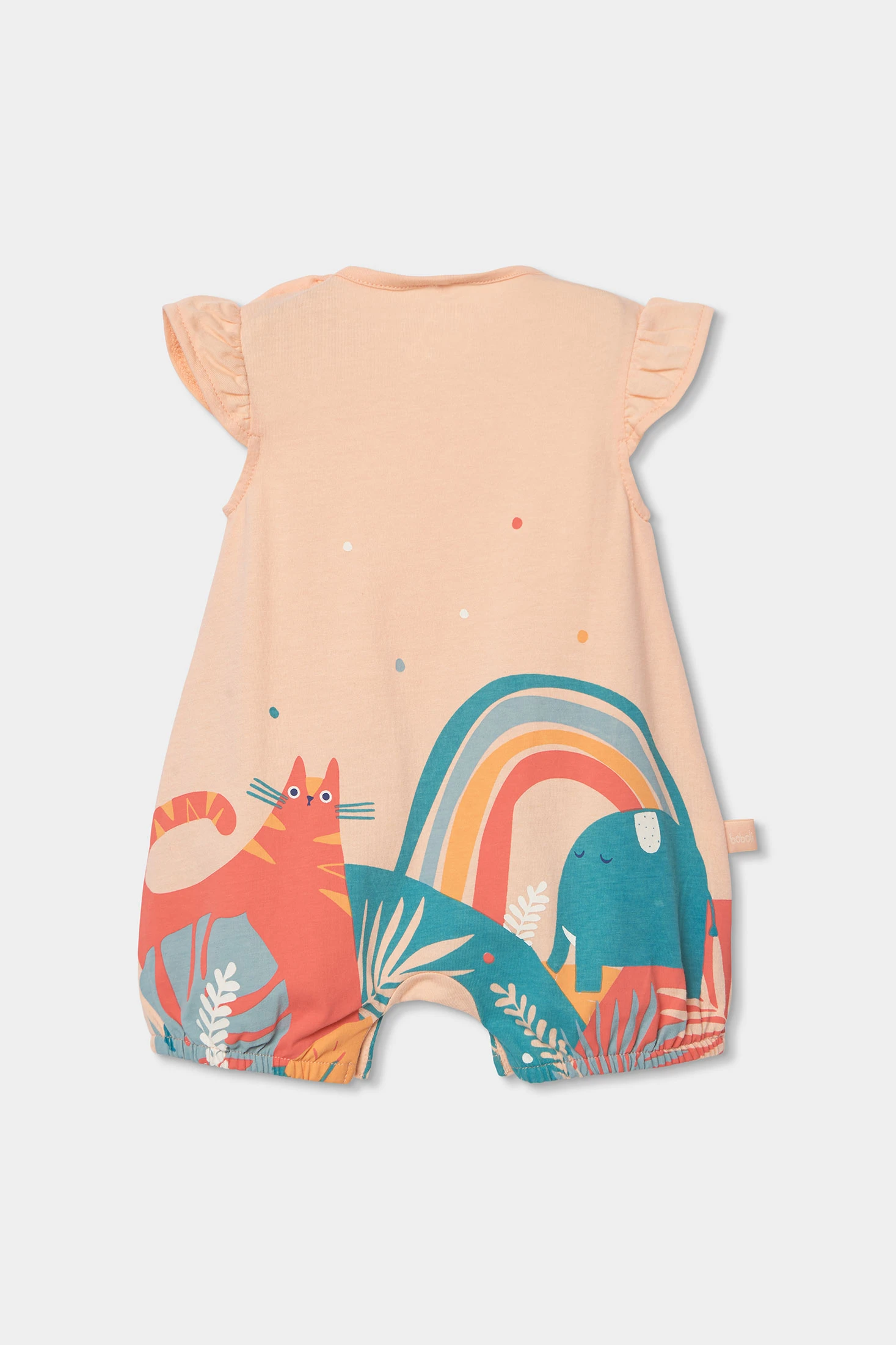 Cotton sleepsuit for baby girl, ideal for keeping your little one comfortable. In light orange, it stands out for its design with colourful animal illustrations and cheerful details. The soft fabric is perfect for the delicate skin of babies. Available sizes range from 0 to 24 months, adapting to your baby's growth. With short sleeves and elasticated leg openings for a good fit, it is a practical and charming garment for the first months of life.