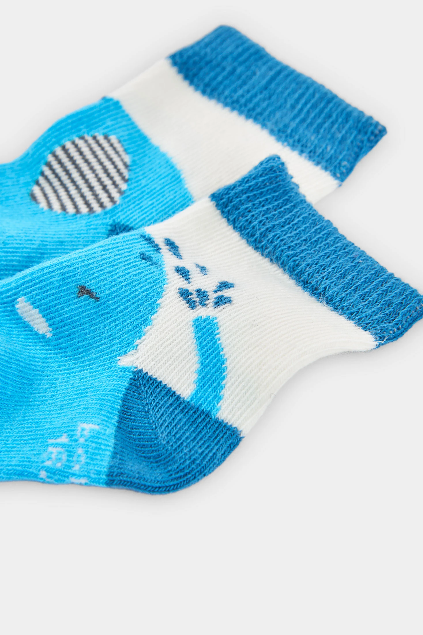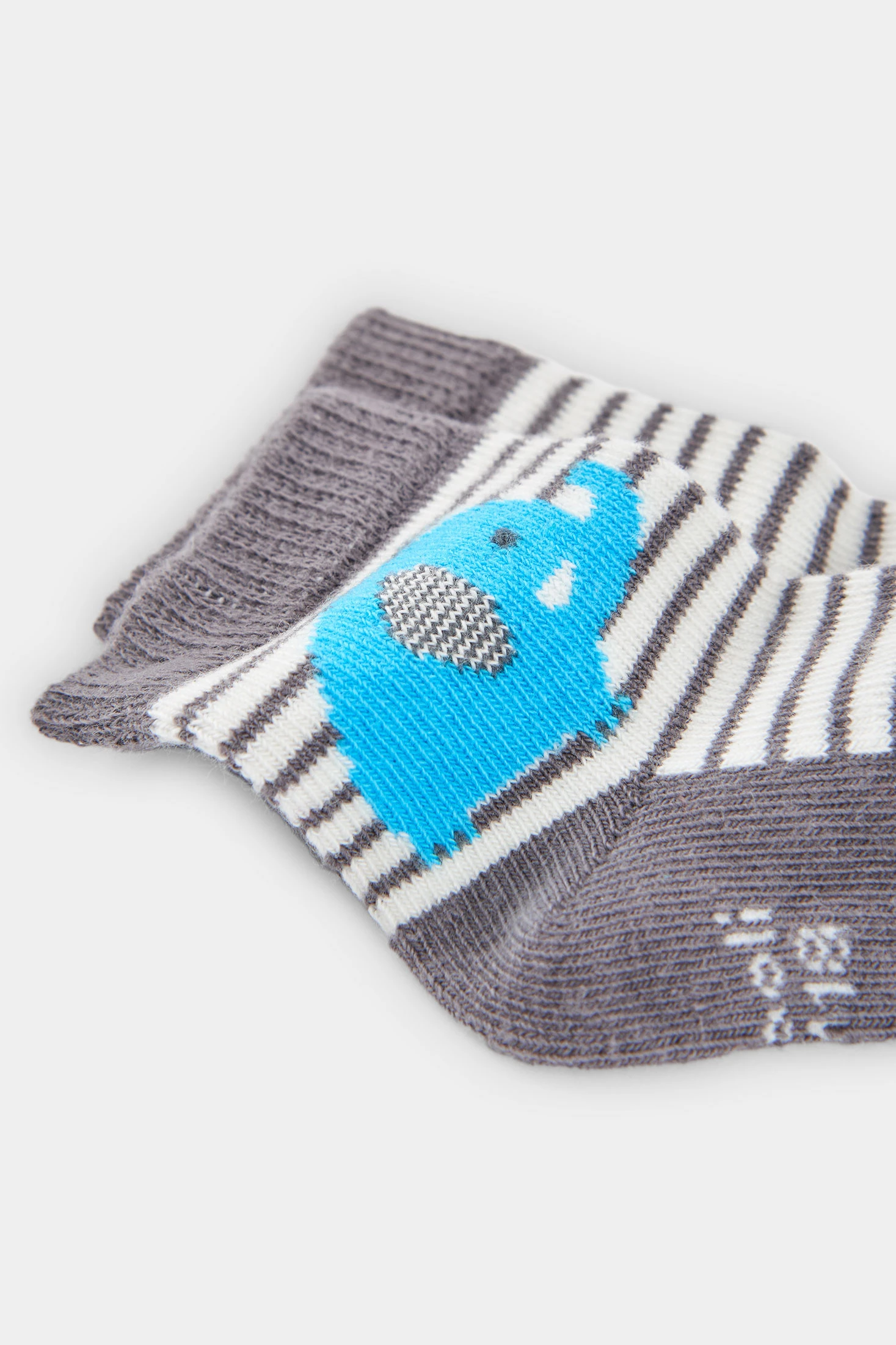 Pack of socks for newborns, ideal for keeping your baby's feet warm. Made from soft cotton, they guarantee comfort and breathability. They come in shades of blue and grey, with fun animal designs that add a playful touch. Available in sizes: 16/18, 19/21, and 22/24. Perfect for pairing with baby clothes for everyday wear, adding style and functionality to each outfit.