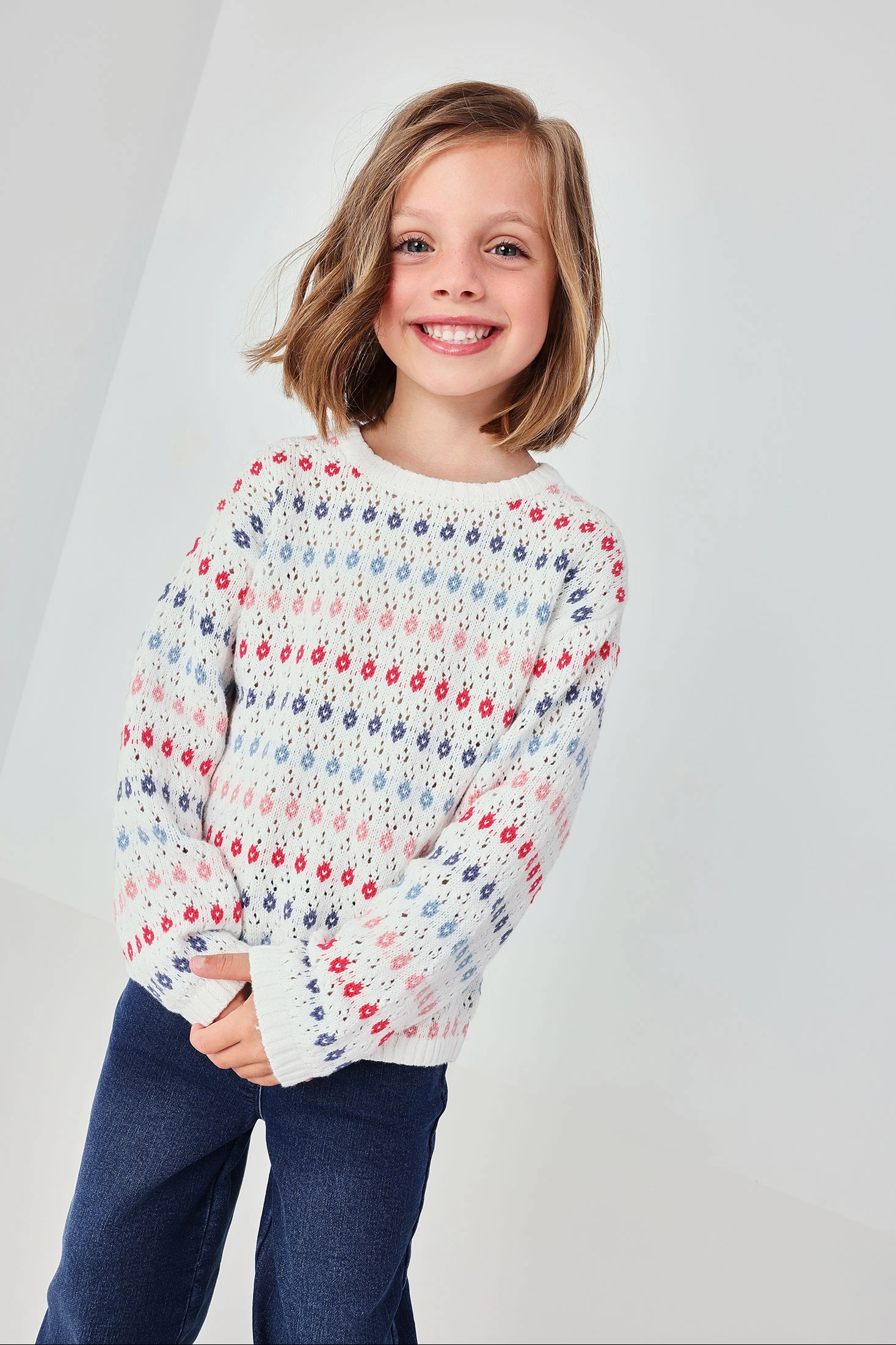 White cotton jumper with eyelets, combined in shades of blue and pink. The cotton material ensures softness and warmth, ideal for spring-summer. Round neck and long sleeves. Available in sizes from 12 months to 10 years, it adapts to different stages of growth. Easily pairs with trousers or skirts for a casual and comfortable look.