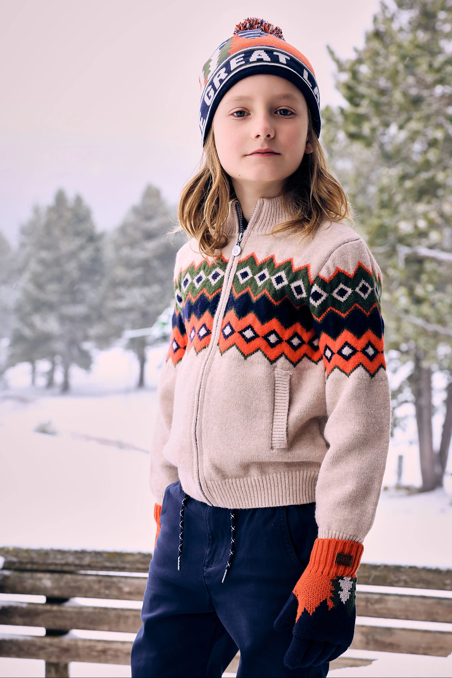 Knitted jacket for boys in beige, ideal for the autumn and winter seasons. Made from warm and soft fabric, it features an elegant geometric design in brown and grey tones that stand out against the beige background. Equipped with a zipper closure for easy daily use, it includes a high collar that provides extra protection against the cold. Available in sizes from 2 to 14 years, this versatile and modern jacket complements any casual outfit, adding style and comfort for the little ones.