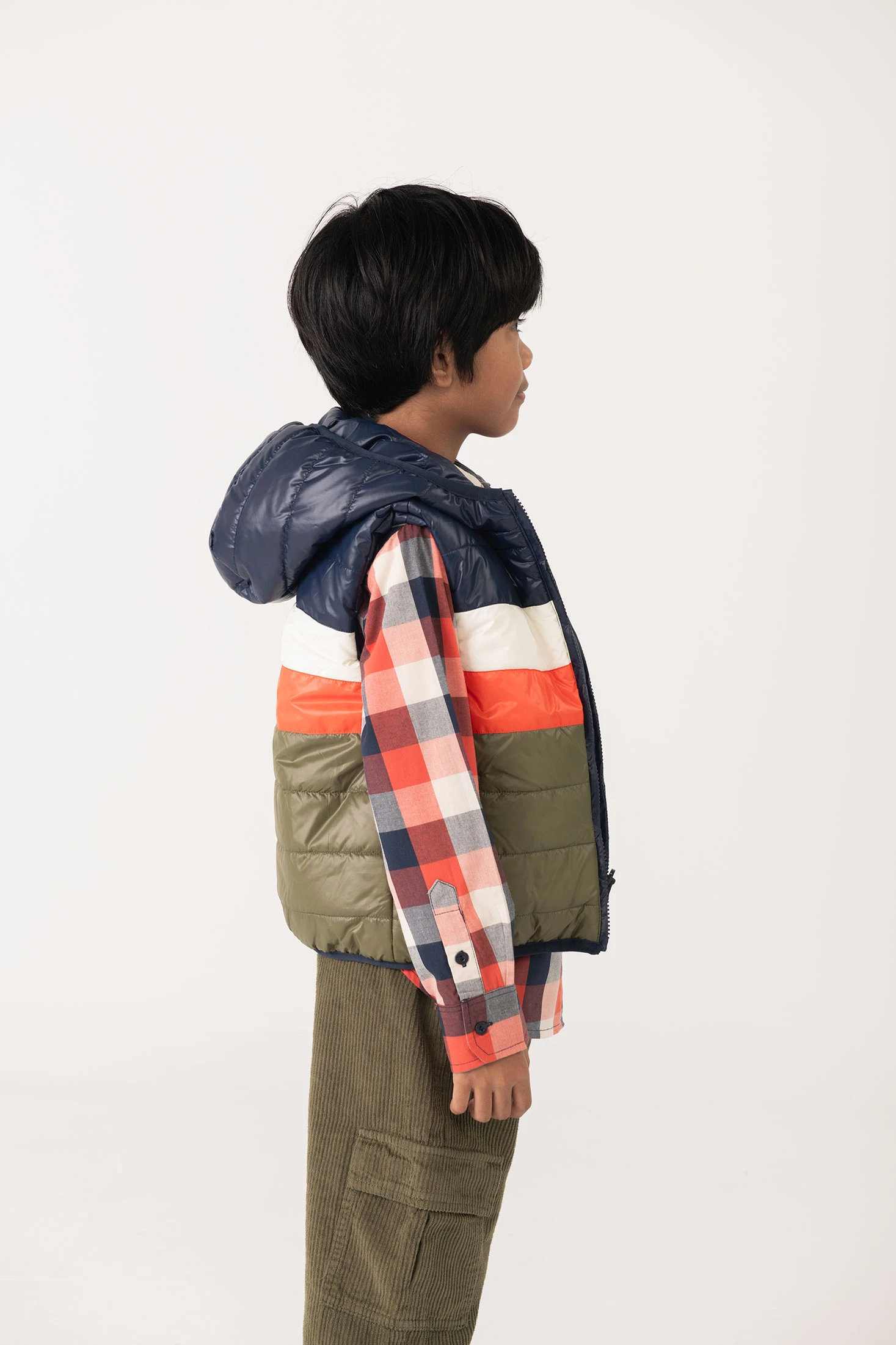 Reversible vest in reversible technical fabric, ideal for children, perfect for the autumn and winter seasons. It features a colour-block design: navy blue on one side and red and olive green on the other, providing versatility and style. Made with water-resistant material, it offers warmth and protection against the cold. Available in sizes 2 to 14 years, it pairs excellently with jumpers and long-sleeved T-shirts, ensuring your child stays warm and comfortable during the colder days.