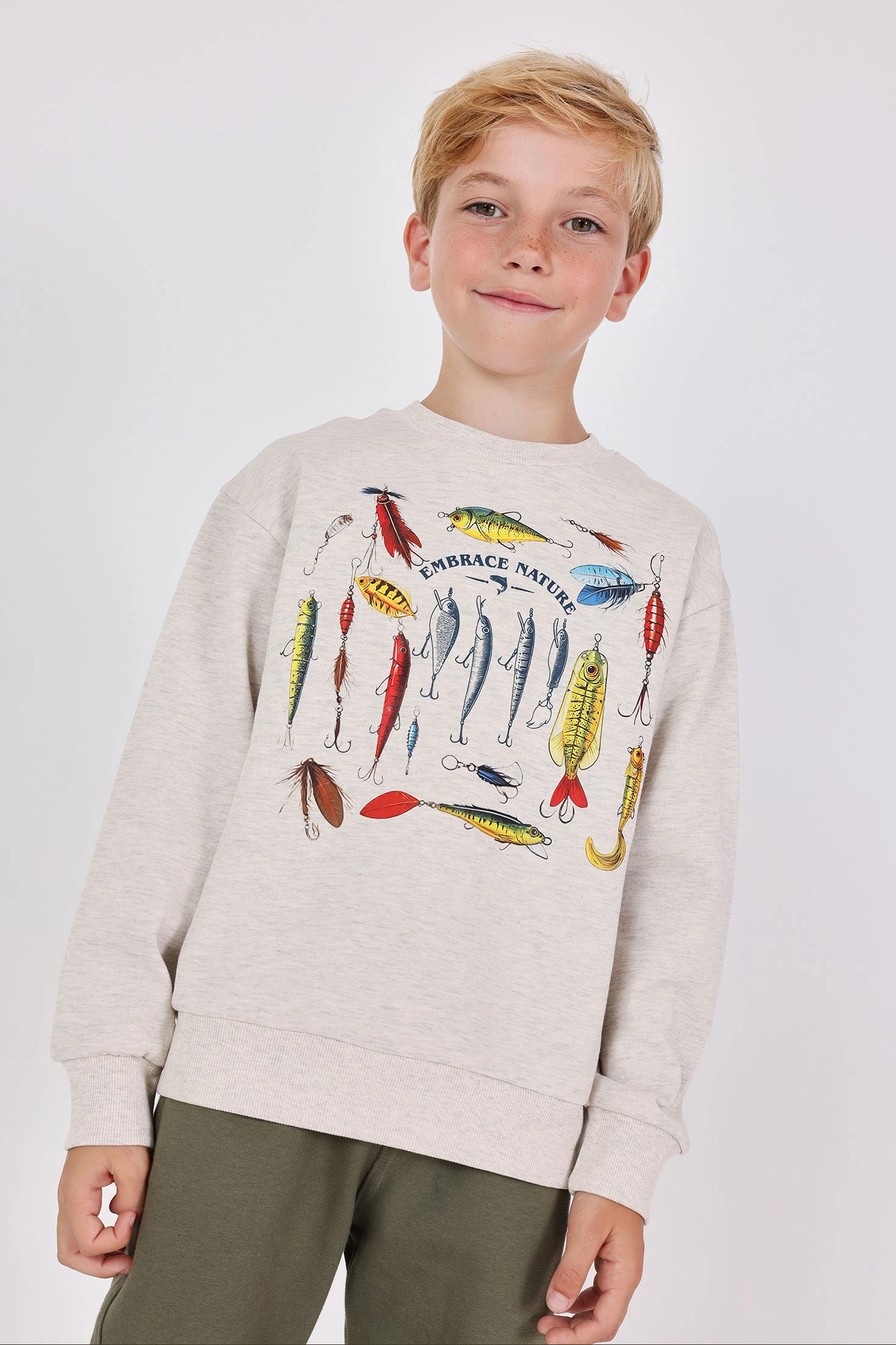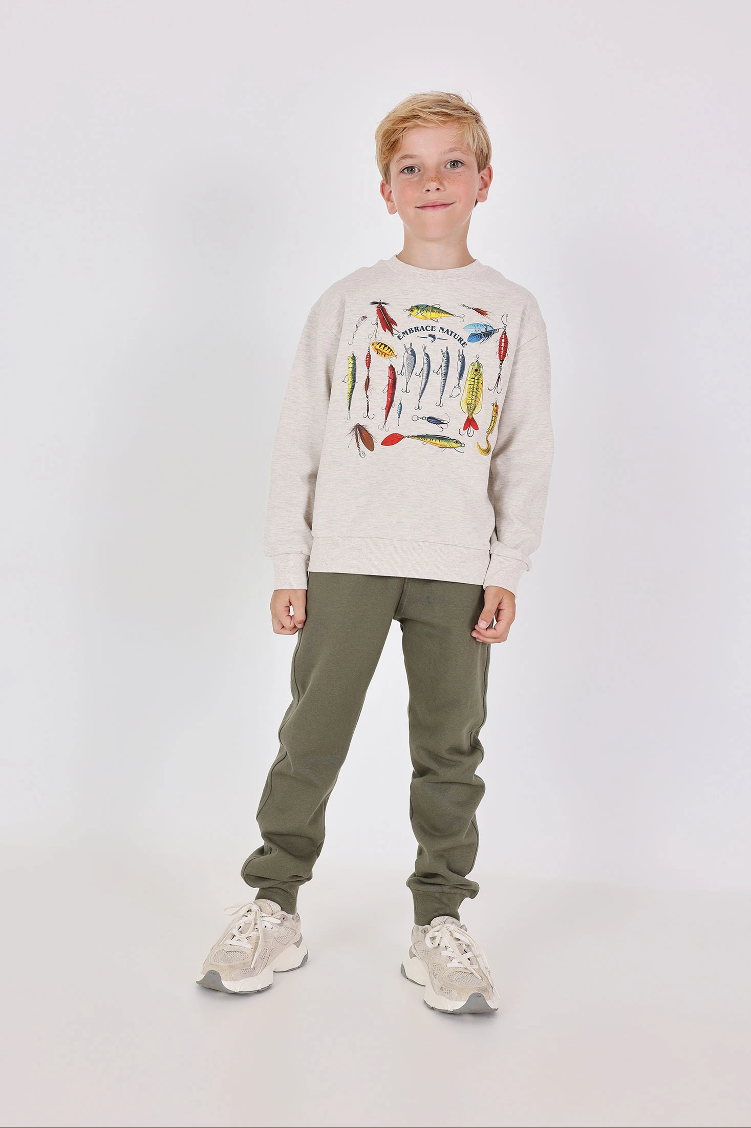 Cotton set for boys in beige featuring a charming fishing lure print, ideal for outdoor activities and for little ones who love nature. Designed to provide comfort during the colder seasons, thanks to its warm and cosy material. Available in sizes from 2 to 14 years, it fits perfectly for different ages and body types. Can be easily paired with trainers for a casual and fun look. Perfect for parents who want to add a touch of originality to their children's winter wardrobe.