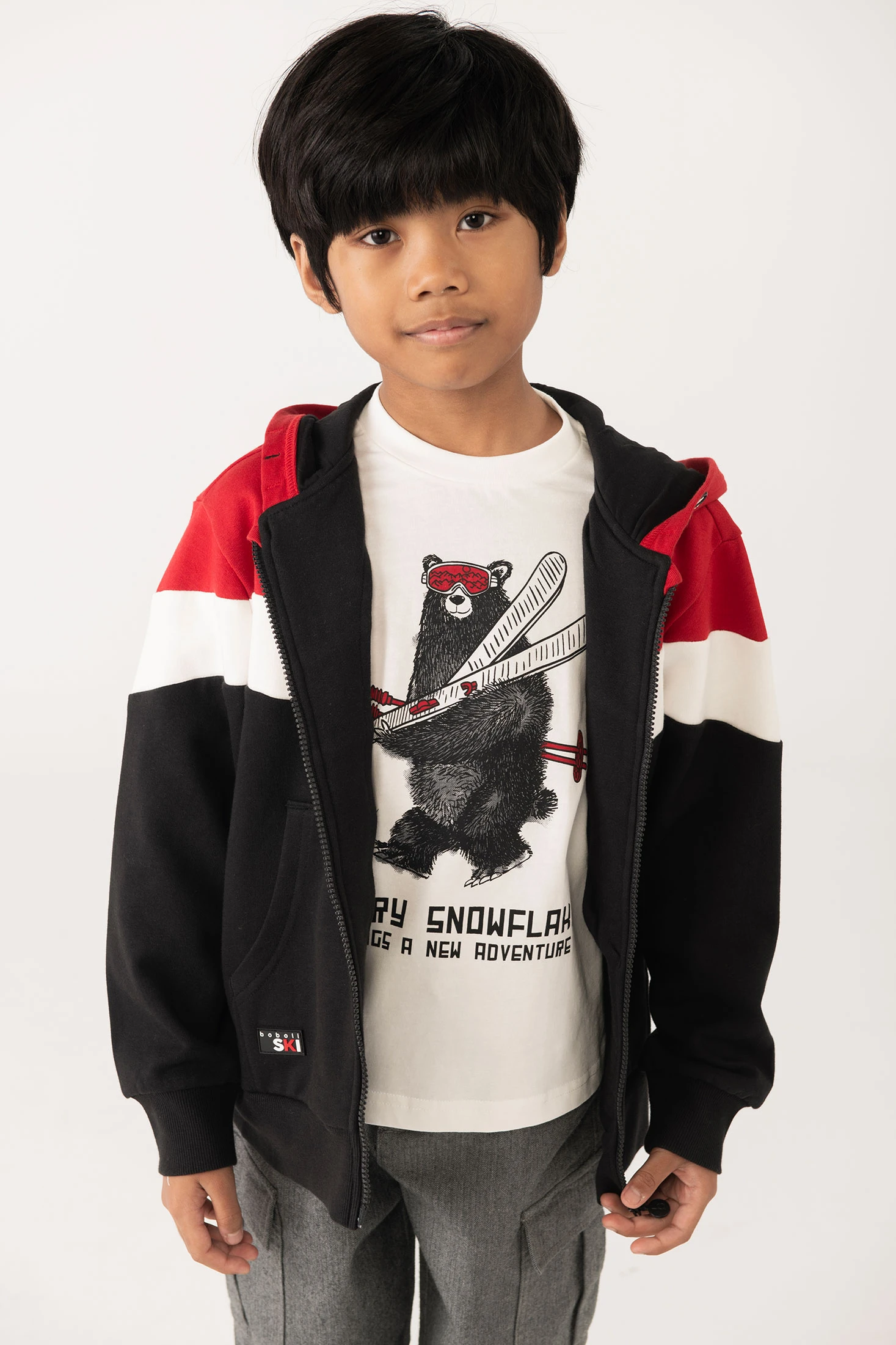 Boy´s jacket in black, red, and white fleece.