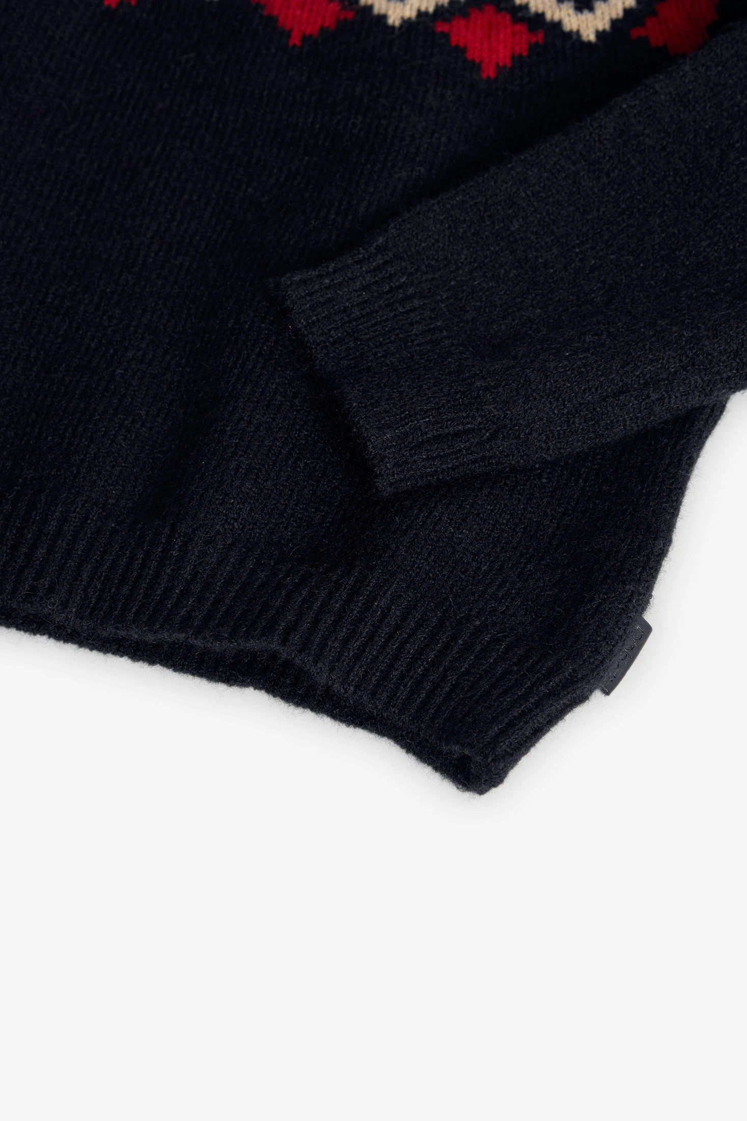 Knitted jumper for boys in black with geometric print, ideal for the autumn and winter seasons. A pattern of geometric shapes in red, white and cream tones stands out against the dark background. Crafted from a soft and warm fabric, it ensures maximum comfort on cold days. Its design features a round neck and long sleeves and is available in sizes ranging from 2 to 14 years. Perfect for pairing with casual trousers or jeans, incorporating a modern and stylish touch into the children's wardrobe.