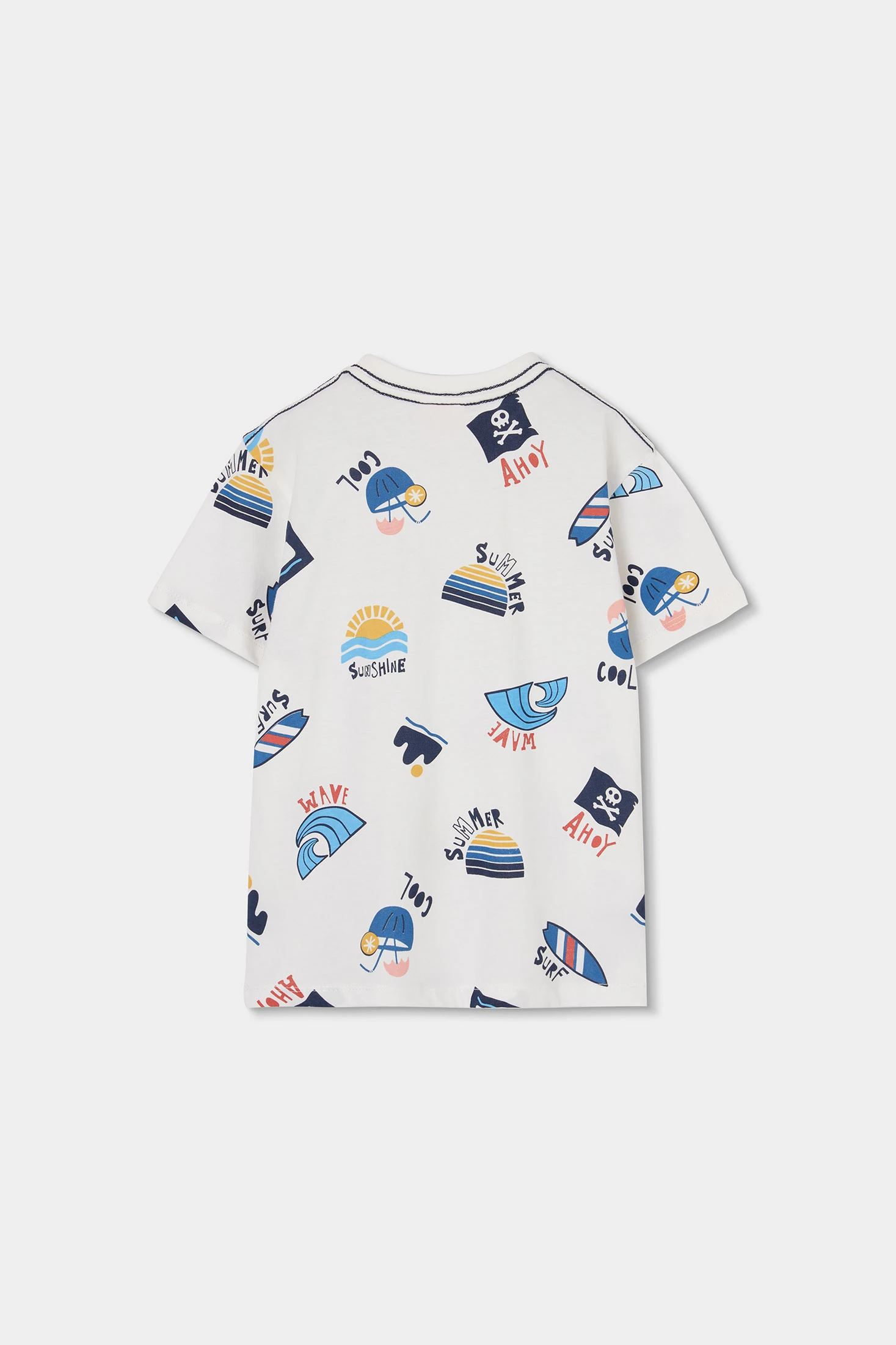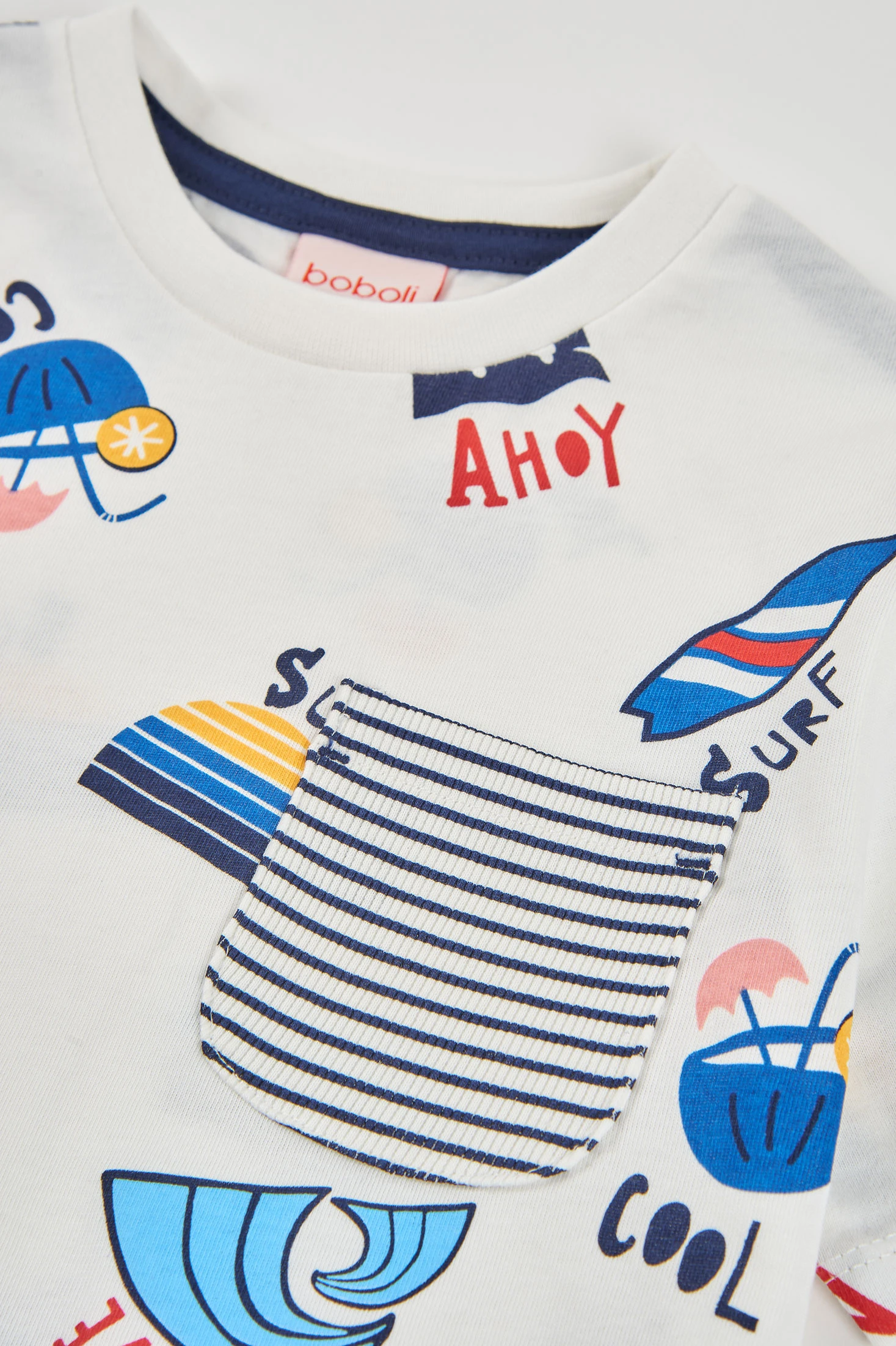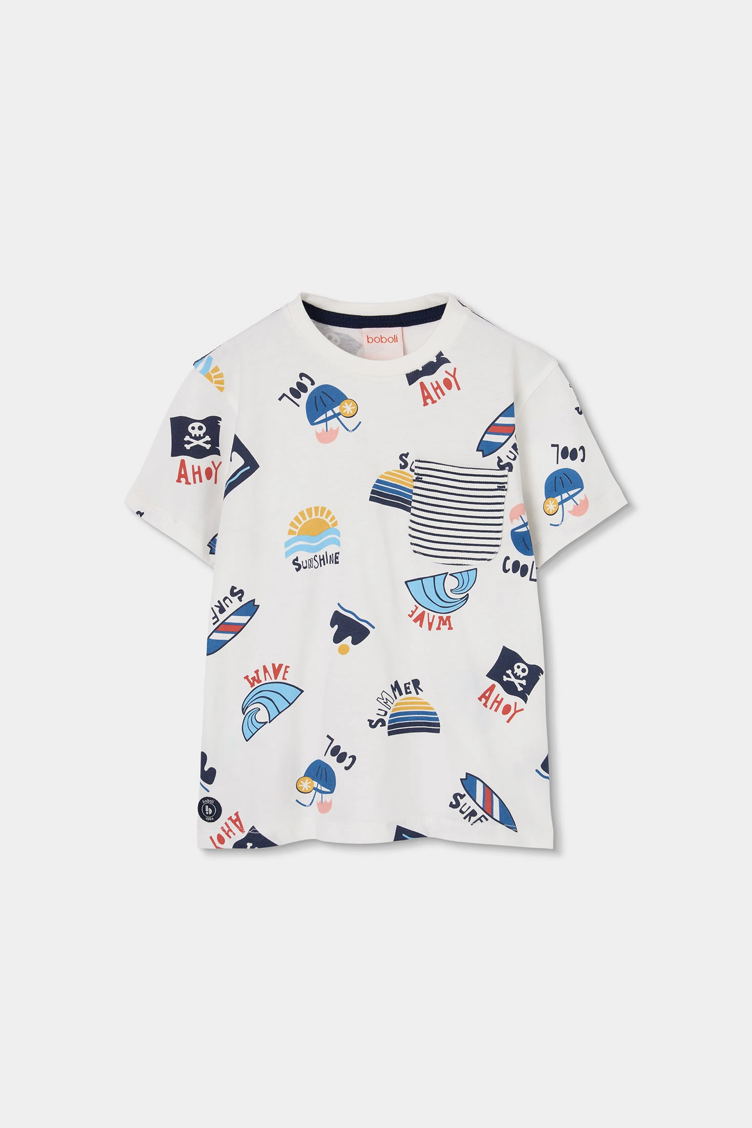 Cotton T-shirt for boys, perfect for the summer. Featuring a fun print in various colours. Its cotton fabric is soft and breathable, ideal for hot days. Available in sizes from 12 months to 10 years. With a practical front striped pocket and a comfortable fit, this T-shirt is perfect for casual and stylish combinations.
