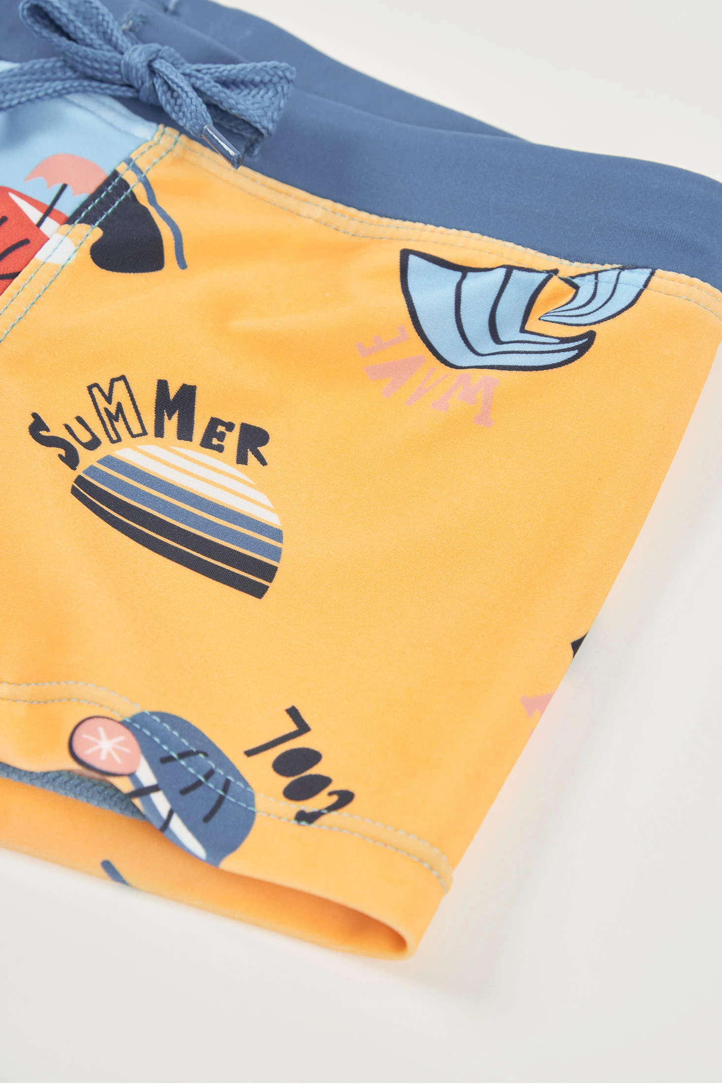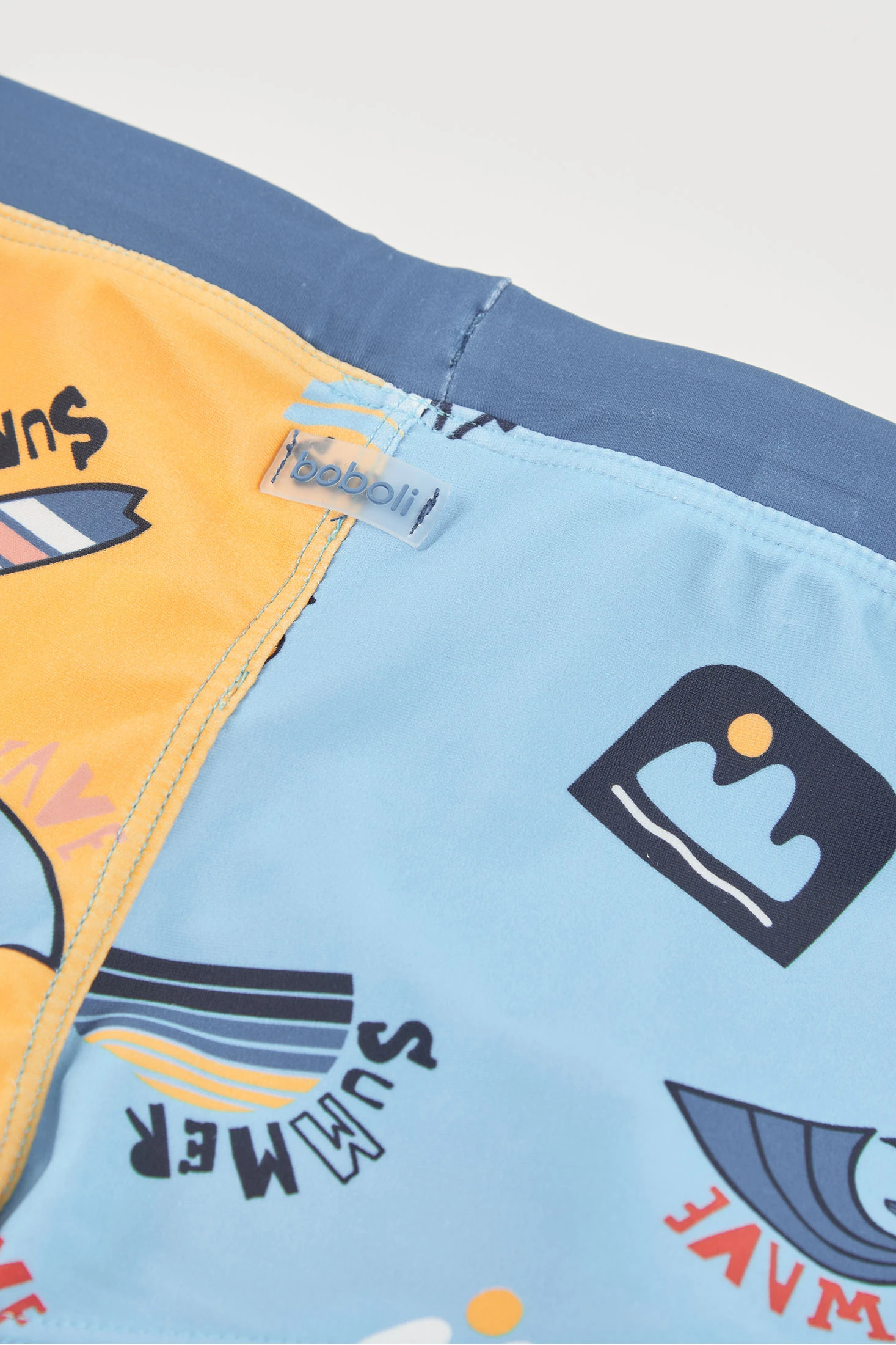Printed swimsuit for boys, ideal for enjoying the summer. It features a design in blue and yellow colours with fun prints including various shapes and letters, creating a cheerful and summery motif. Adjustable waistband with drawstring. Available in sizes from 12 months to 10 years. This swimsuit is a perfect choice to accompany the little ones during beach or pool days. Garment with UPF50 sun protection.