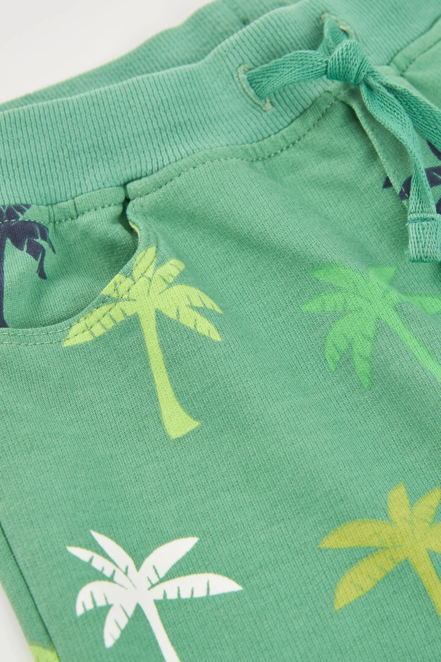 Terrycloth shorts for boys, ideal for the summer season. The soft and comfortable fabric provides freedom of movement. It features a design with colourful palm tree prints on a green background, adding a tropical and fun touch. The waist is elastic with an adjustable drawstring, ensuring a perfect fit. Available in sizes from 12 months to 10 years. A perfect garment to pair with casual T-shirts, ideal for a summery and relaxed look.