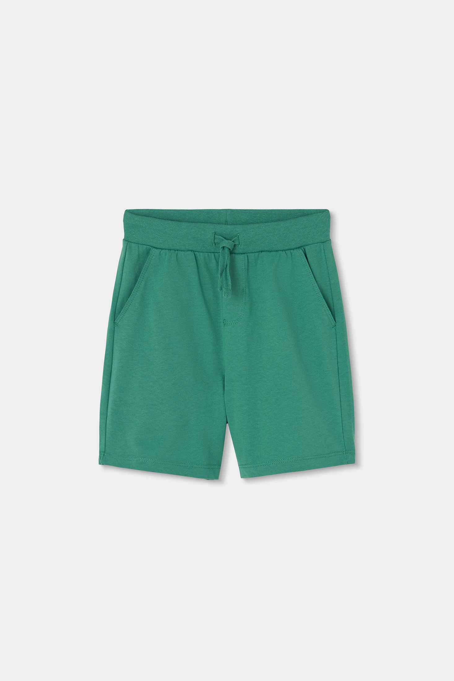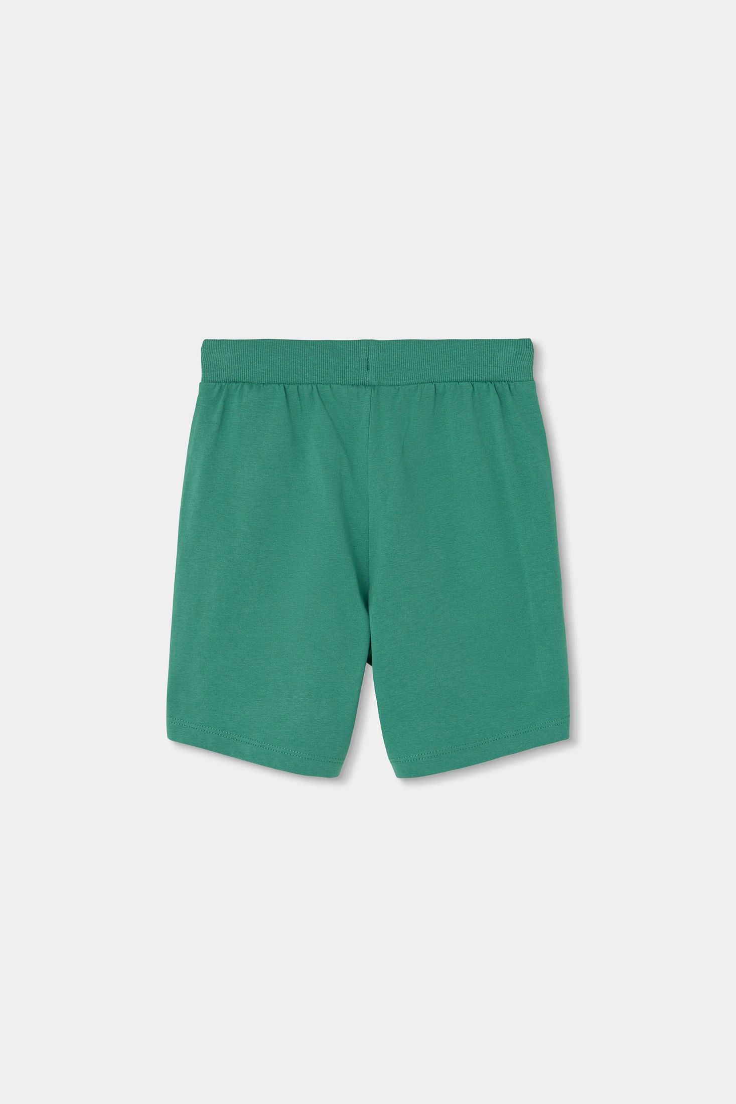 Set for boys that includes a short-sleeve t-shirt and shorts. The t-shirt has short sleeves in raw vigore colour with a large tropical and colourful print. The shorts are green with an elastic waistband and adjustable drawstring, ensuring a perfect fit. The knit fabric ensures comfort for exploring freely. Available in sizes from 12 months to 10 years, this set is ideal for warm days. Its cheerful design makes it perfect for outdoor activities and guarantees style and comfort during any adventure.