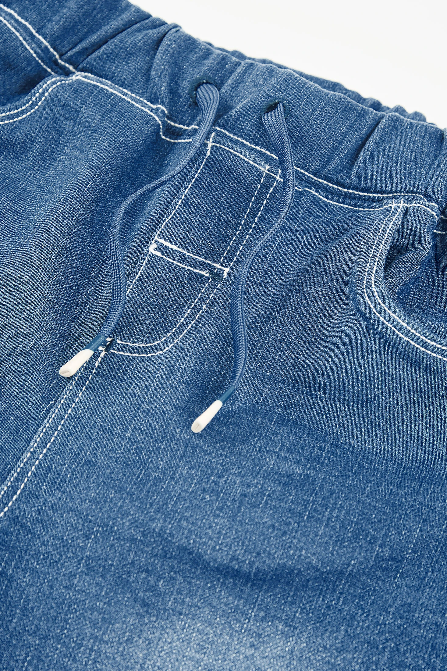 Blue denim trousers for boys, ideal for all seasons. Made from a durable material, they combine comfort and longevity. The design features an elastic waist with an adjustable drawstring, providing a comfortable and secure fit. Knee panels add a modern twist to the classic style. Available in sizes from 12 months to 10 years, accommodating the child's growth. Perfect for pairing with shirts and T-shirts, these trousers are a versatile choice for any casual occasion.
