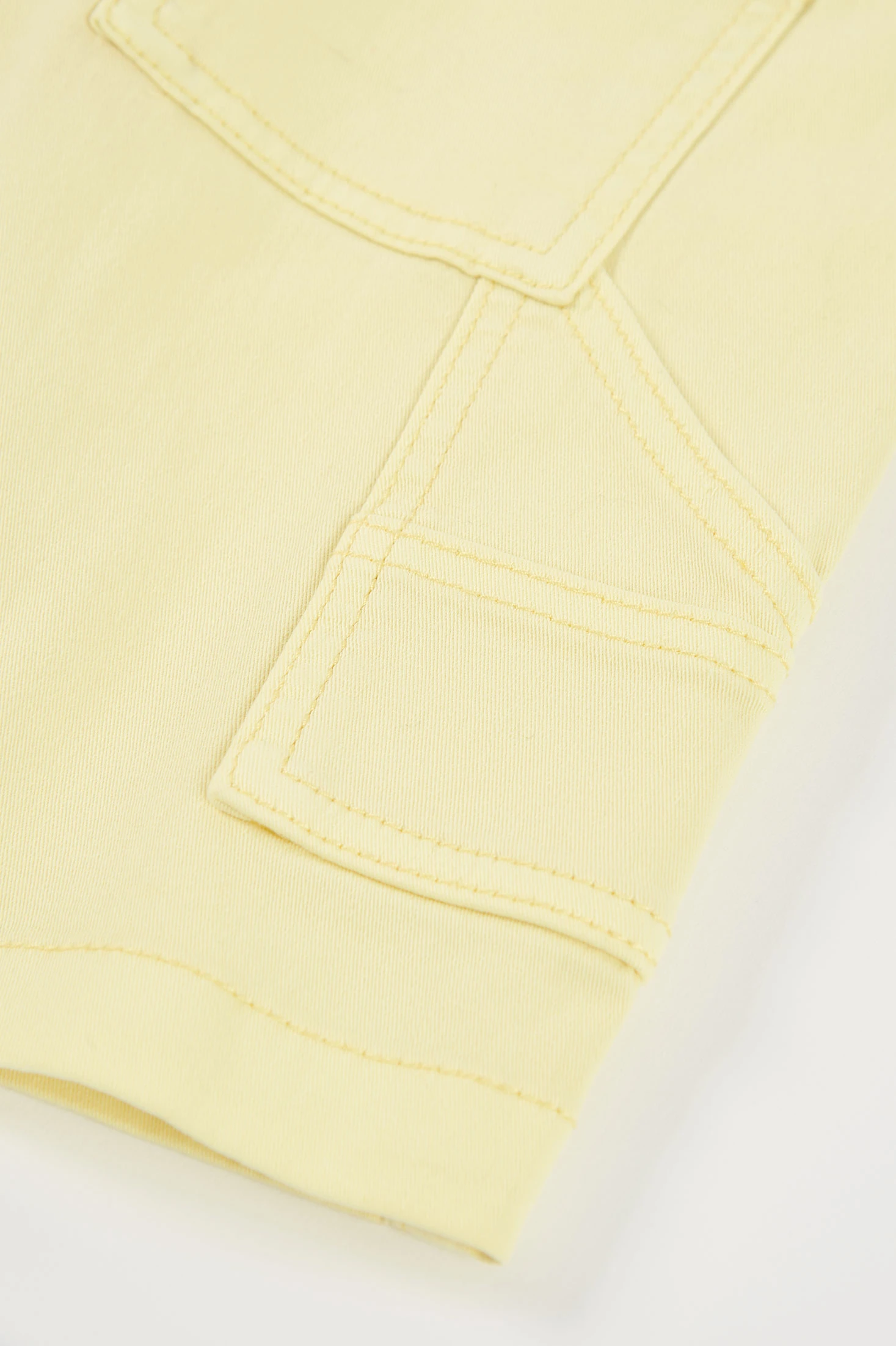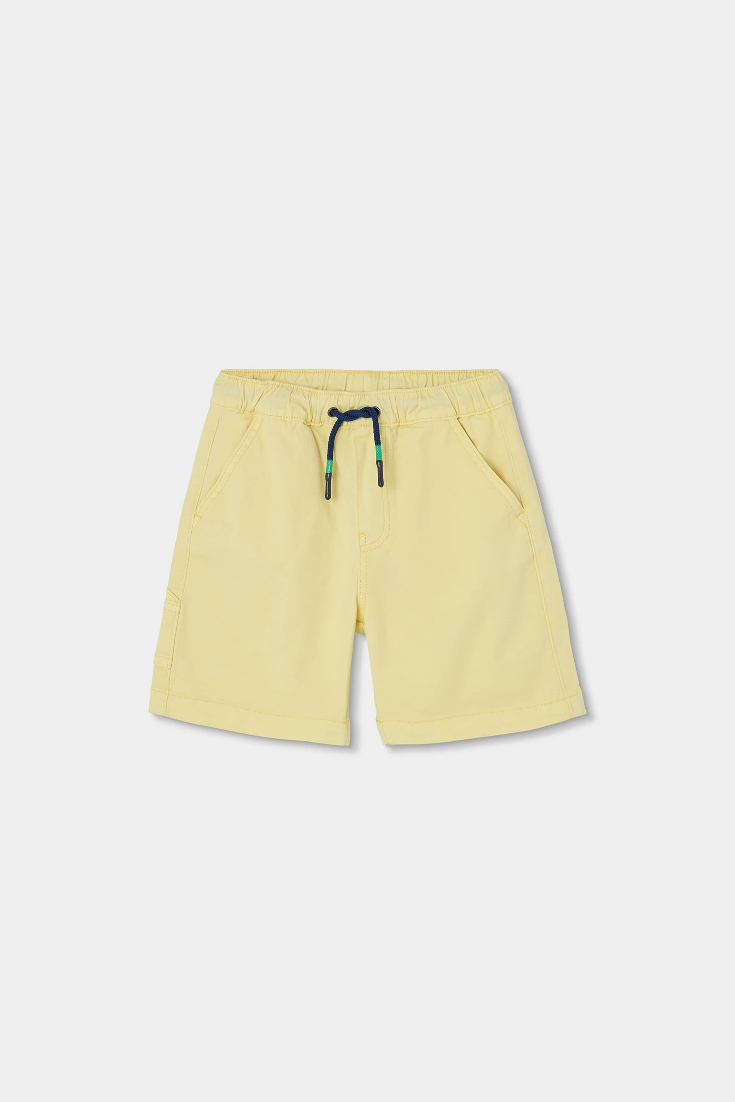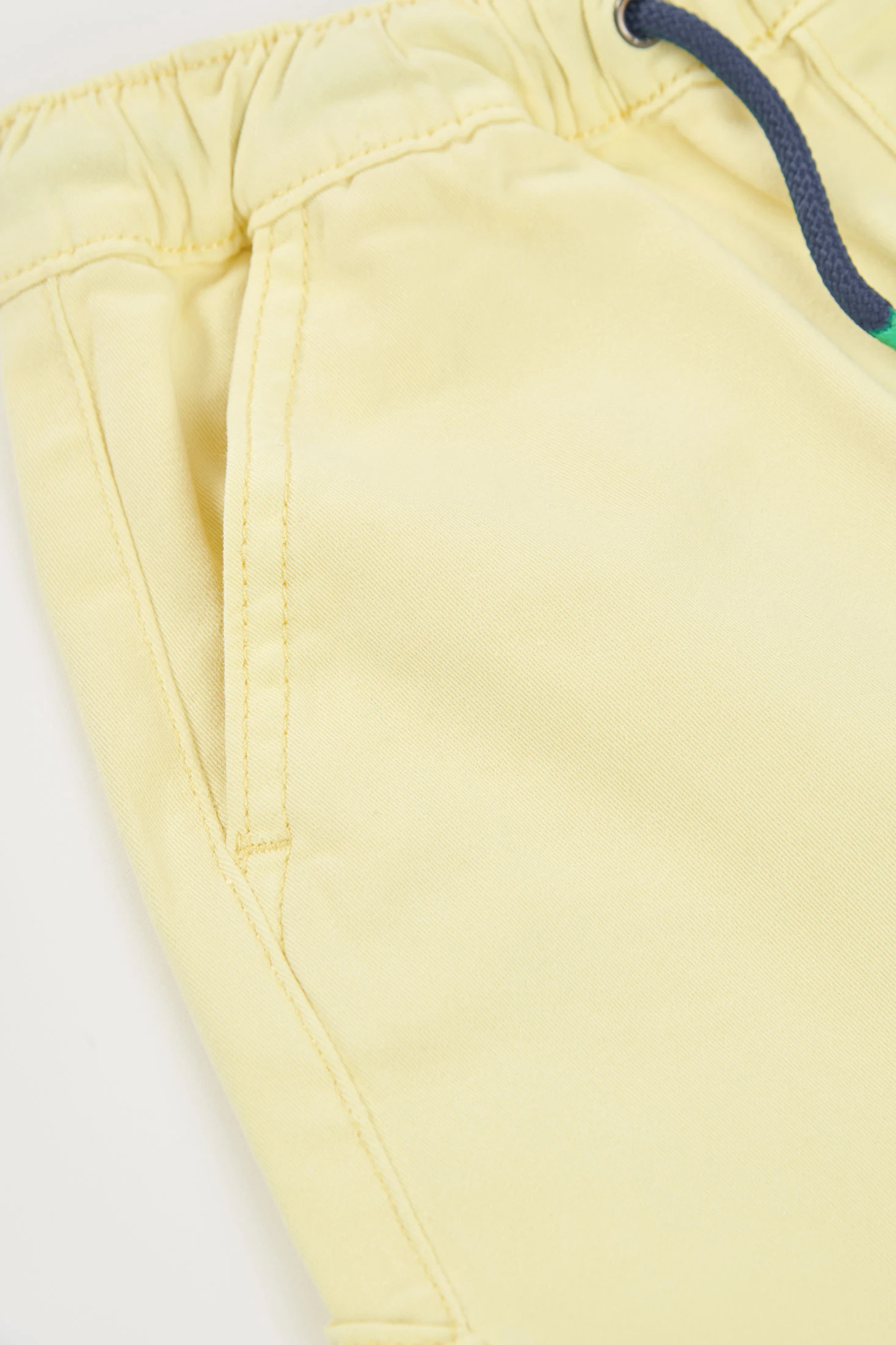 Bermuda shorts for boys, in a vibrant yellow colour, ideal for sunny days. Made from a lightweight and comfortable material, they feature an adjustable elastic waistband with a drawstring for a perfect fit. Practical for play and everyday movement. Available in sizes from 2 years to 14 years, they can be easily paired with neutral-coloured t-shirts for a casual summer look. Their functional design makes them suitable for any occasion.