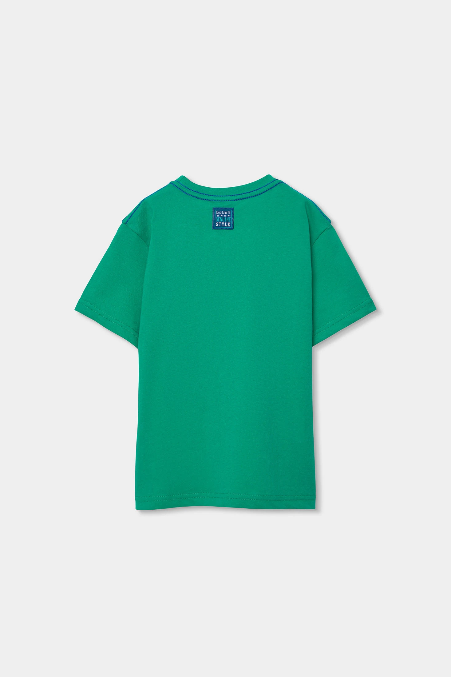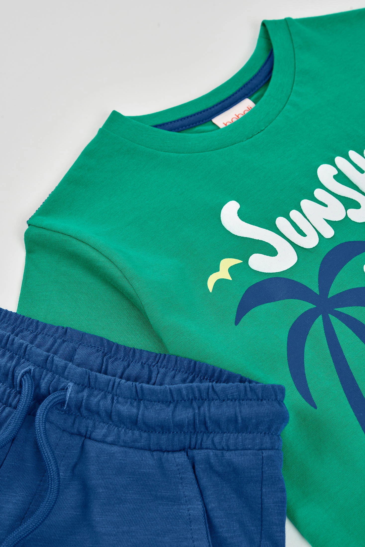 Blue T-shirt set for boys, perfect for summer. Crafted from cotton, it provides freshness and comfort. The T-shirt features a design with palm trees and waves, adding a fun and beachy touch. Available in sizes from 2 years to 14 years, this set is ideal for play and fun days. The short sleeves facilitate movement, and the vibrant colour makes it easy to pair with other casual styles for a relaxed and comfortable look.