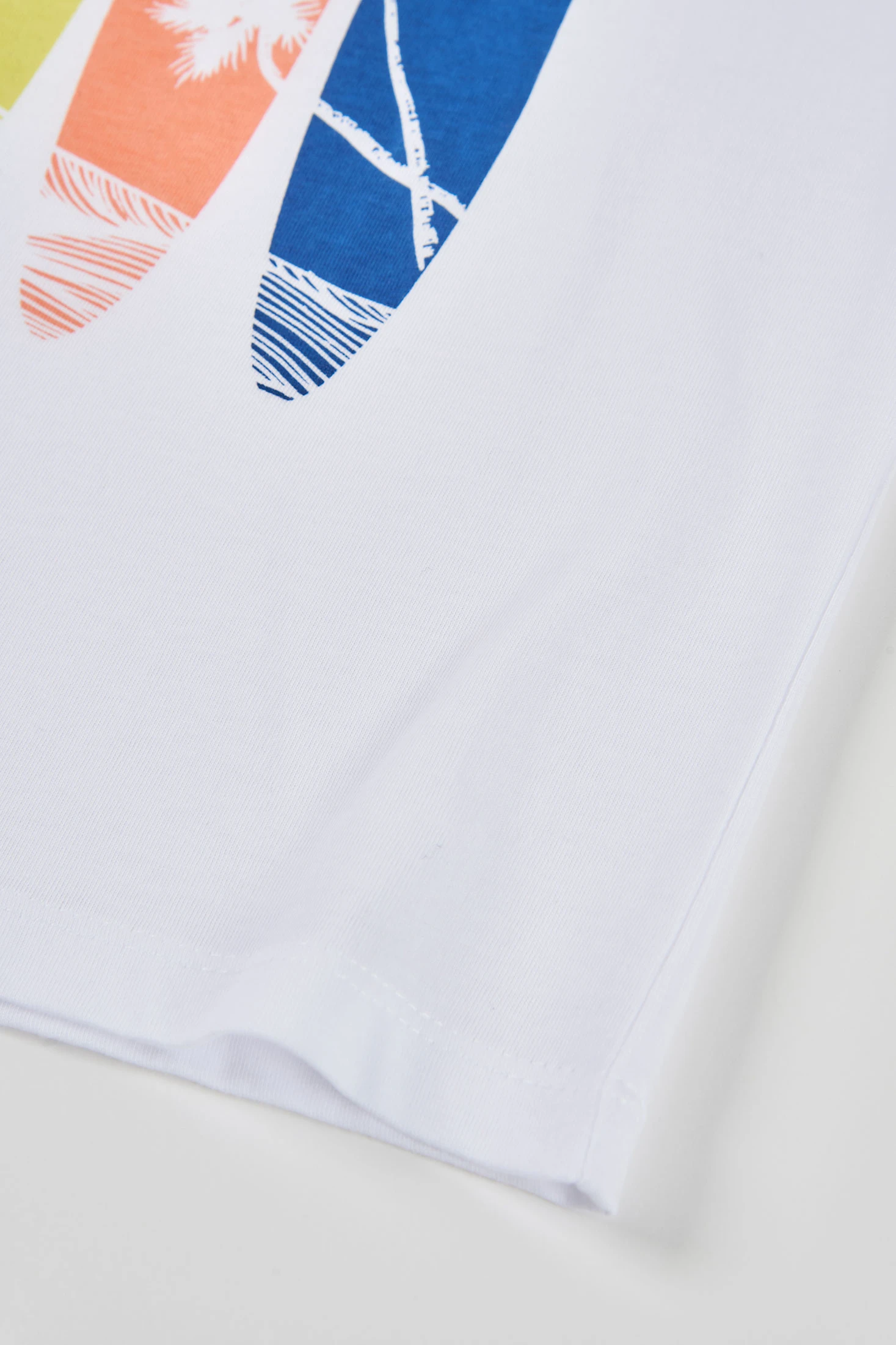 Sleeveless T-shirt for boys, crafted in white cotton, perfect for warm days. It features a colourful front design with letters and surfboards that add a fun and summery touch. It is soft and breathable, ideal for keeping comfort during playtime. Available in sizes from 2 years to 14 years. This T-shirt can be easily paired with shorts or jeans for a casual and fresh look.