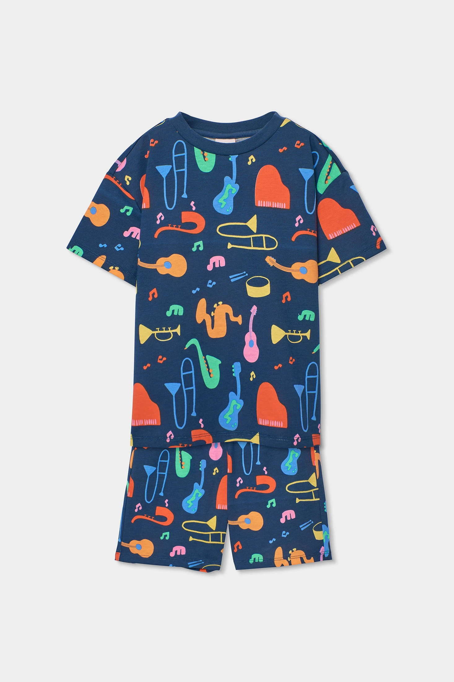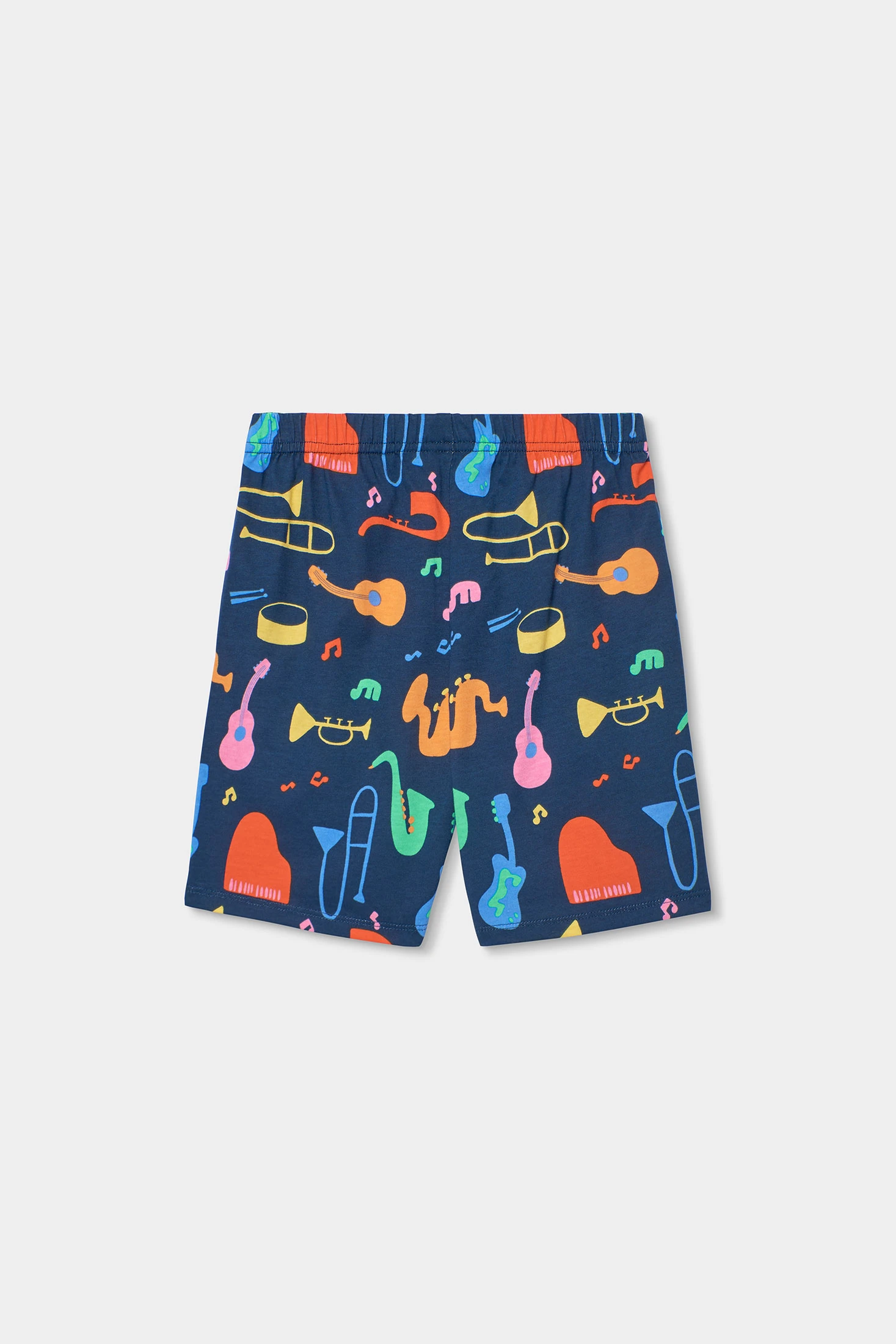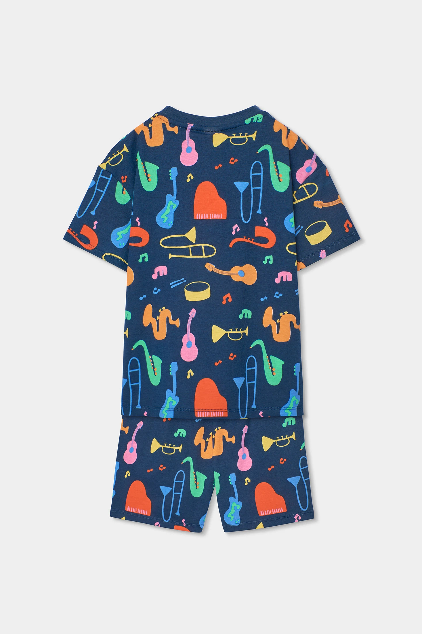 Printed knit pyjamas for boys, perfect for cosy nights. Made from a soft material that ensures comfort, it features a playful print of musical instruments in vibrant colours on a navy blue background. Available in sizes ranging from 2 to 14 years. The short-sleeved and short-pant design is perfect for daily wear and provides freedom of movement. A charming and practical option to keep the little ones comfortable and cool on warm nights.