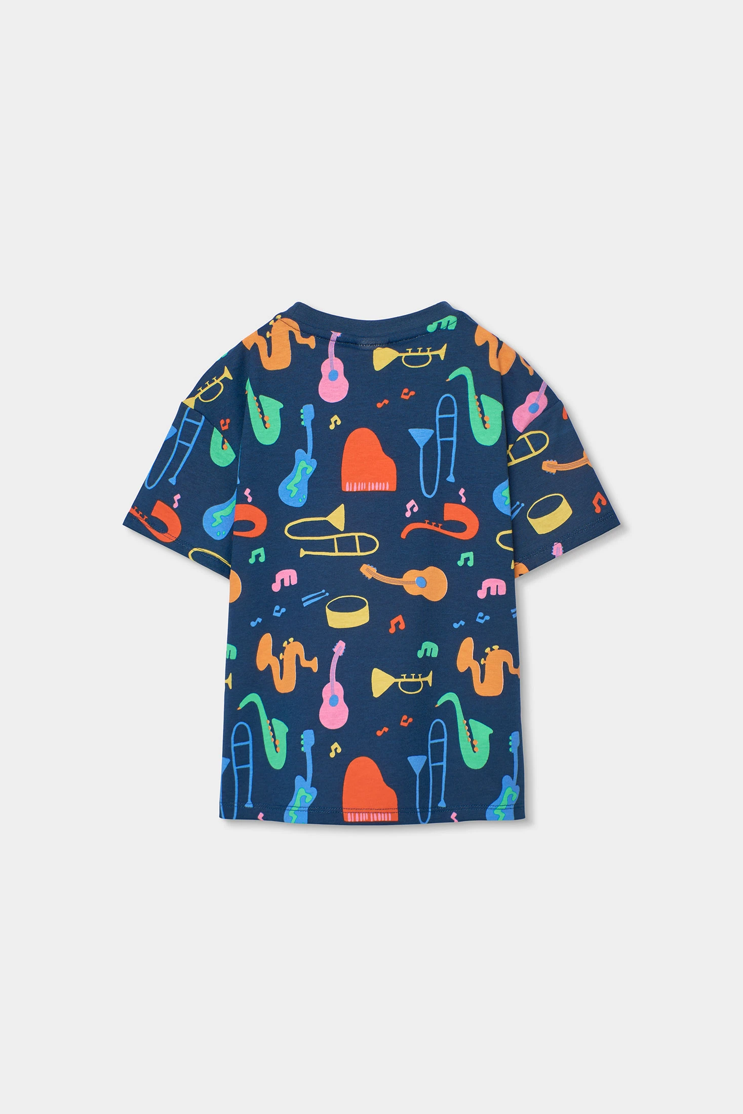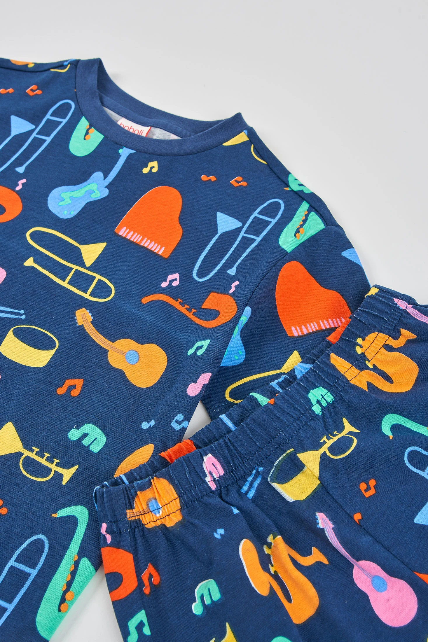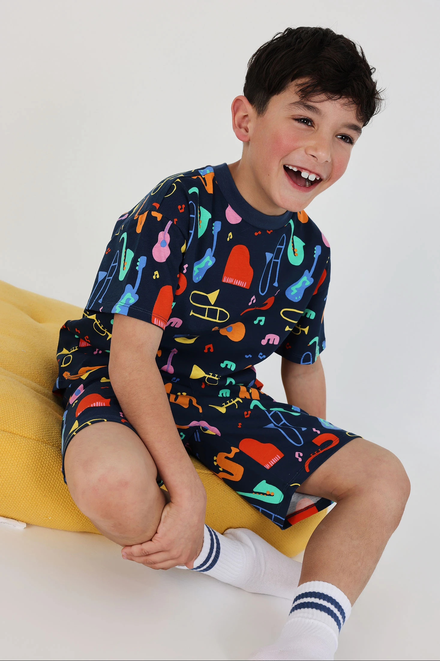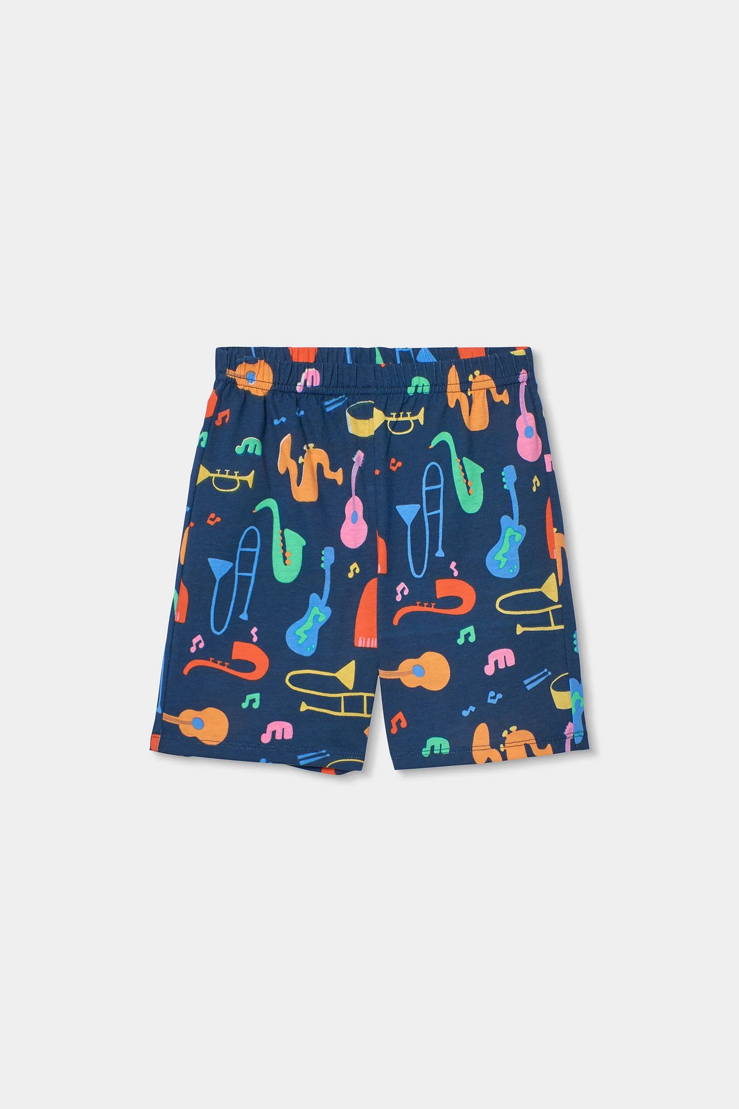 Printed knit pyjamas for boys, perfect for cosy nights. Made from a soft material that ensures comfort, it features a playful print of musical instruments in vibrant colours on a navy blue background. Available in sizes ranging from 2 to 14 years. The short-sleeved and short-pant design is perfect for daily wear and provides freedom of movement. A charming and practical option to keep the little ones comfortable and cool on warm nights.