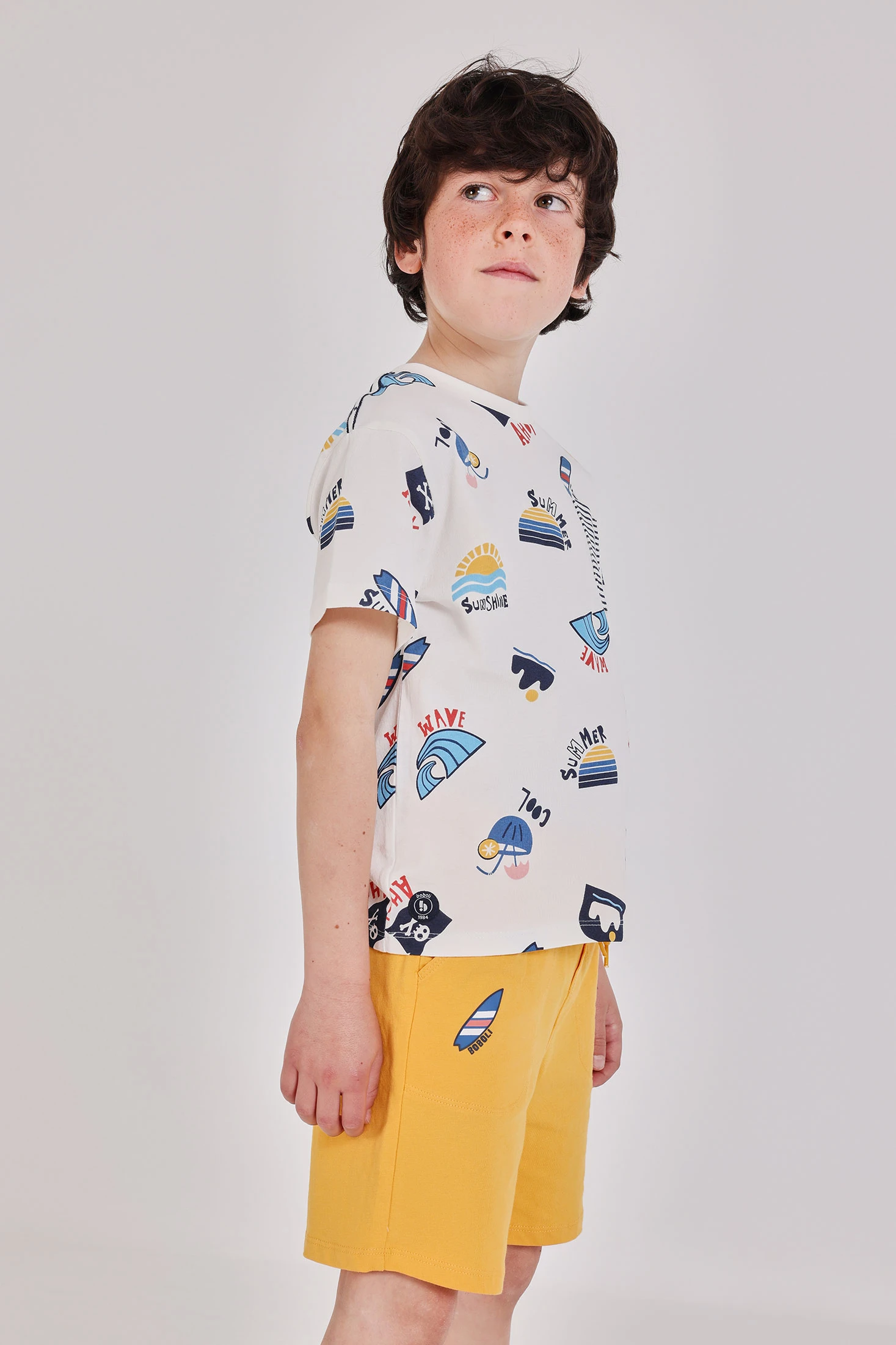 Yellow knitted shorts for children, ideal for the spring and summer seasons. Crafted from soft and comfortable fabric, they feature a simple design with details of a motif reminiscent of a surfboard. The elastic waistband with adjustable drawstring ensures a comfortable fit. Available in sizes from 12 months to 14 years, they are perfect for outdoor activities. The vibrant colour adds a cheerful touch to any outfit, perfectly pairing with light t-shirts for a casual and laid-back style.