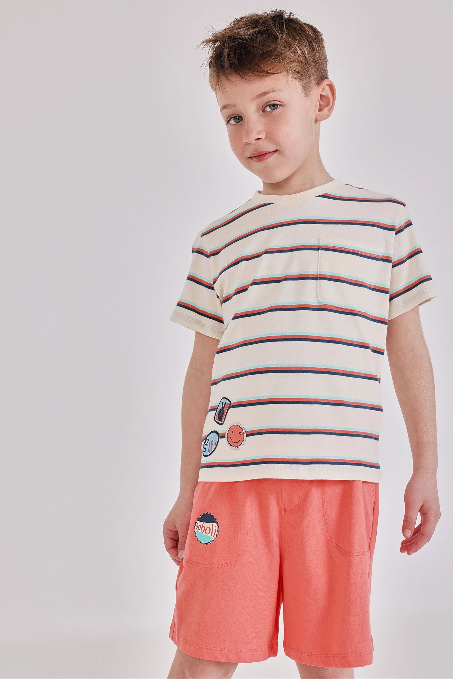 Cotton shorts for boys, in a vibrant orange colour, ideal for summer. Soft and comfortable, they ensure freedom of movement during play. They feature a practical adjustable drawstring at the waist. The design includes a small graphic detail that adds a touch of fun. Available in sizes from 12 months to 14 years, accommodating different stages of growth. Perfect for pairing with casual t-shirts, providing a fresh and modern look for sunny days.