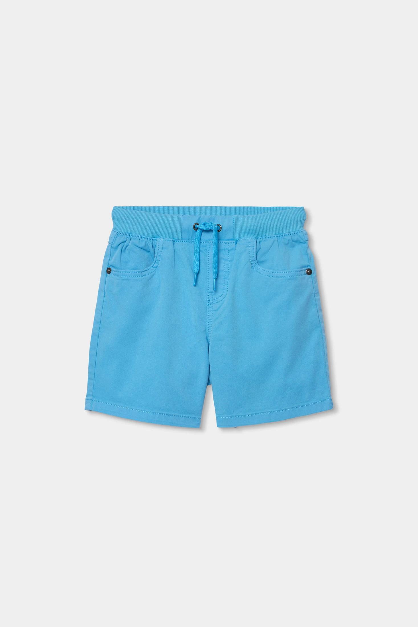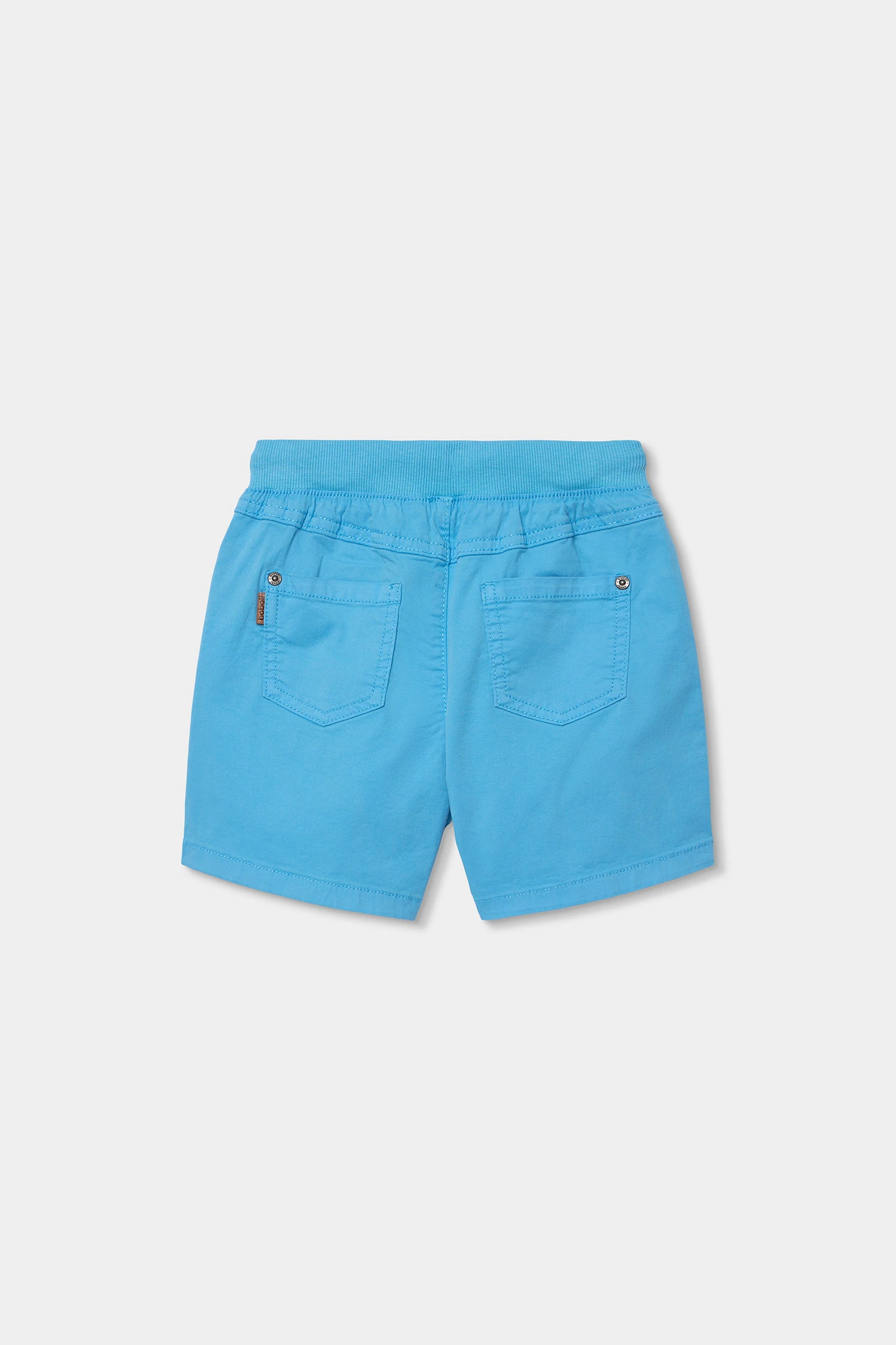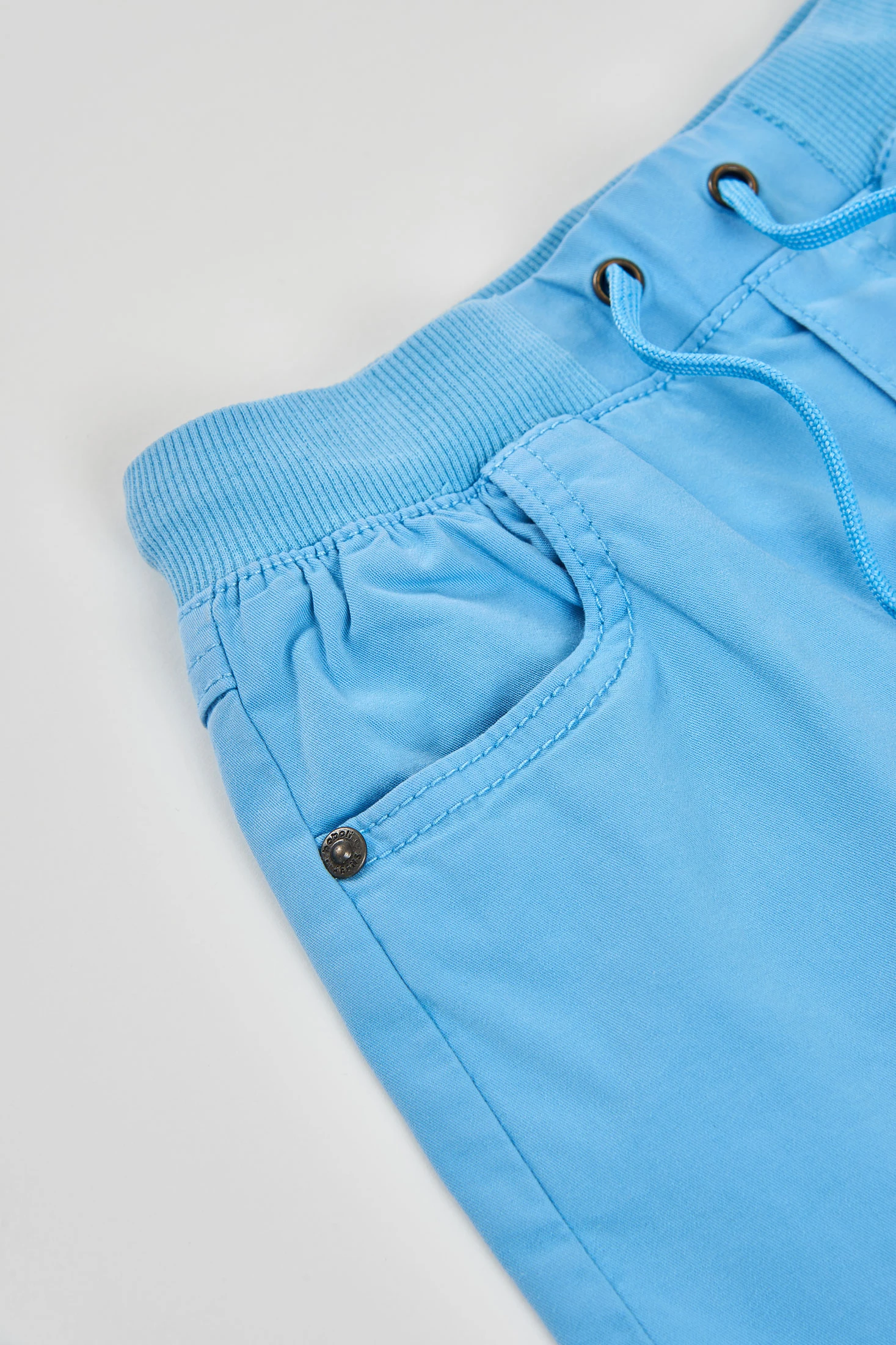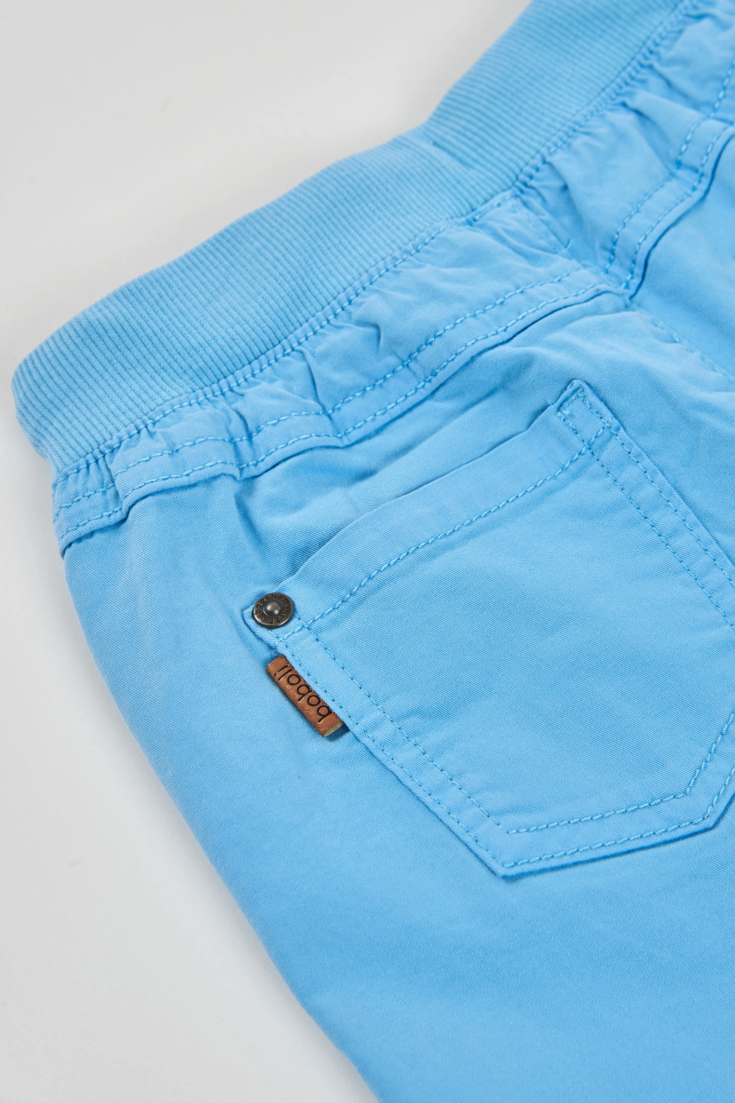 Elastic gabardine bermuda shorts in blue for children, perfect for summer, offering a lightweight fabric that allows for optimal ventilation, ideal for outdoor play. The design includes an elastic waistband with an adjustable drawstring, providing comfort and ease when dressing. Available in sizes from 12 months to 14 years, accommodating various growth stages. Their bright blue colour allows them to be paired with neutral-toned or vibrant patterned T-shirts for a fresh and modern style. Suitable for various occasions, they are a versatile and functional choice.