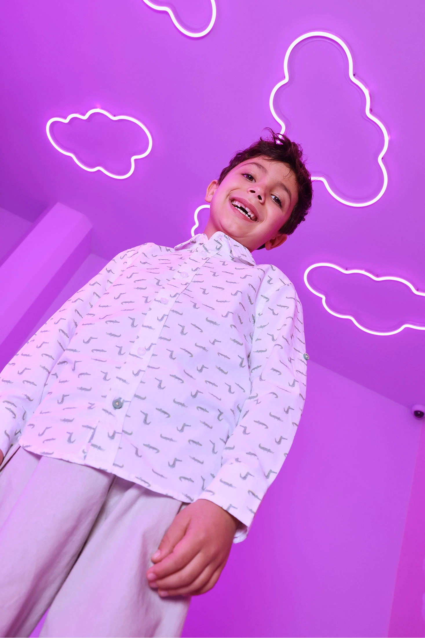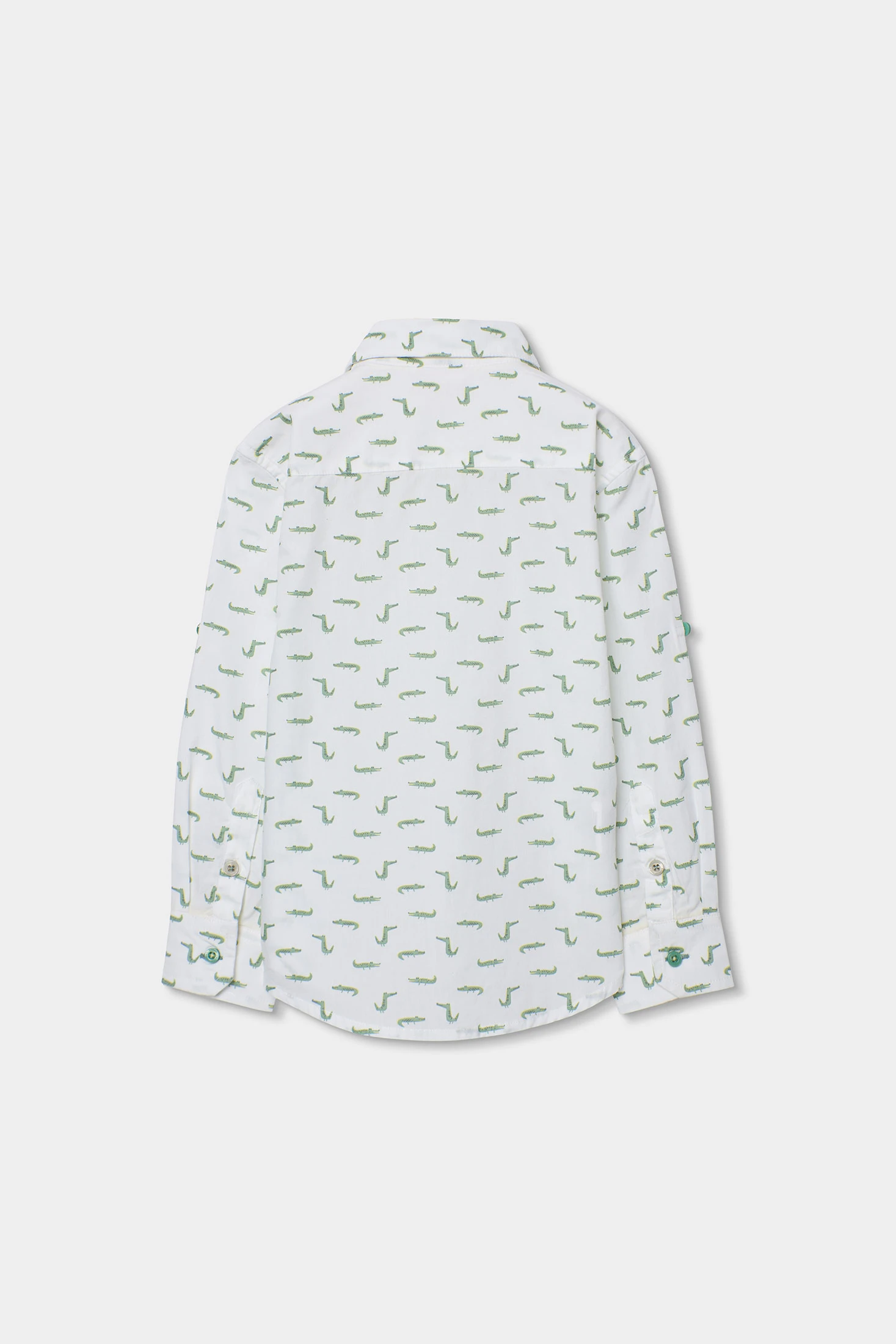 Poplin shirt for boys, perfect for any occasion. Made from a soft and lightweight material, it features a fun print of small animals in green on a white background. The design includes a classic collar and long sleeves, ideal for an elegant and comfortable look. Available in sizes from 12 months to 10 years, this shirt pairs well with both casual and formal trousers for a versatile style. It is a must-have item for any stylish boy?s wardrobe.