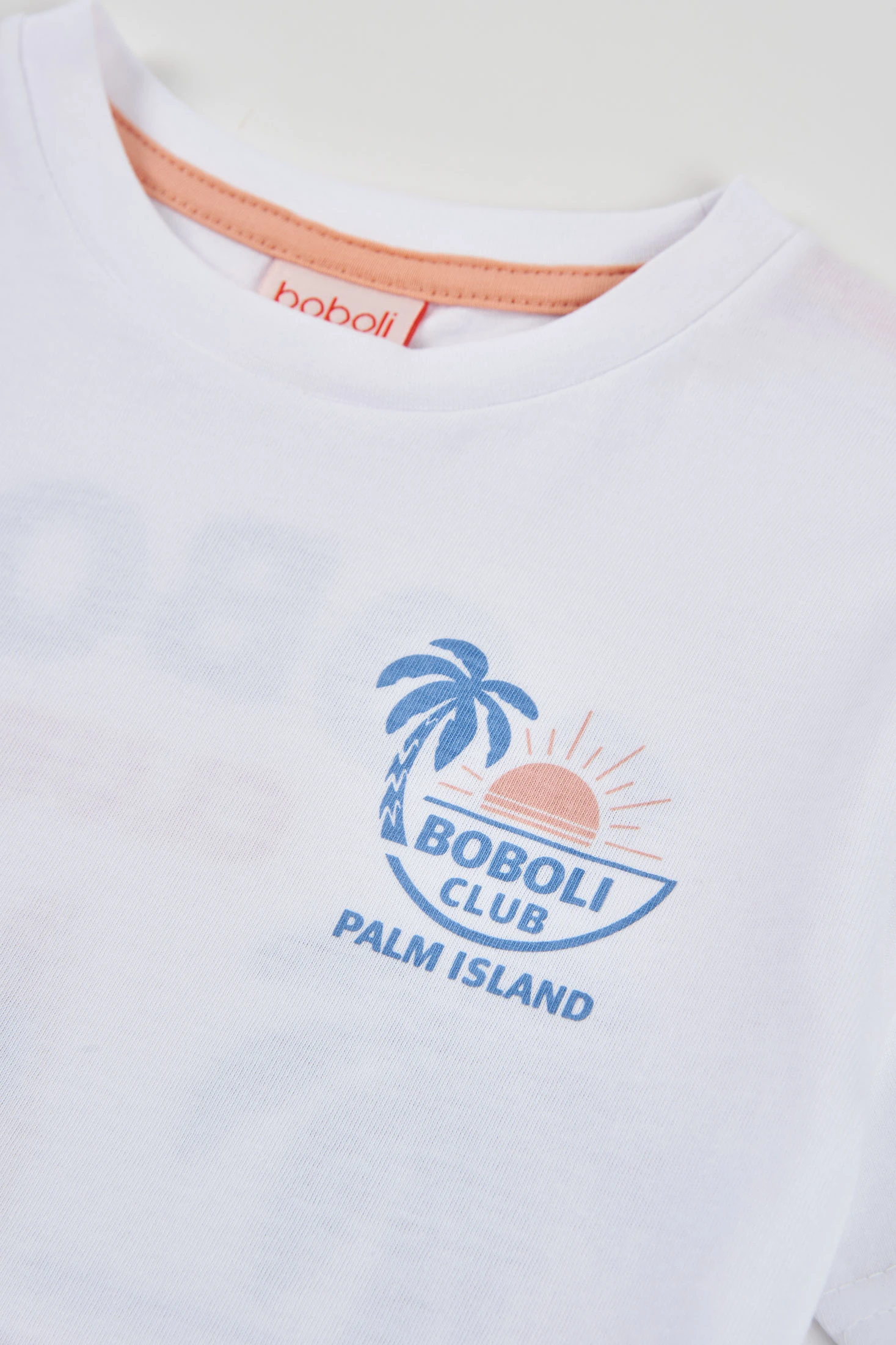 White cotton T-shirt for boys, essential for daily wear, crafted from soft and comfortable material, perfect for maintaining freshness and freedom of movement. The design features a subtle print with elements that could be palm trees and text. Available in sizes from 12 months to 10 years, suitable for various ages. Round neck and short sleeves make it ideal for pairing with casual trousers or colourful shorts, adding a fresh and modern touch to a child?s wardrobe.