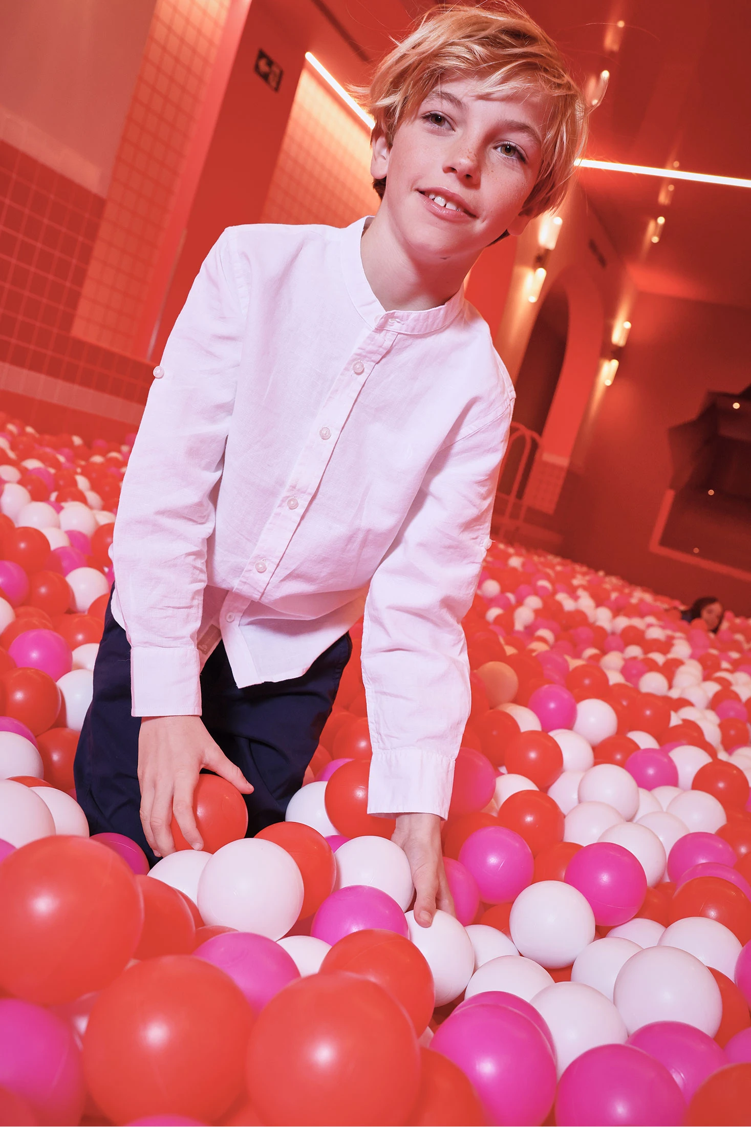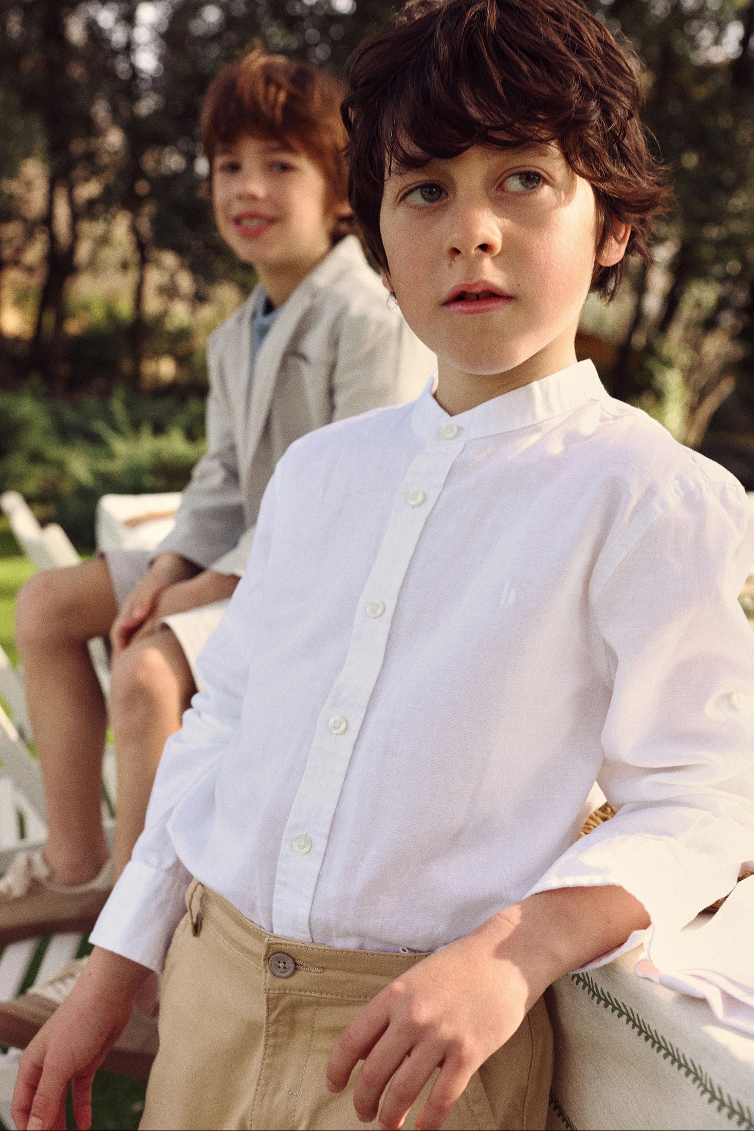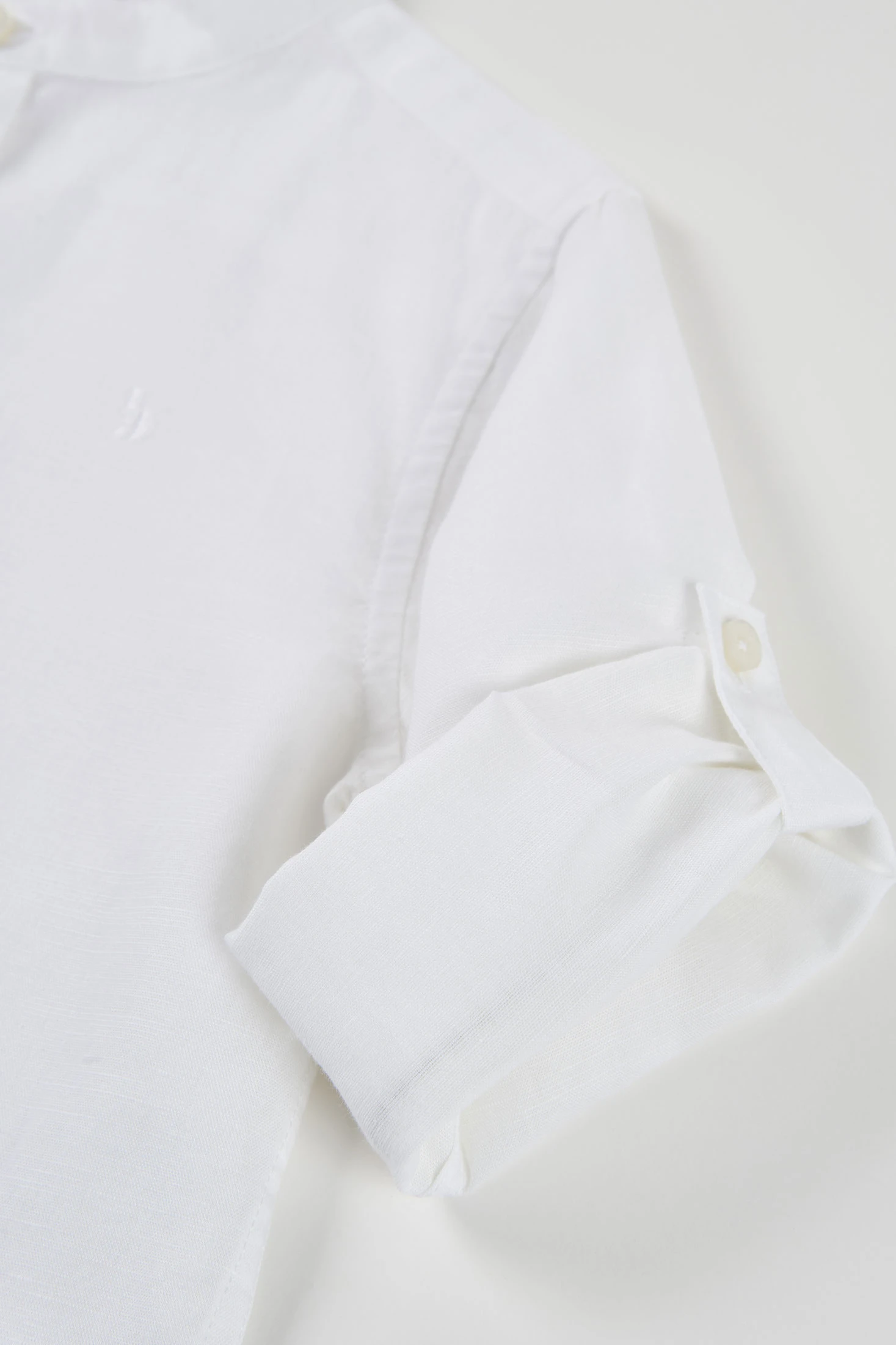 White linen shirt for boys, perfect for an elegant and fresh style. Made from lightweight material, it ensures comfort in warm climates. Featuring a long sleeve design and a button closure for easy use. The classic collar adds a sophisticated touch. Available in sizes from 12 months to 14 years, it is ideal to accommodate the child?s growth. Its white colour makes it extremely versatile to pair with trousers of various styles, creating both formal and casual looks.