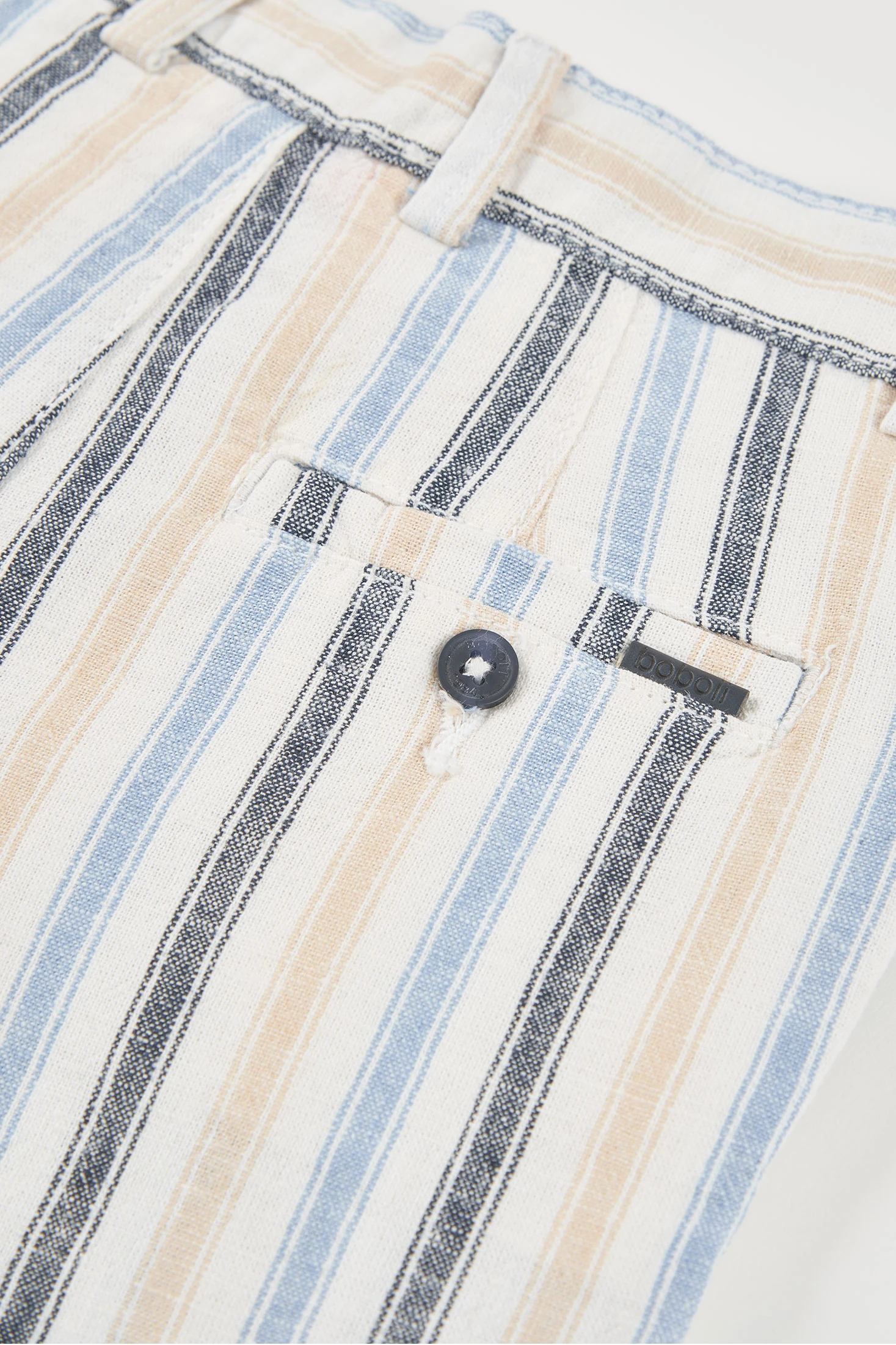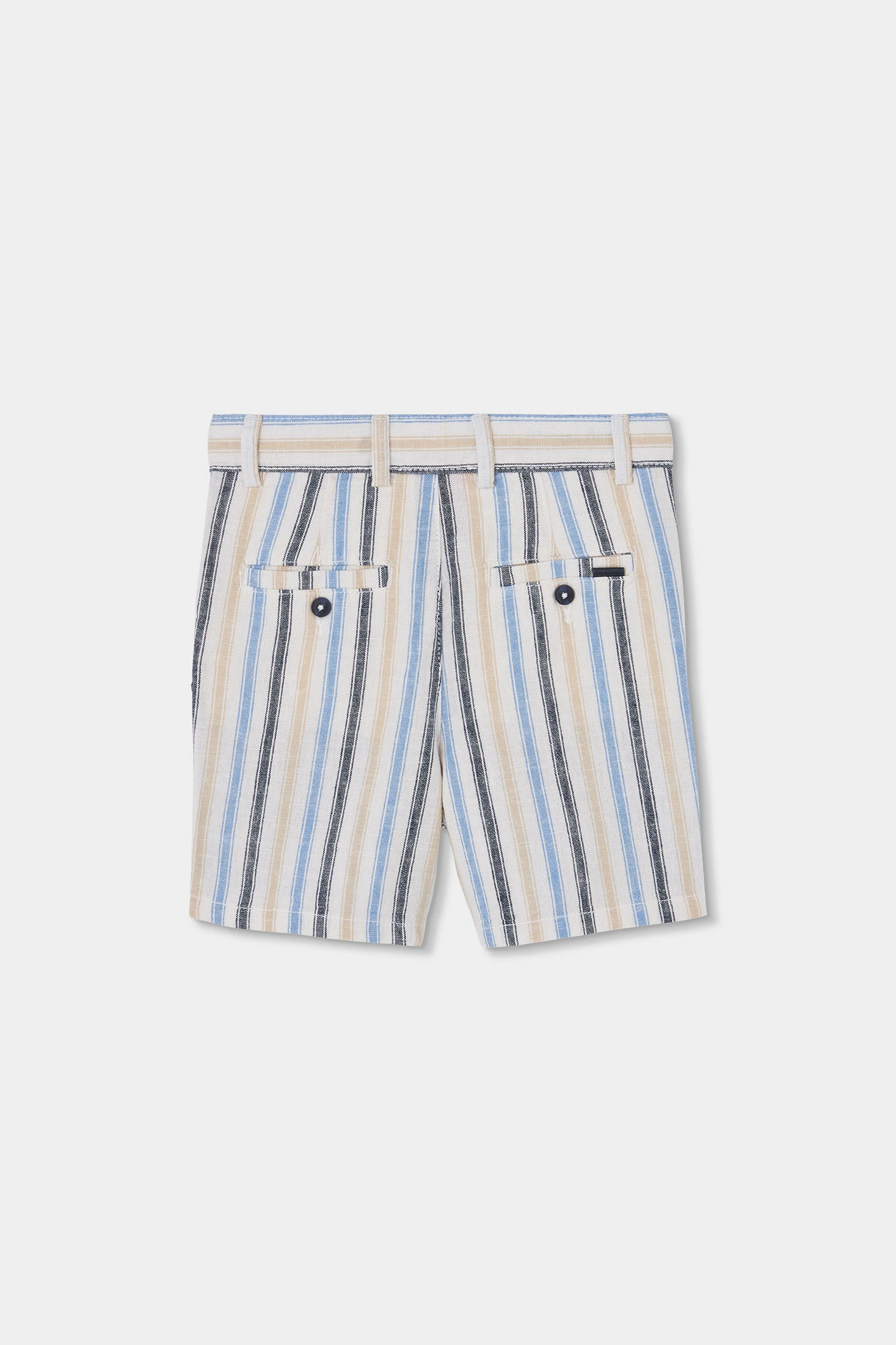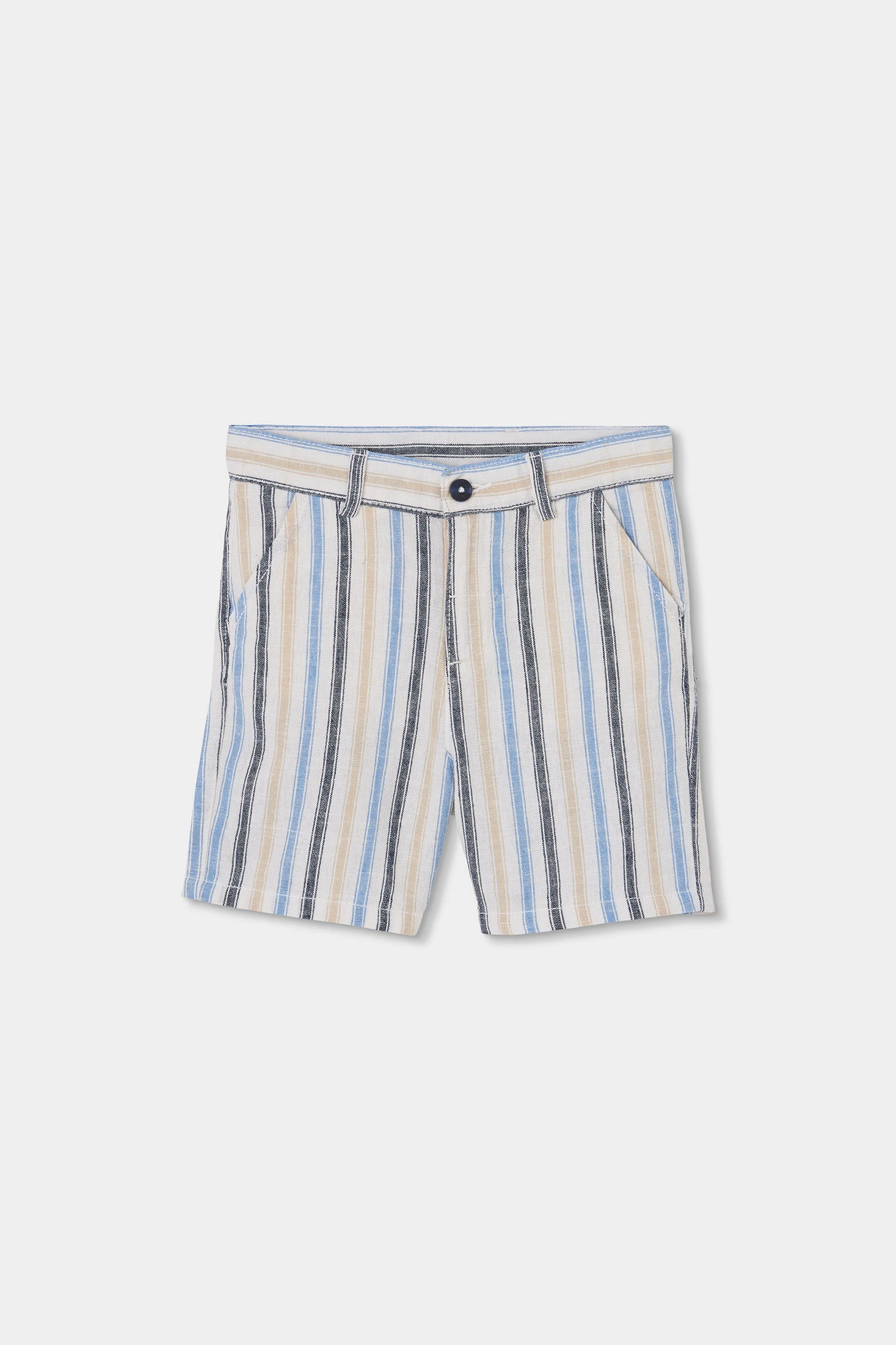 Linen Bermuda shorts featuring a multicoloured stripe design in shades of blue, beige and brown, ideal for adding a cheerful touch to children's wardrobe. Crafted from linen, it is lightweight and breathable, perfect for warm days. Available in sizes from 12 months to 14 years, it adapts to children's growth. Button closure and belt loops add functionality. Pair it with basic t-shirts for a casual and fresh look for daily outings or informal events.