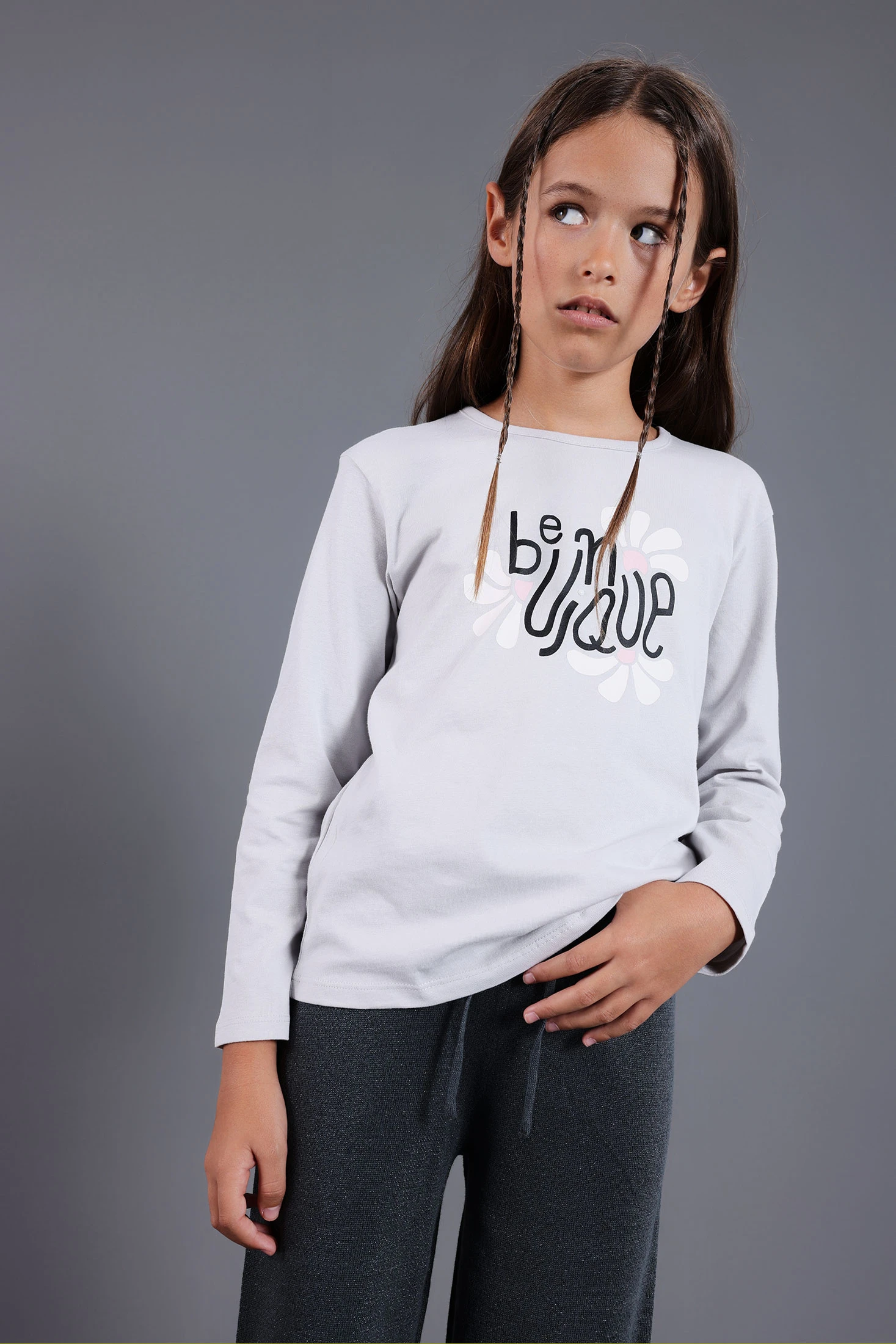 Grey knitted T-shirt for girls that stands out for its floral print, ideal for autumn and winter seasons. Made from a soft and stretchy fabric, it offers comfort and freedom of movement for everyday wear. Its design includes a round neck and long sleeves, making it perfect for keeping warm on chilly days. Available in sizes from 2 to 14 years, this versatile garment easily pairs with trousers or skirts, adding a feminine and modern touch to your daughter's wardrobe.