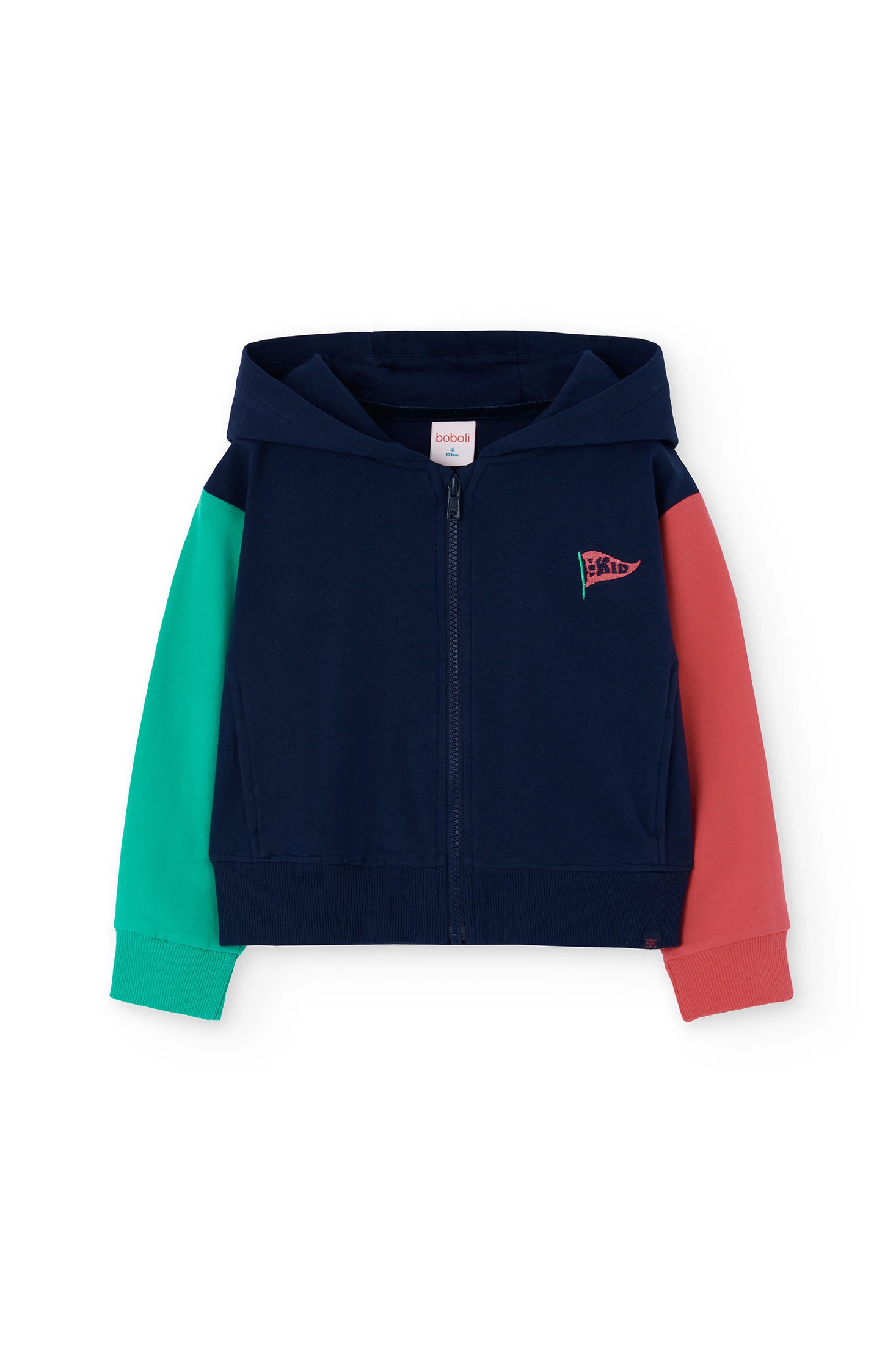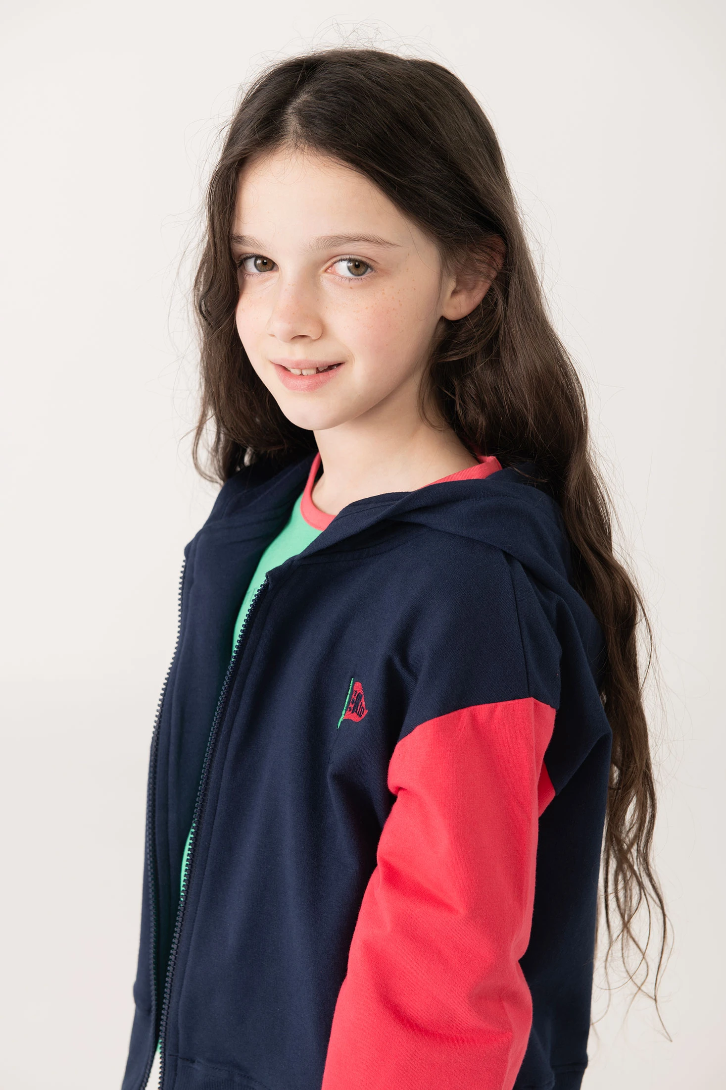 Navy blue fleece jacket for girls, ideal for the autumn and winter seasons, offering warmth and comfort with its soft fabric. It features a hooded collar and long sleeves, perfect for keeping out the chill on cooler days. The embroidery of a flag stands out on the chest, adding a modern and distinctive touch to the design. Available in sizes 2 to 14, its versatile style makes it easy to pair with trousers or jeans, perfect for daily wear and casual outings.