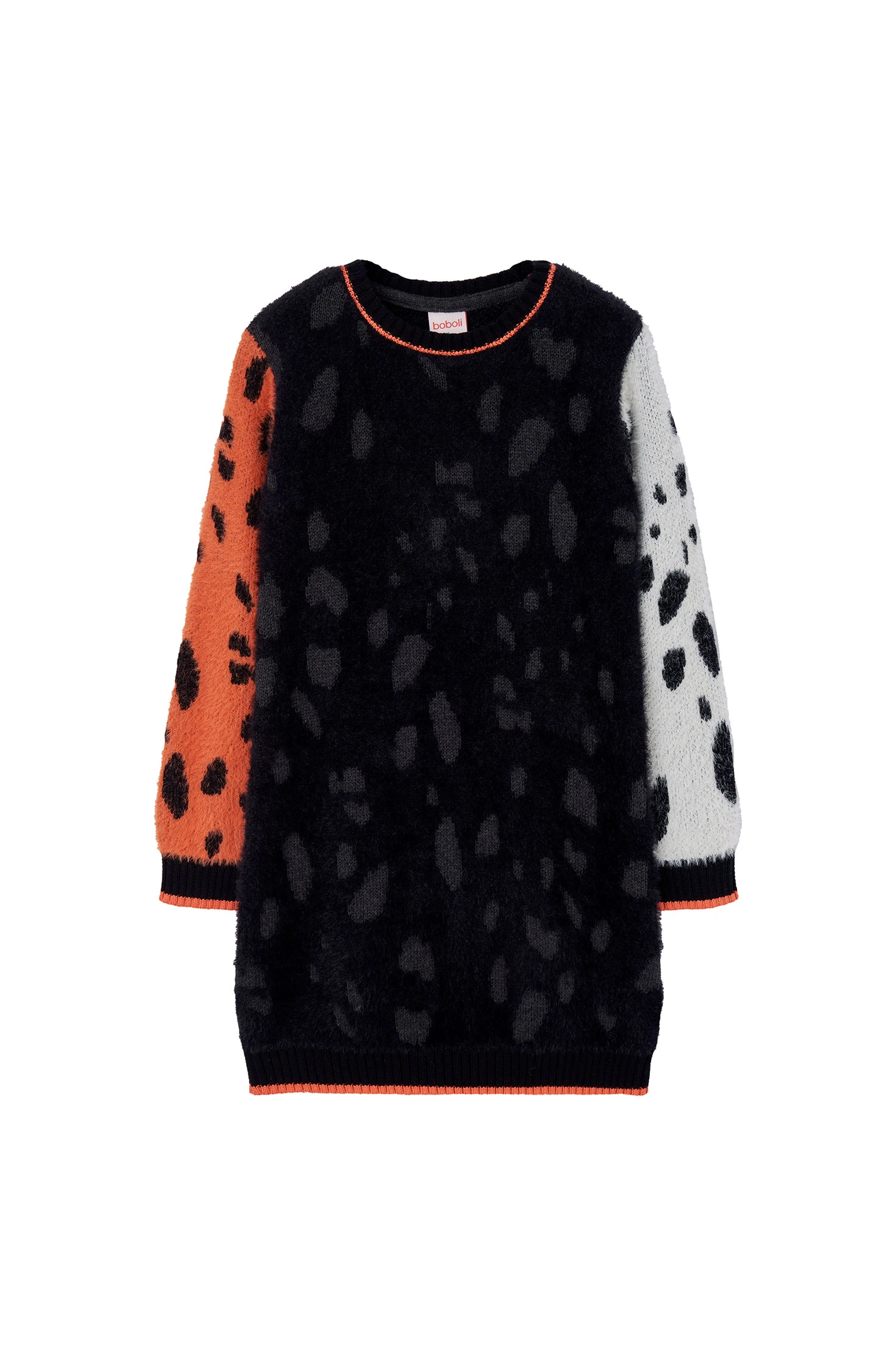 Black dress for girls with sleeves of a different colour, perfect for the autumn and winter seasons. Made from a soft knit fabric, it provides comfort and style on cooler days. It can be easily paired with colourful tights and boots to achieve a chic and cosy look. Available in sizes from 2 to 14 years, this dress is ideal for any occasion, from family events to casual outings. Its classic and timeless design makes it a must-have in a child's wardrobe.