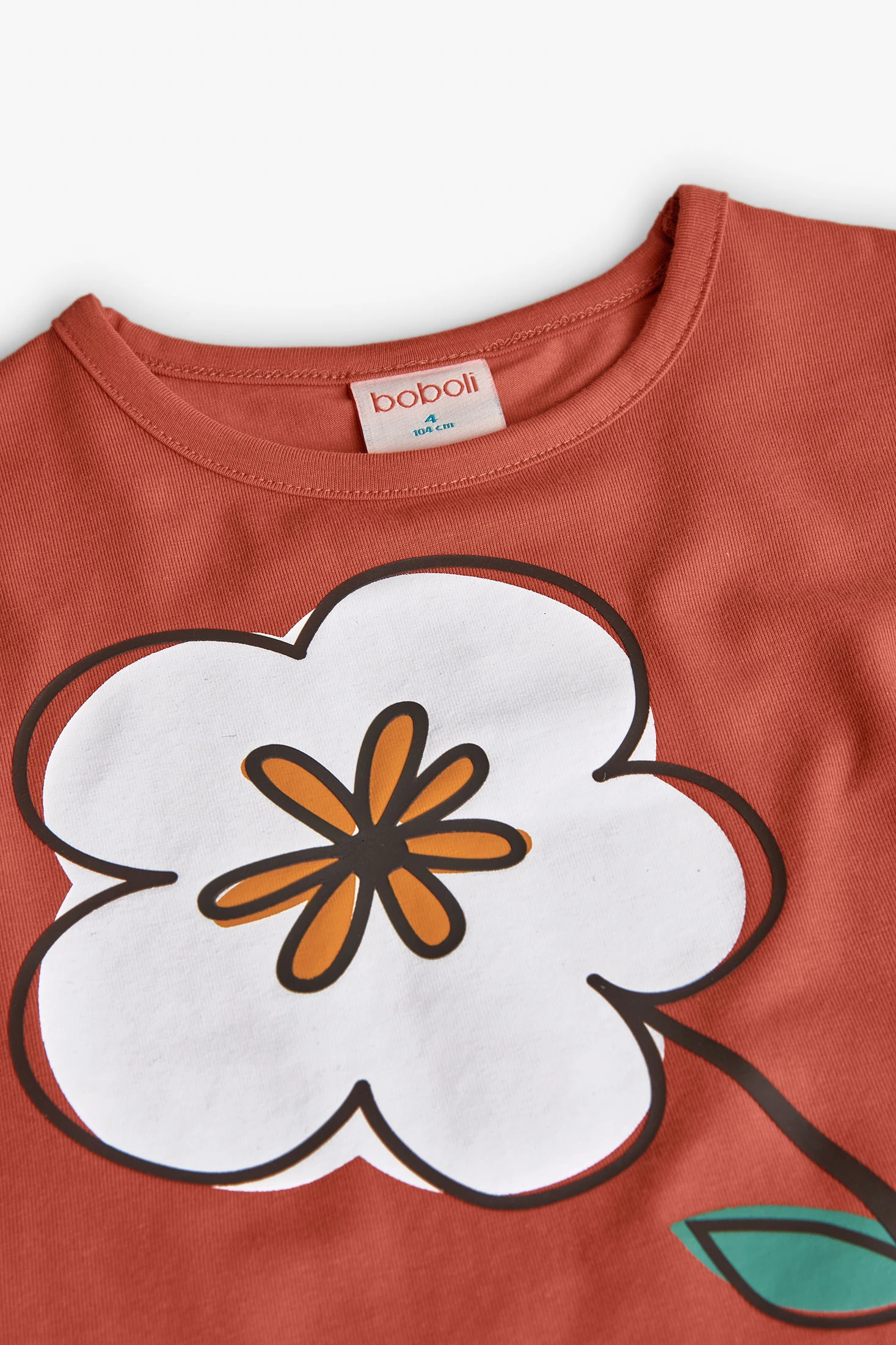 Orange girl's T-shirt, made from soft knit fabric, features a charming floral print that adds a touch of cheerfulness. Perfect for the autumn season, it has long sleeves and a round neckline, providing lightness and style. Available in sizes from 2 to 14 years, it is an ideal garment to pair with trousers or leggings, creating a fresh and fun look for any occasion.
