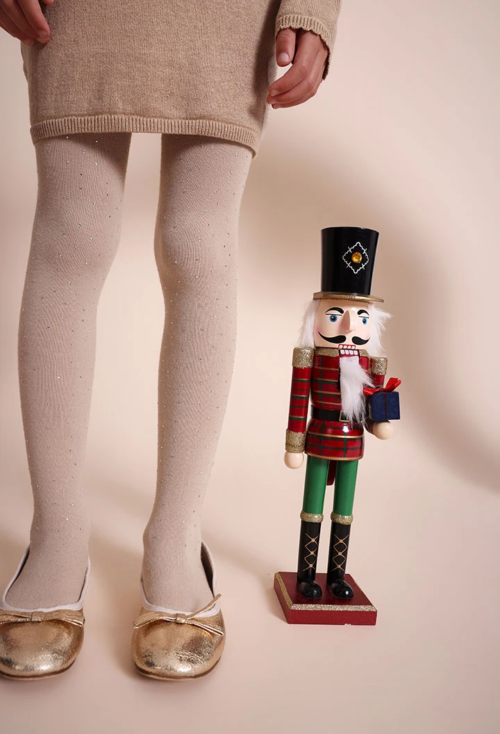 Soft knit tights, ideal for girls, elegantly designed to provide warmth during cold seasons. Crafted in beige embellished with delicate crystals, they stand out for their refined style. The elastic and breathable material ensures comfort throughout the day, while their versatility allows for easy pairing with dresses or skirts to create both casual and special looks. Available in sizes ranging from 12 months to 10 years, they are the perfect choice to enrich a child's wardrobe with a touch of sparkle.