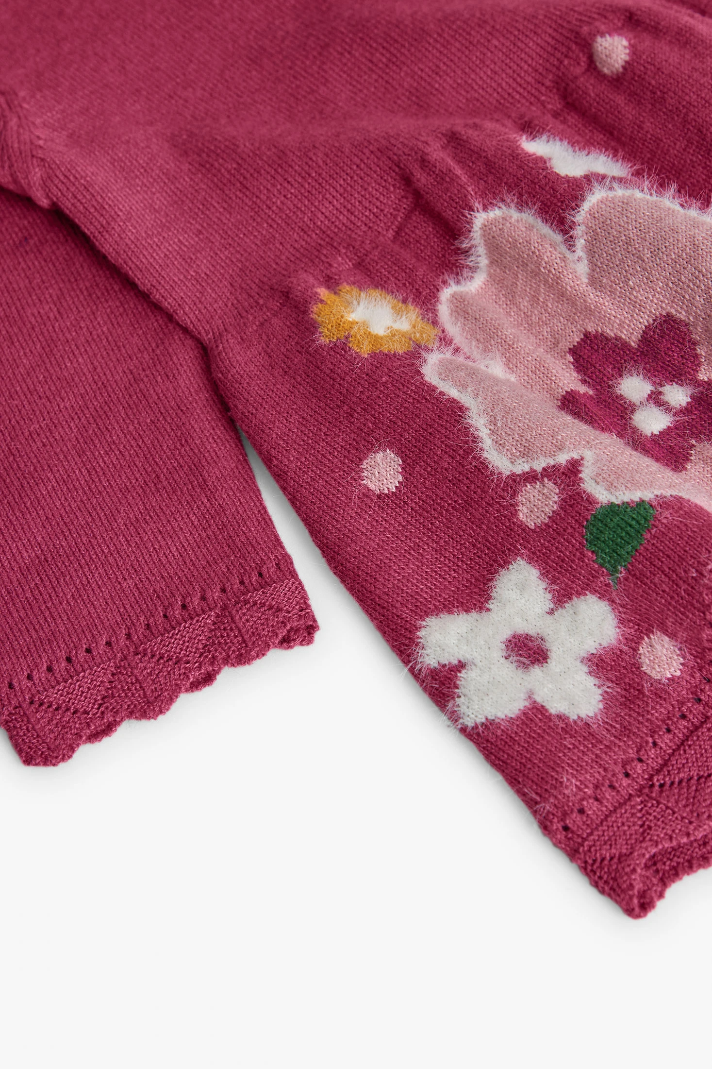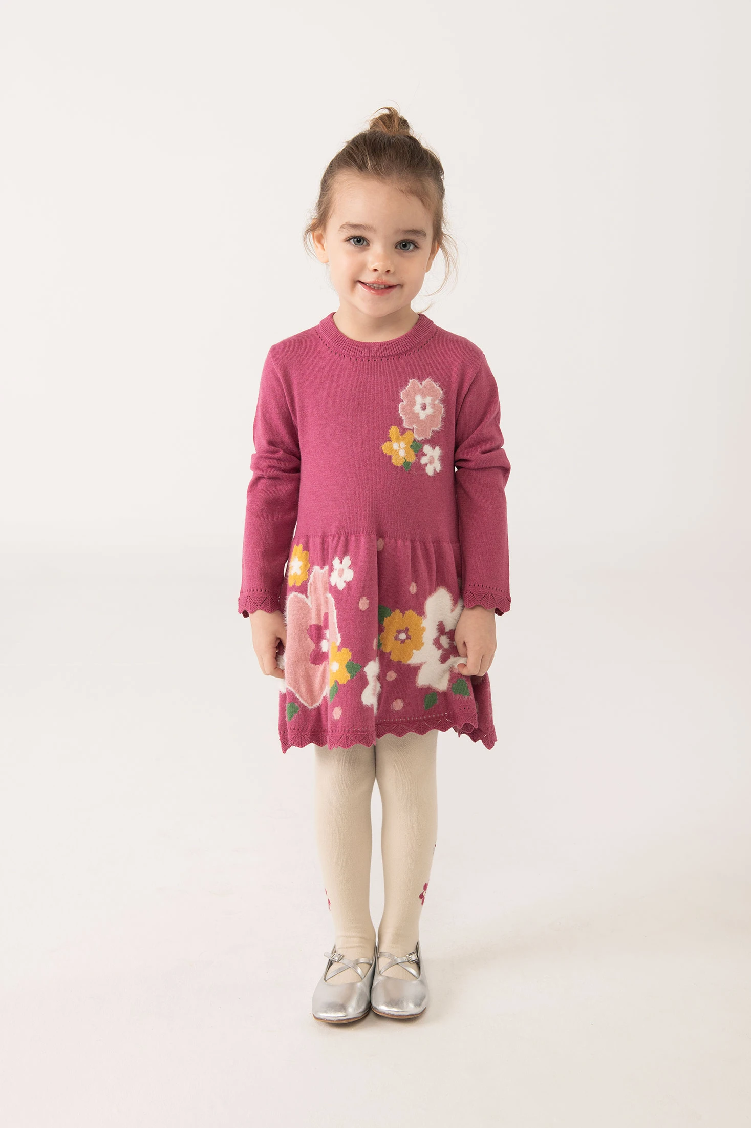 Strawberry-coloured dress, perfect for the autumn and winter season, offers comfort and warmth thanks to its soft fabric. It features a floral design in shades of pink, yellow, and white on a strawberry background, adding a cheerful splash of colour to the wardrobe. With a round neck and long sleeves, it is ideal for cooler days. Available in sizes from 12 months to 10 years, it pairs excellently with tights and jackets, achieving both an elegant and comfortable look for the little ones.