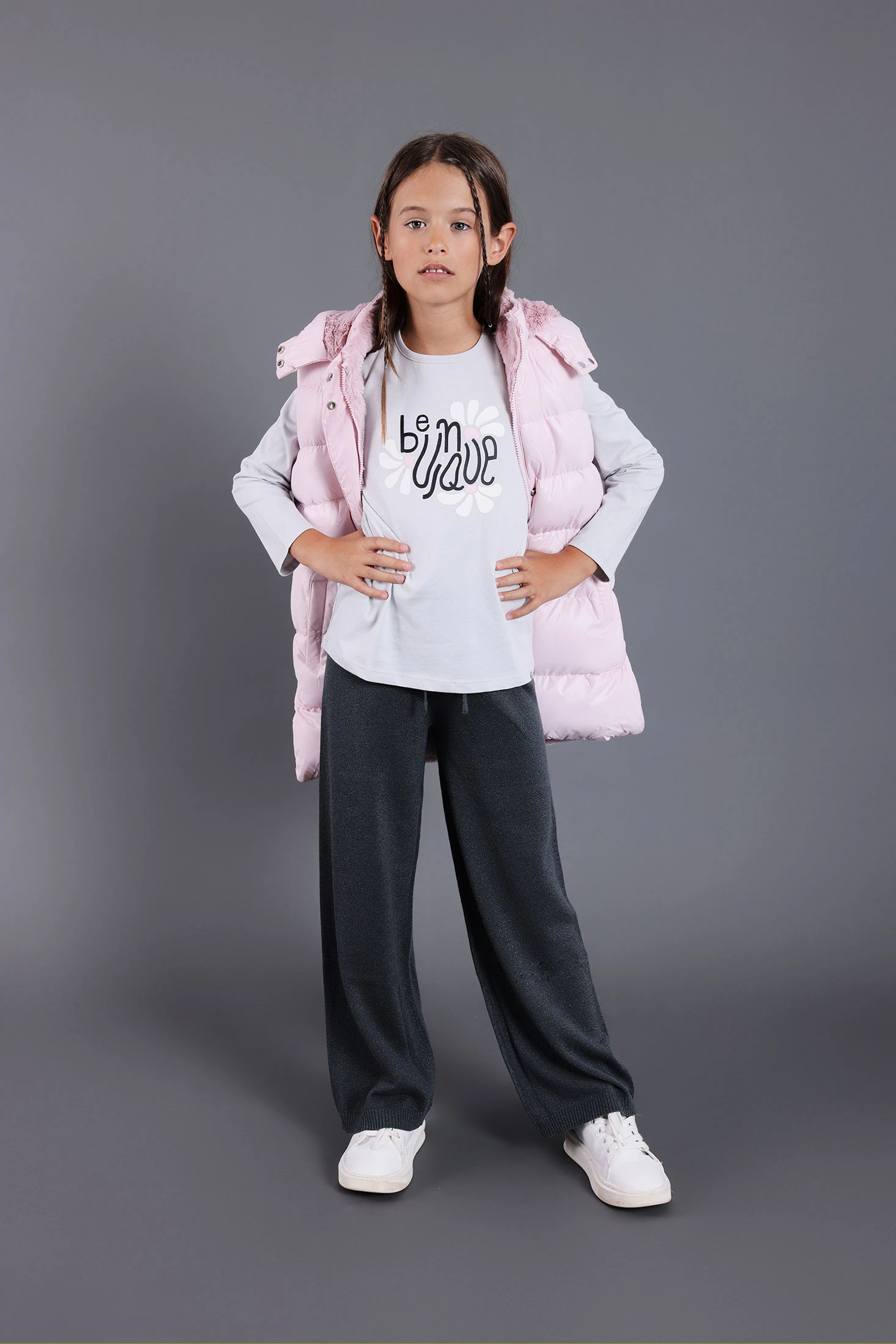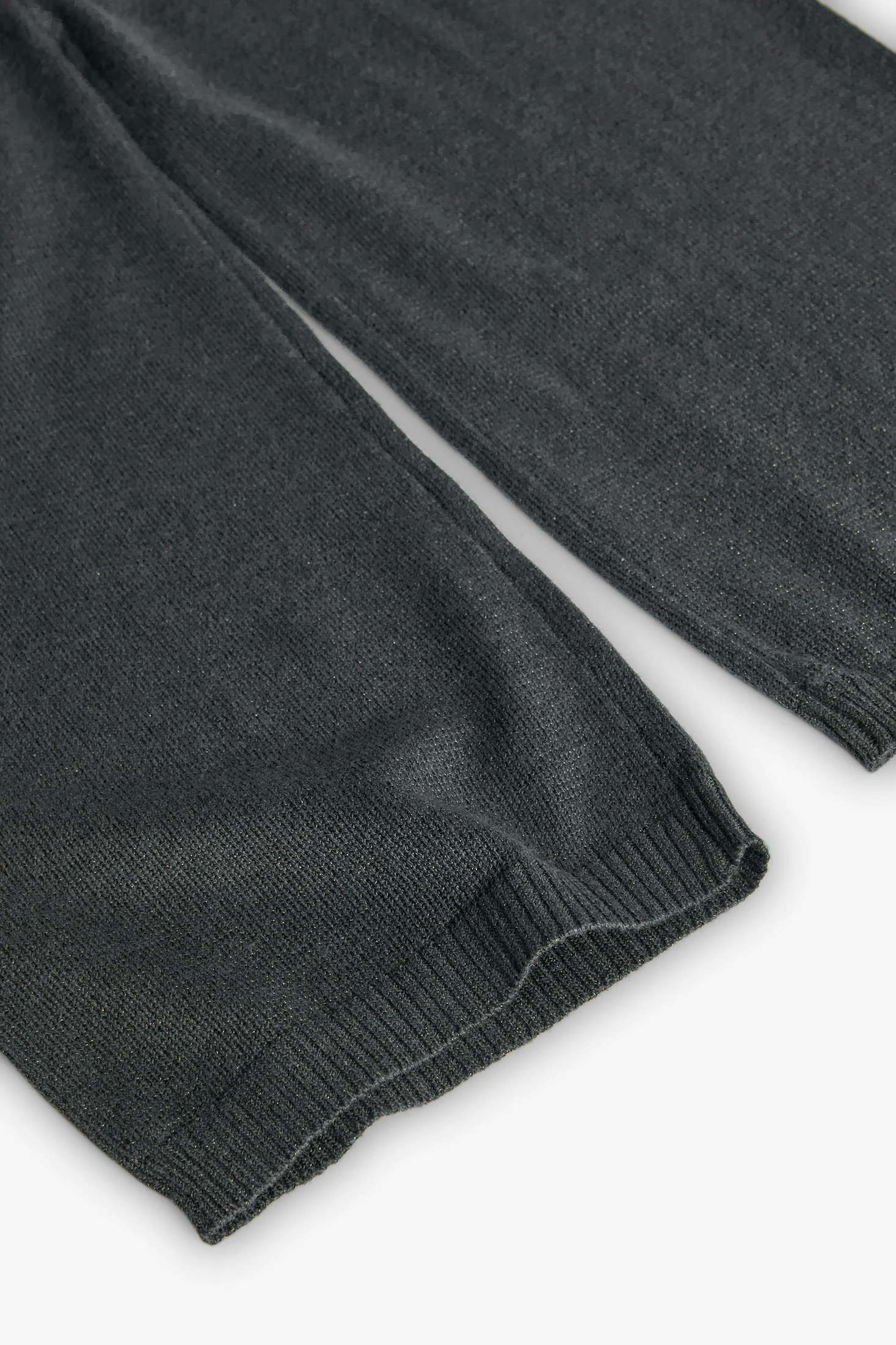 Knitted trousers for girls in grey, made from a soft knitted fabric that offers comfort and warmth, ideal for the autumn and winter seasons. Elastic and adjustable waistband ensures a perfect fit and adapts to the growth of girls aged 2 to 14 years. Versatile garment that easily pairs with jumpers and T-shirts, perfect for daily wear, creating warm and practical outfits during the cold season. Classic and simple design that suits various styles, making it a wardrobe essential for children.