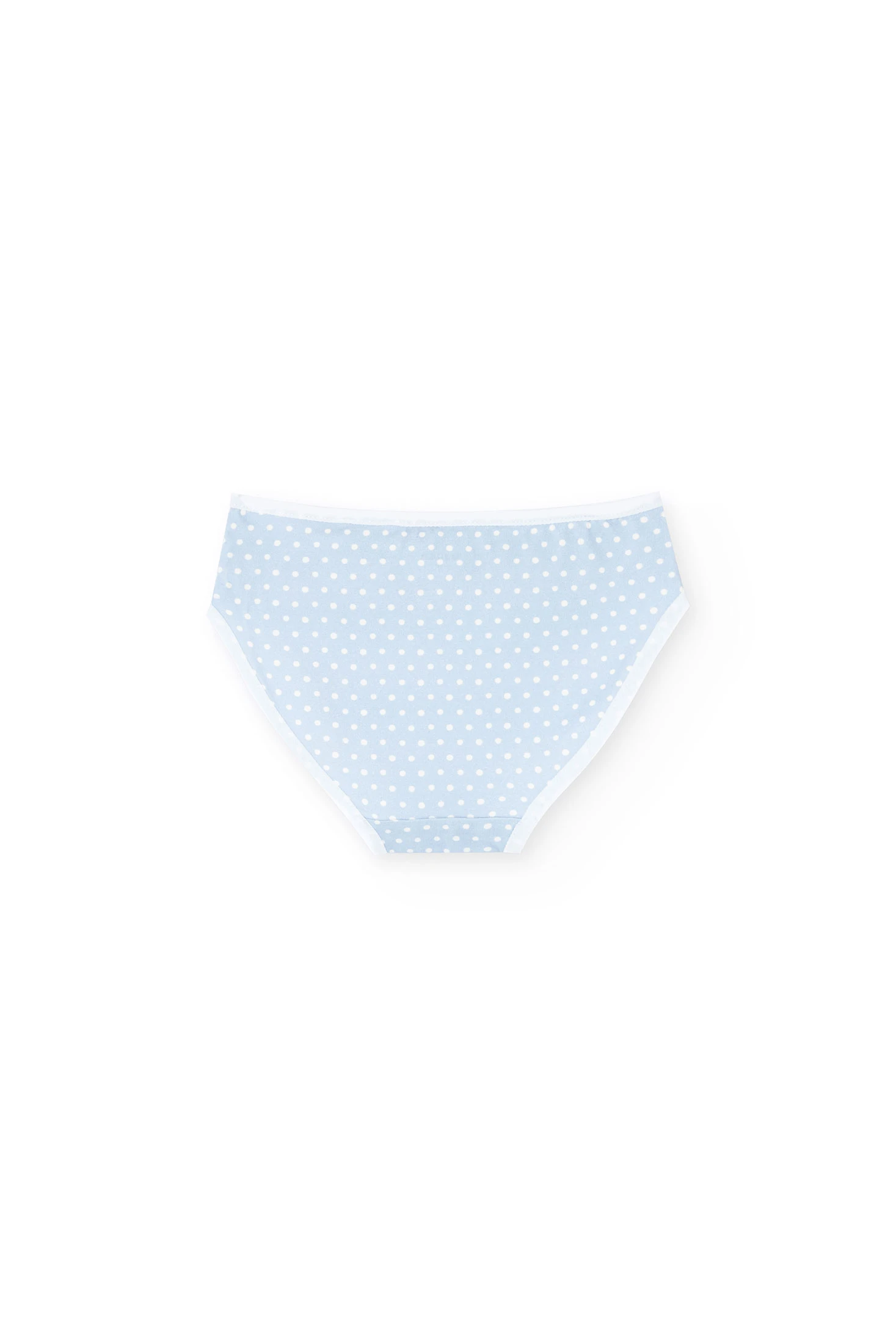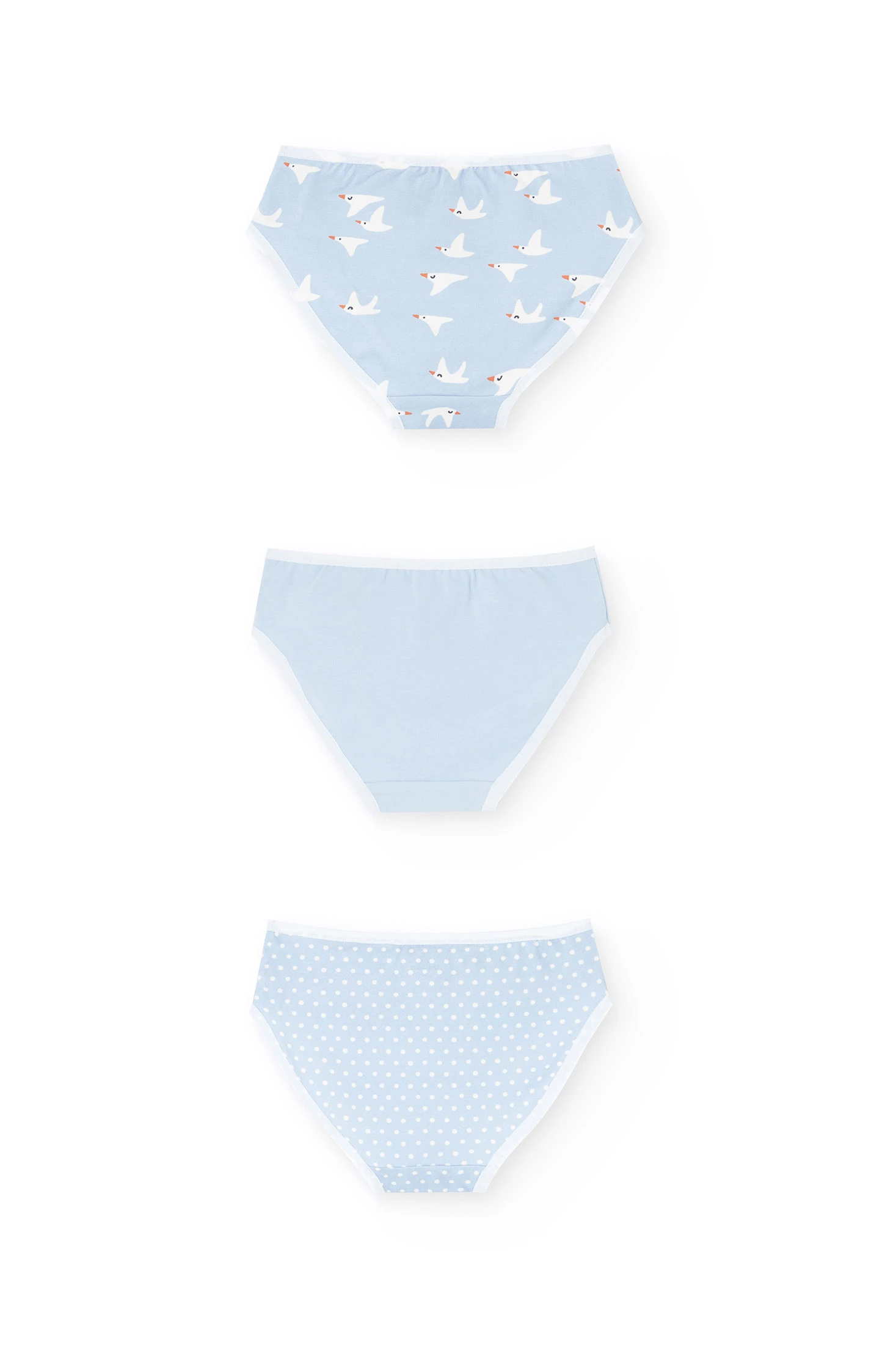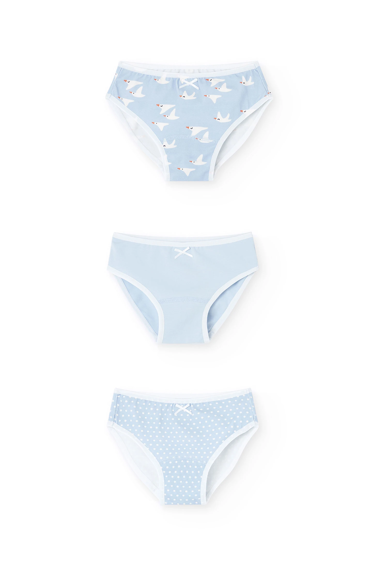 Pack of knitted briefs for girls offering three charming designs ideal for adding comfort and style to their everyday wardrobe. It includes a model with a print of small white birds, another in a solid colour, and a third with a white polka dot pattern, all adorned with a delicate bow at the front. Made from soft cotton, they guarantee an unmatched feeling of comfort, making them perfect for any time of the year. Available in sizes from 2 to 14 years, they are practical for pairing with any children's outfit.