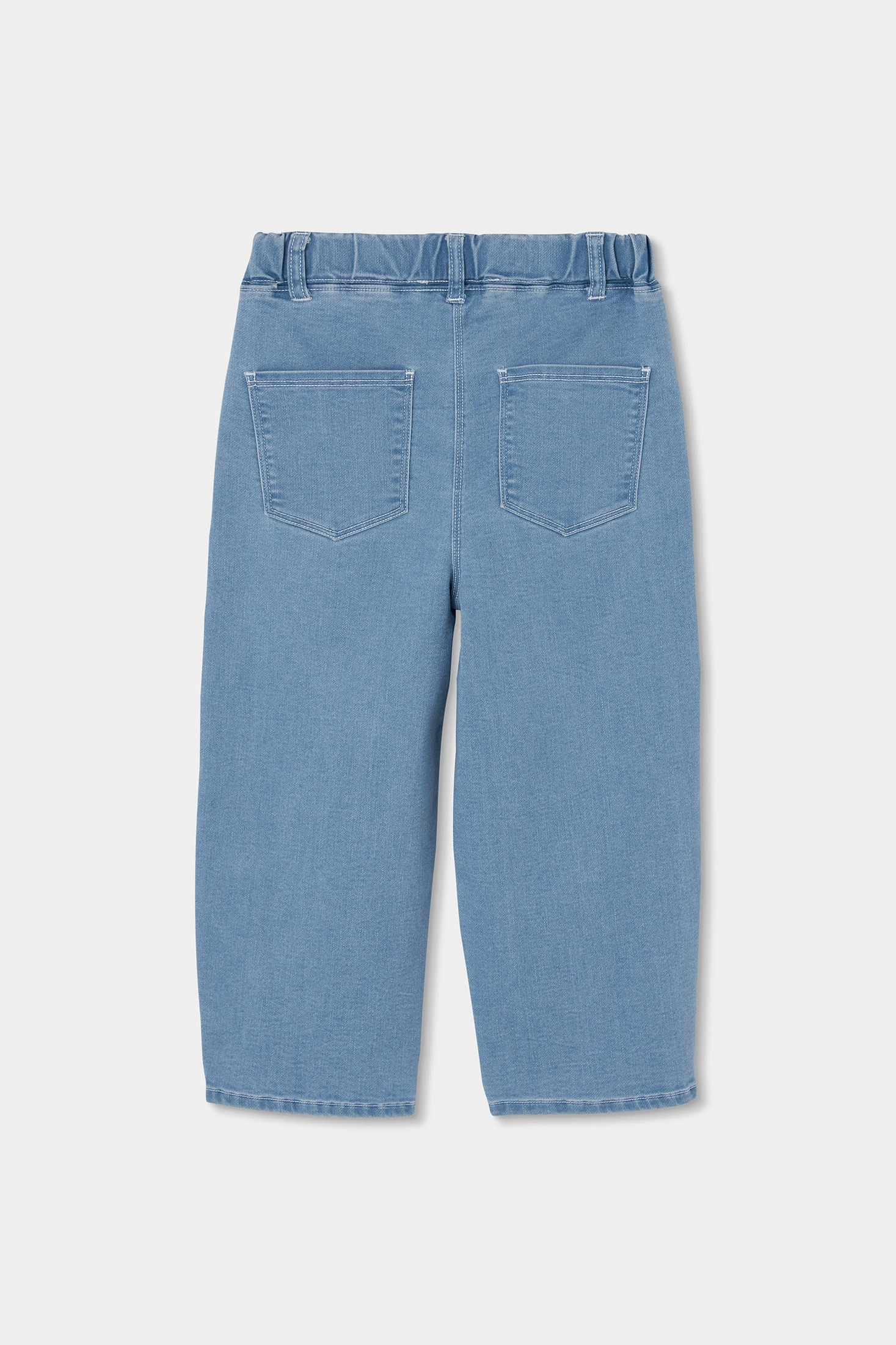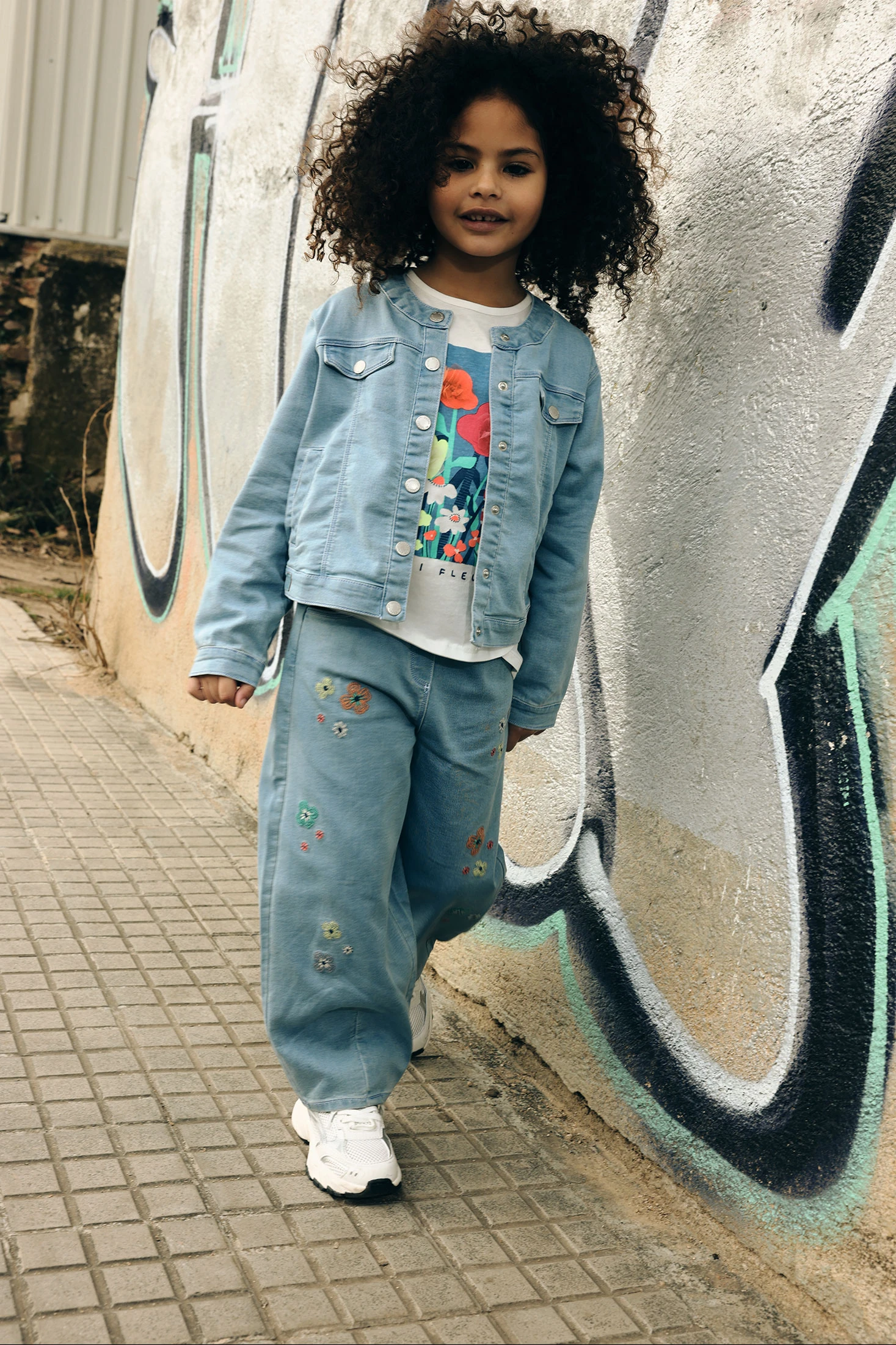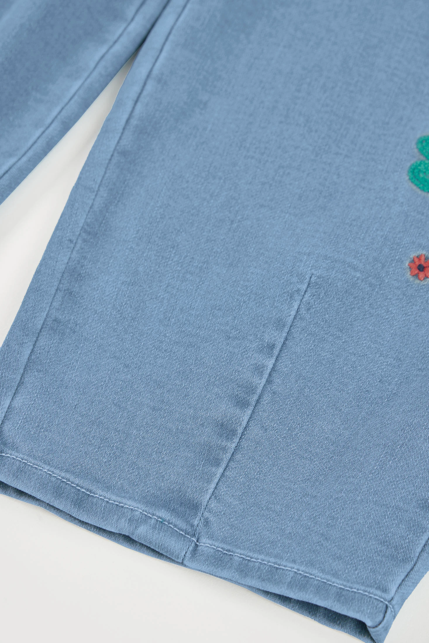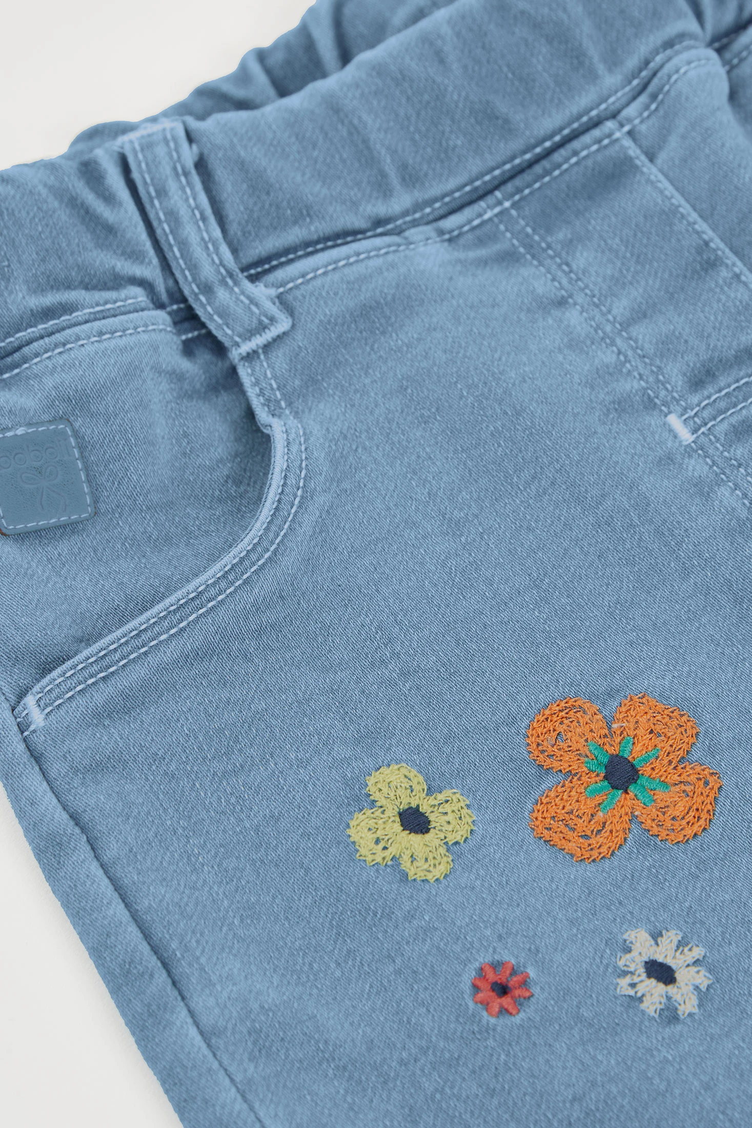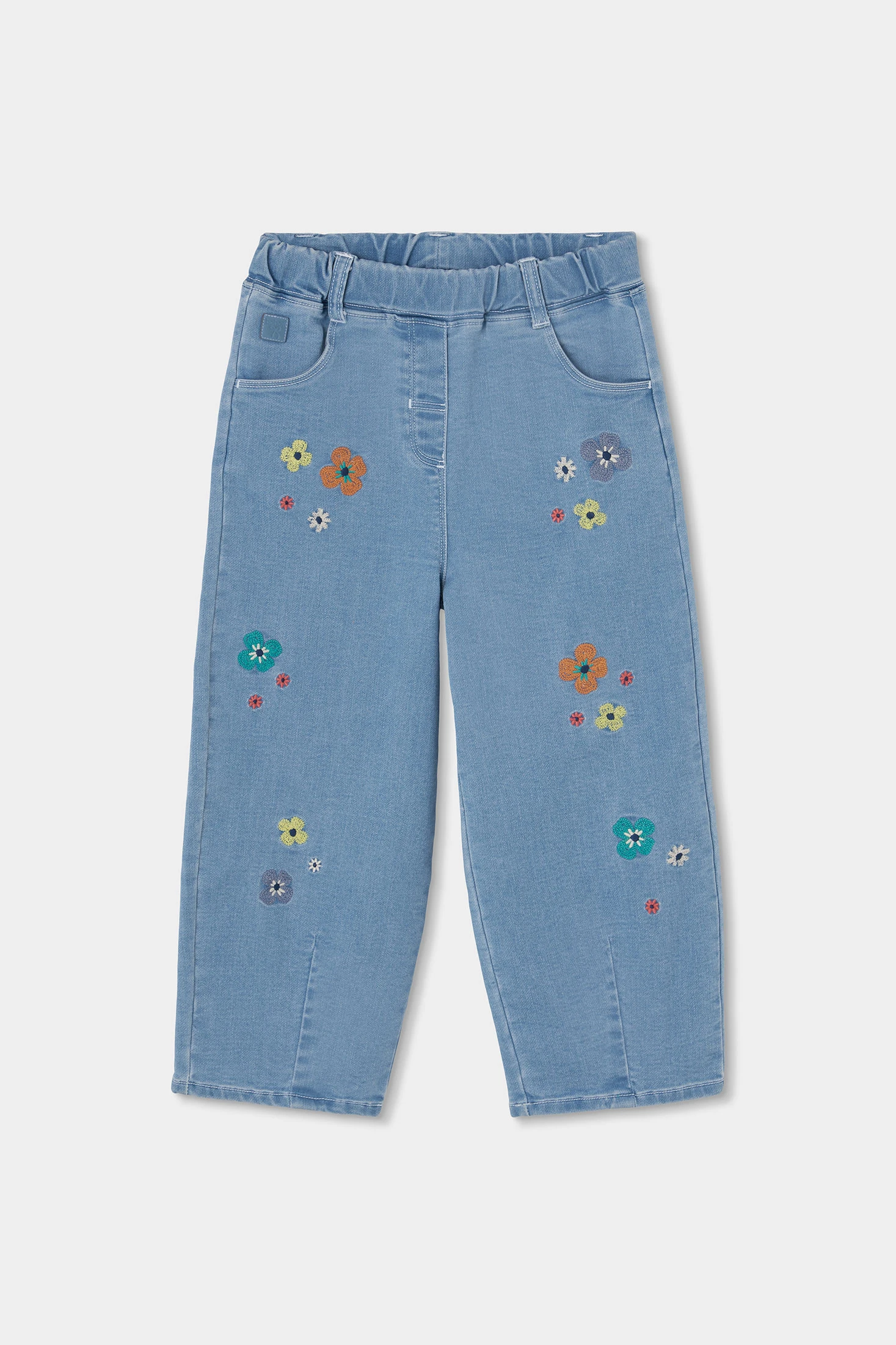 Bleach denim trousers for girls, perfect for combining style and comfort. The standout feature is the multicoloured floral embroidery that adds a cheerful and fun touch. The design includes an adjustable elastic waistband, making it easy to wear on any occasion. It is ideal for girls aged 12 months to 10 years. Its light blue colour makes it easy to pair with various garments. This piece is a versatile and practical option for everyday wear.
