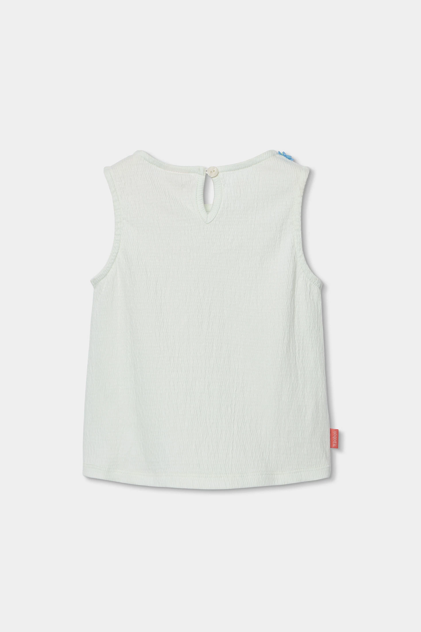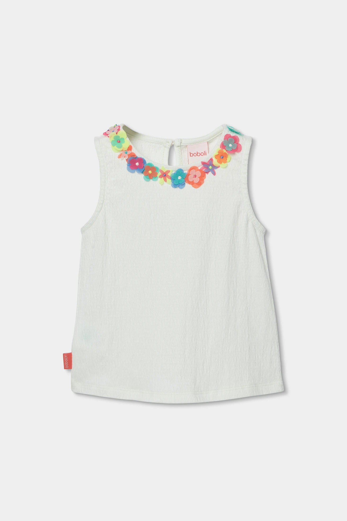 Fantasy knit T-shirt in pearl colour for girls. It features a simple design with multicoloured flower appliqu?s around the neckline, adding a cheerful touch. This is a versatile and comfortable garment, perfect for combining with different styles. Available in sizes from 12 months to 10 years, adapting to growth. Its soft and light fabric ensures comfort throughout the day. A charming choice to add colour and style to any girl?s wardrobe.