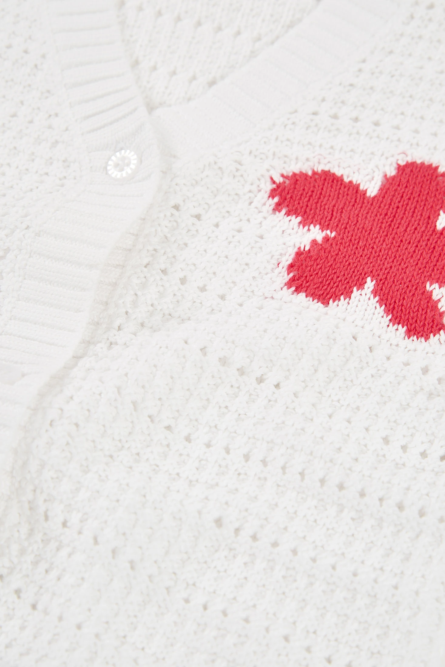 White knitted cardigan for girls, perfect for cooler seasons. Made from a soft fabric, it offers comfort and warmth. It features a colourful floral design on the chest, adding a fun and feminine touch. The cardigan has a button fastening, making it easy to wear. It is suitable for girls aged 12 months to 14 years. It can be easily paired with jeans or skirts for a casual and cosy look.