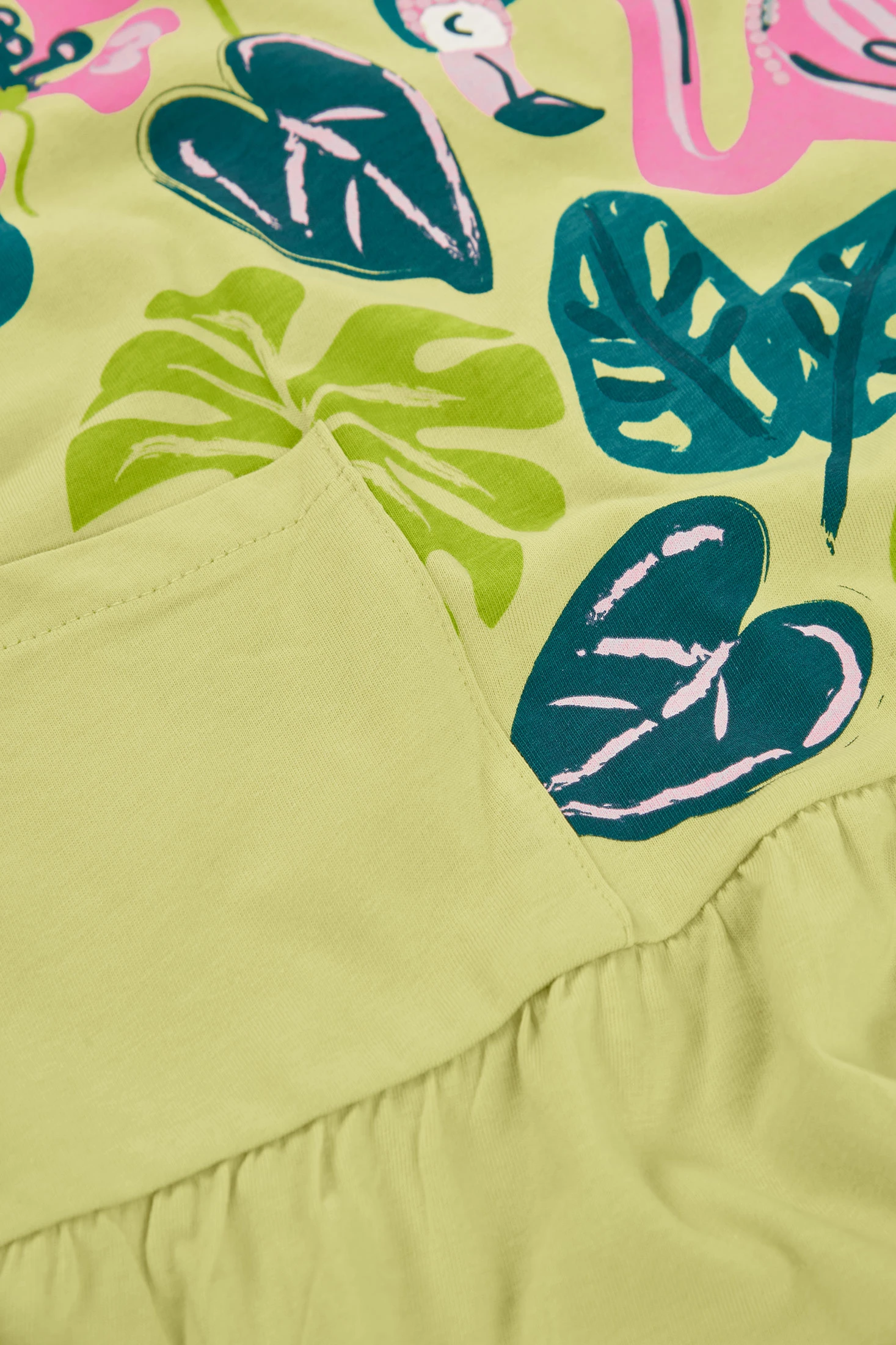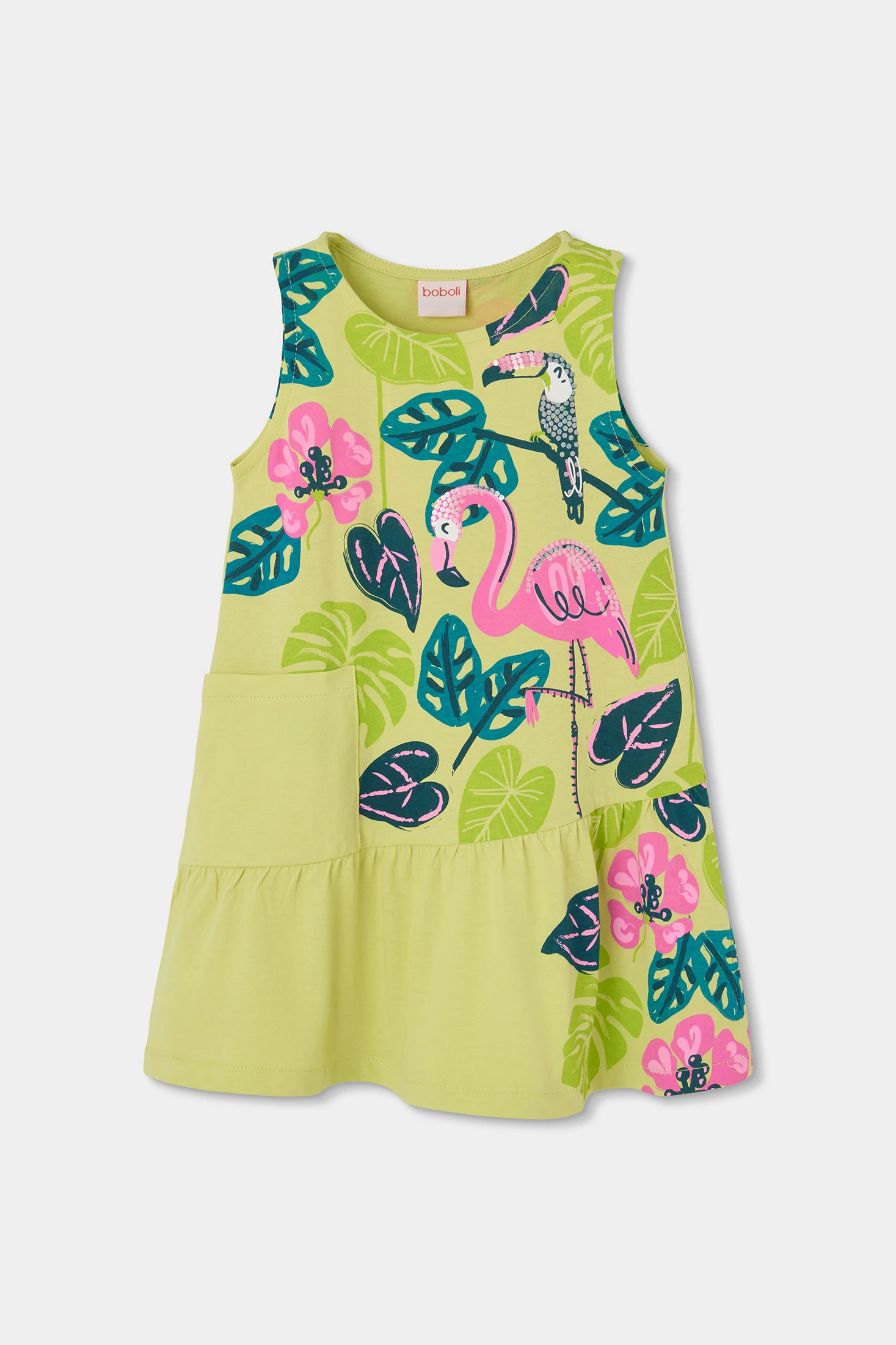 Charming knitted dress for girls, perfect for the spring and summer season. With a vibrant green colour and a fun print of leaves and birds, it's ideal for little explorers. The material is soft and comfortable, making it perfect for everyday wear. Available in sizes ranging from 2 years to 14 years, it suits all childhood ages. Its sleeveless design makes it a fresh and versatile choice for any casual occasion. A cheerful and colourful garment that will add style to your girl's wardrobe.