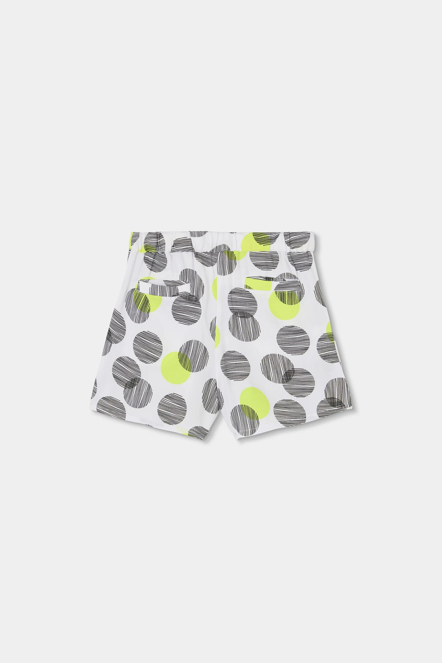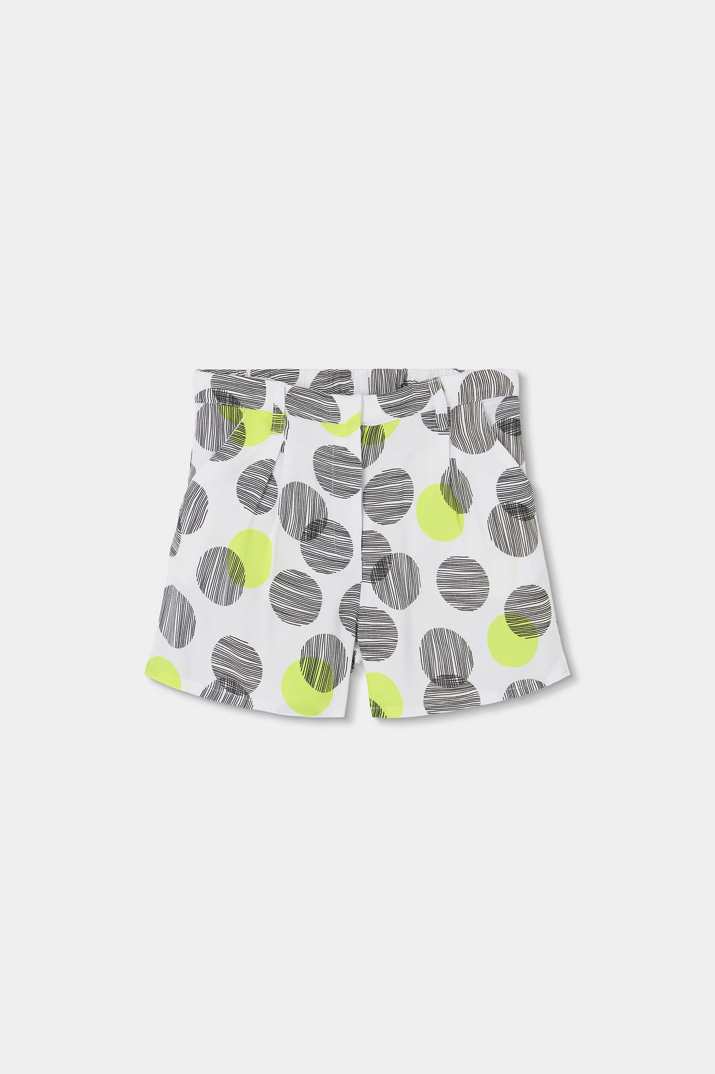 Patterned shorts for girls, ideal for warm climates, made from a lightweight and comfortable material. They feature a design of large black and neon green polka dots on a white background, adding a modern and fun touch. Perfect for girls aged 2 to 14 years. The versatile design allows them to be easily paired with basic t-shirts for a casual and fresh style. Their cut and design offer comfort and freedom of movement, ideal for everyday wear.