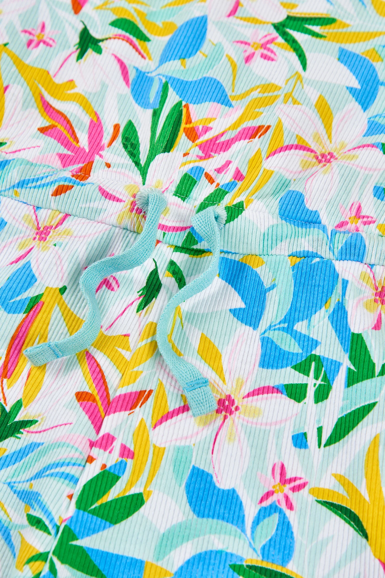 Ribbed floral print romper ideal for girls. Made from soft and stretchy material, it provides comfort for daily wear. It features a vibrant multicoloured floral print on a light blue background, with details in blue, yellow, and pink tones. The design includes straps and a drawstring at the waist for a perfect fit. Suitable for ages 2 to 14 years.