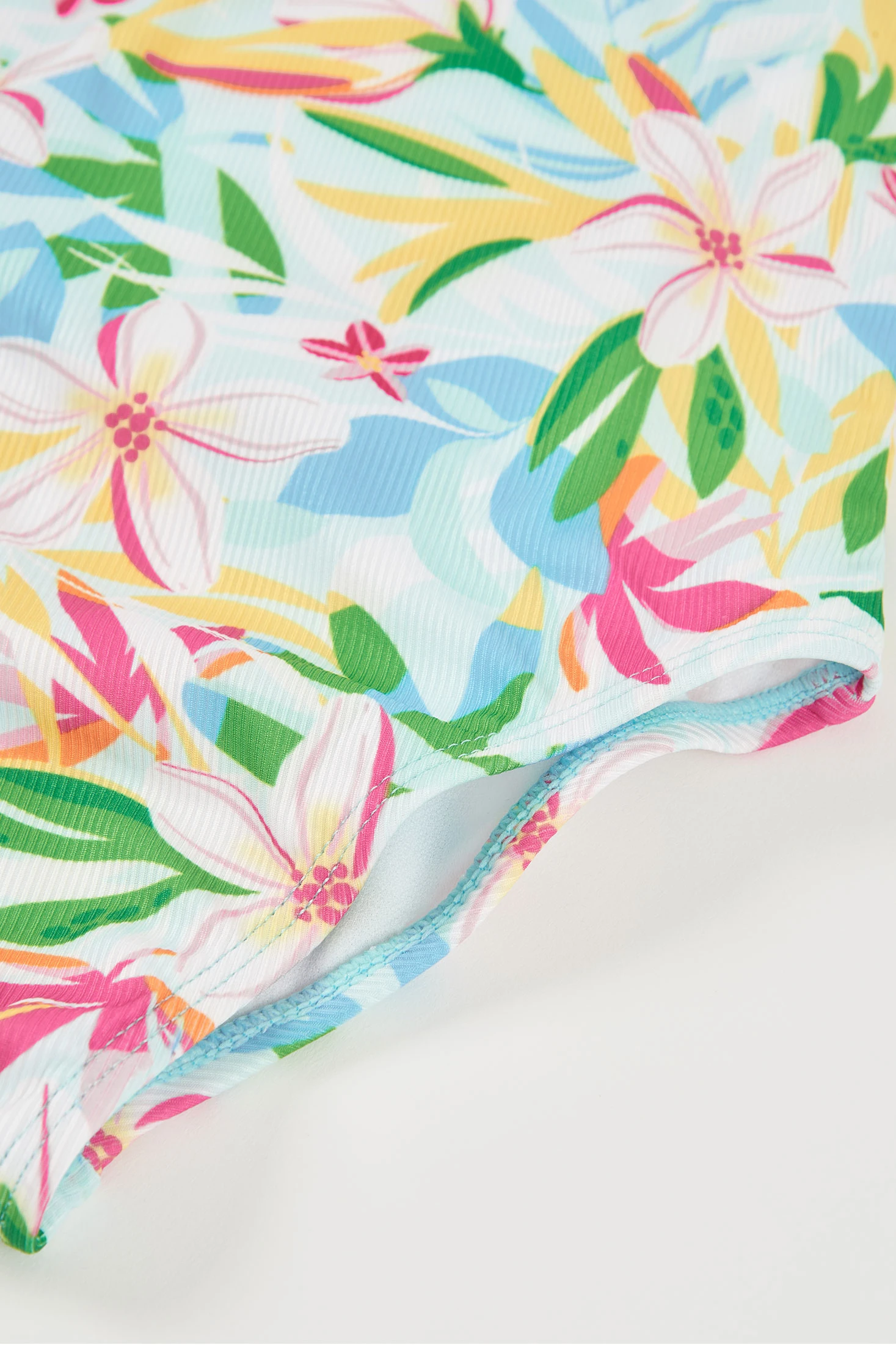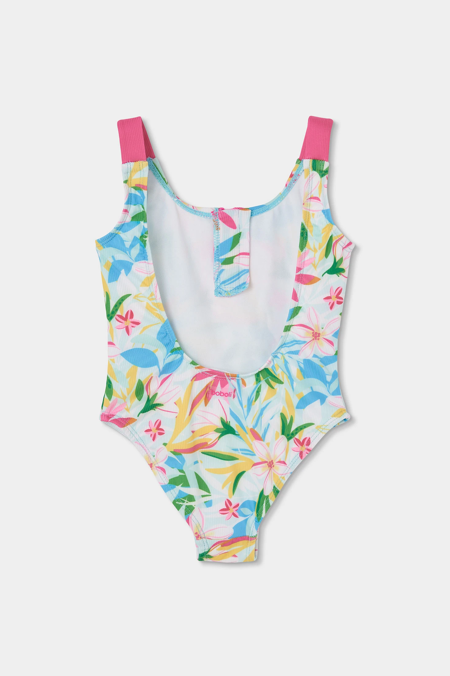Floral-printed swimsuit for girls that combines colour and style. Its vibrant design includes shades of pink, blue, and green, making it perfect for standing out in the water. The wide straps provide comfort and support. Made with a stretchy material and UPF50 sun protection, it fits the body perfectly, allowing freedom of movement. Available in sizes from 2 years to 14 years. Perfect for beach or pool days, its floral print adds a fresh and summery touch. This garment is a cheerful and practical choice for enjoying the water in style.