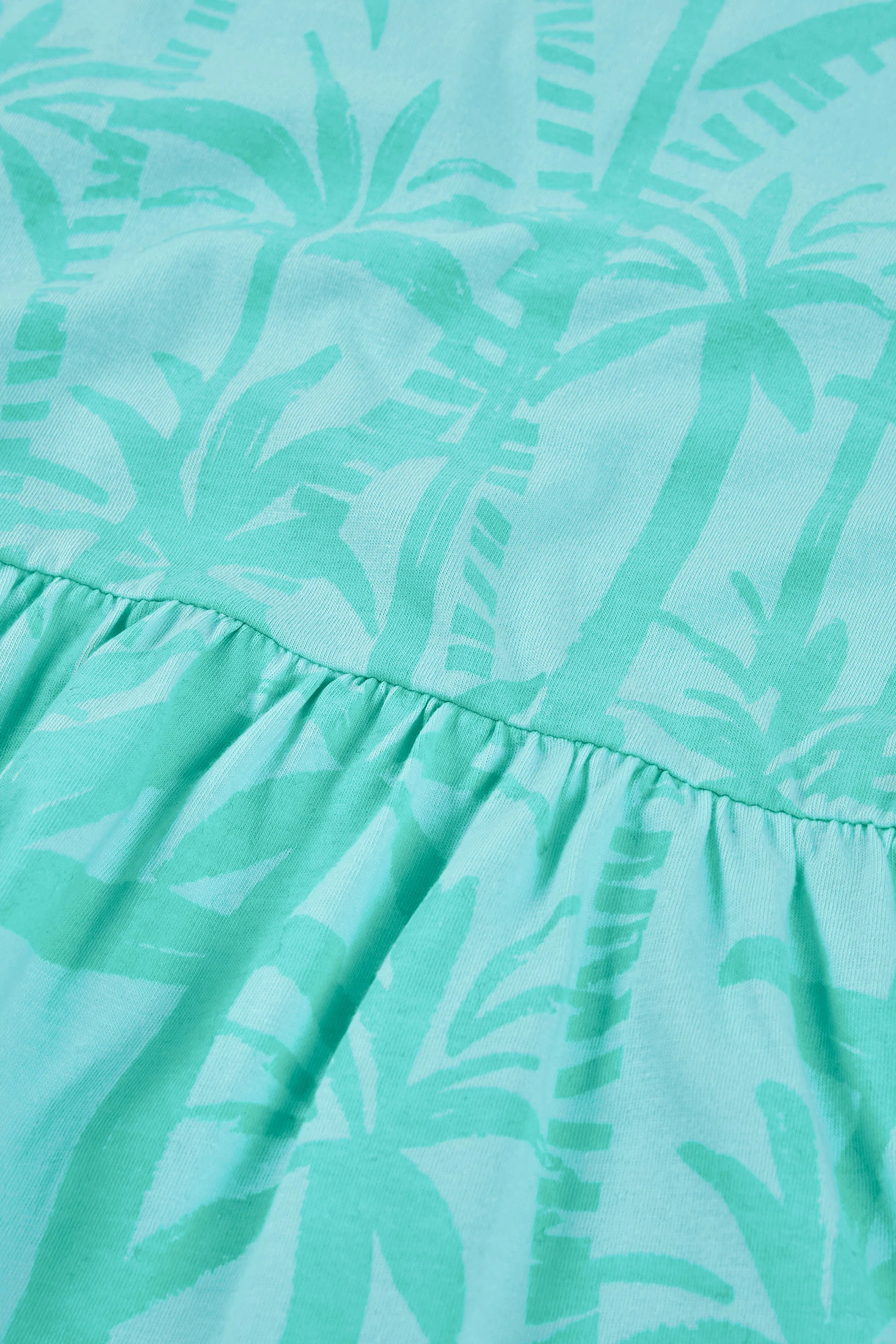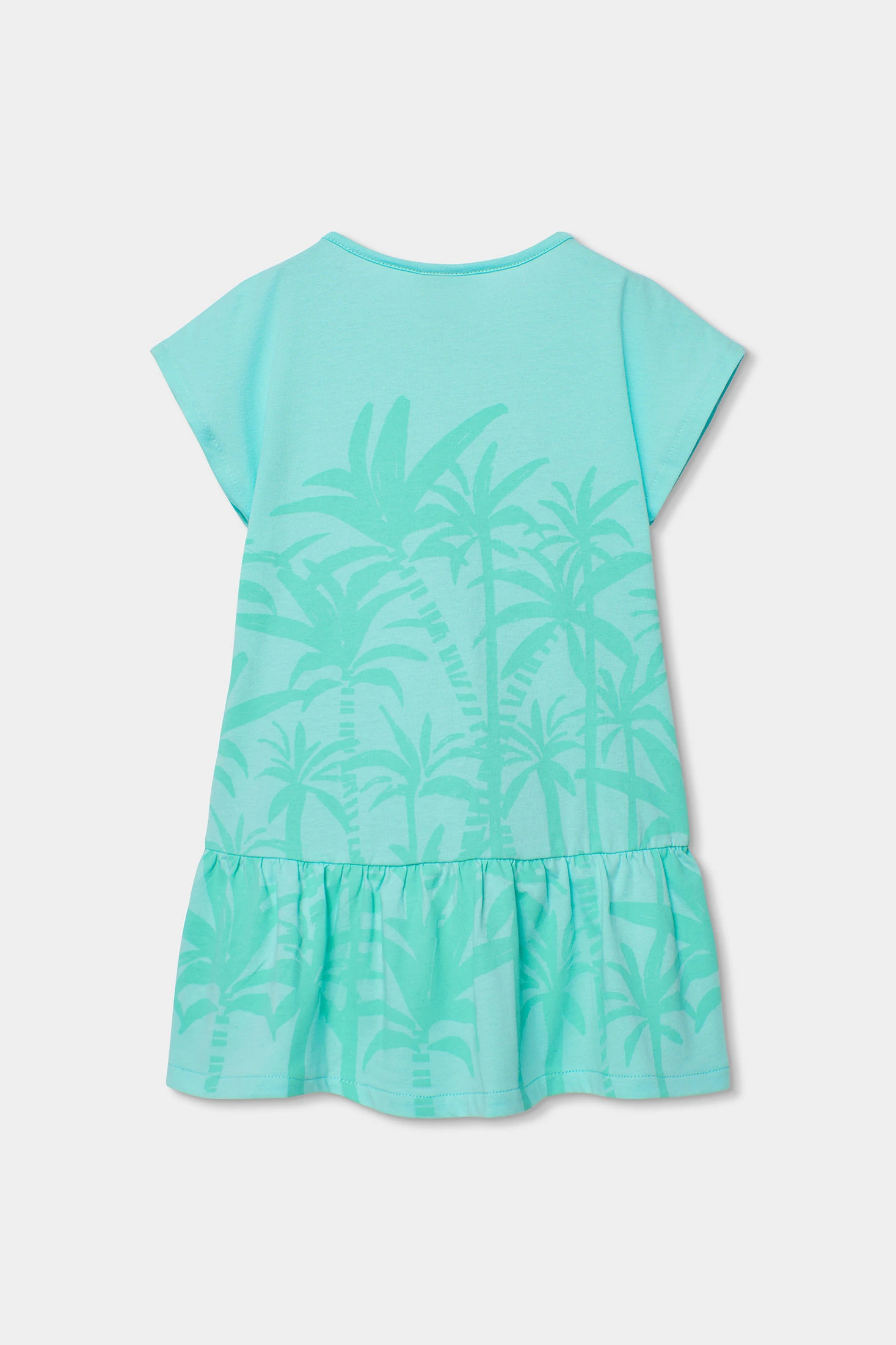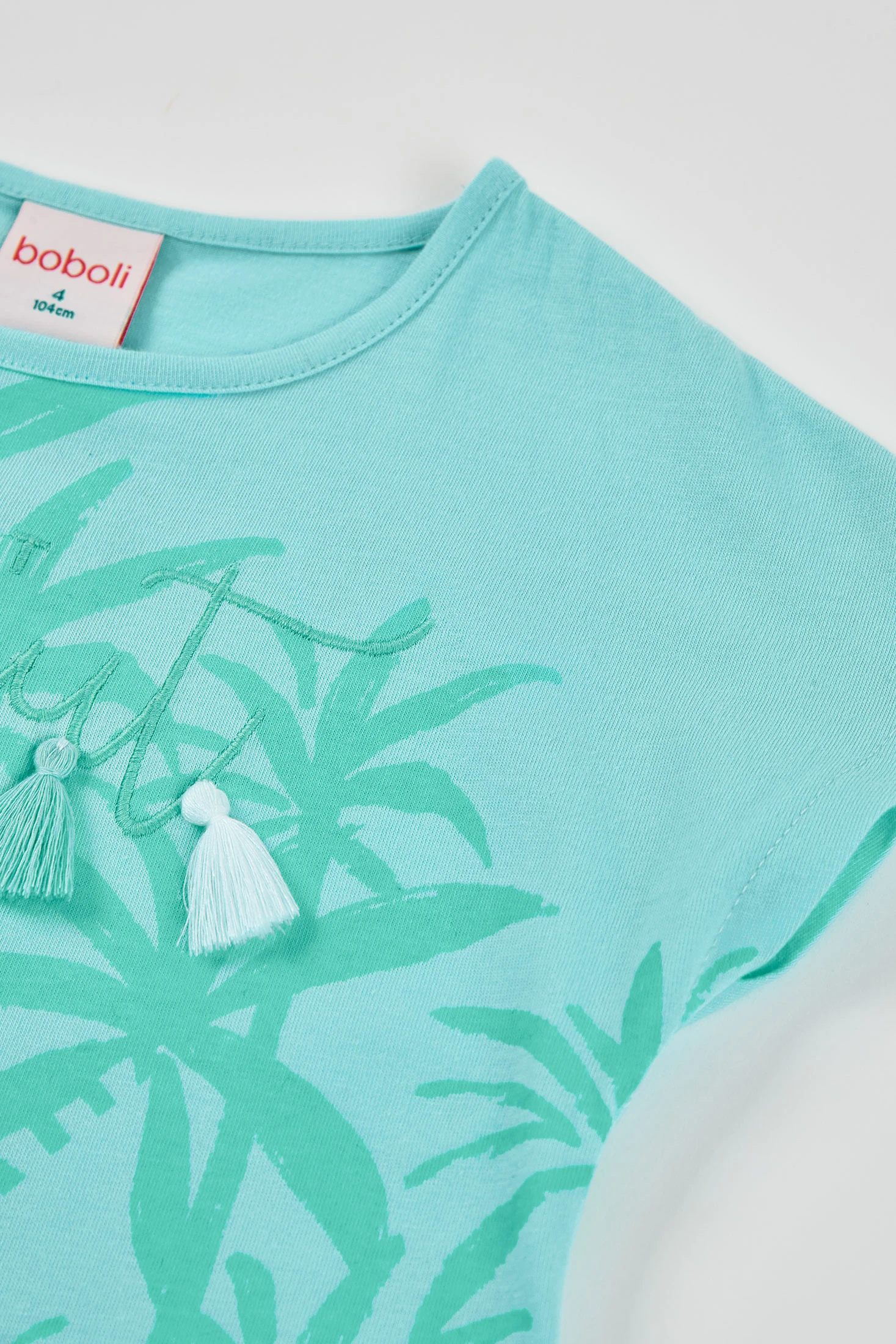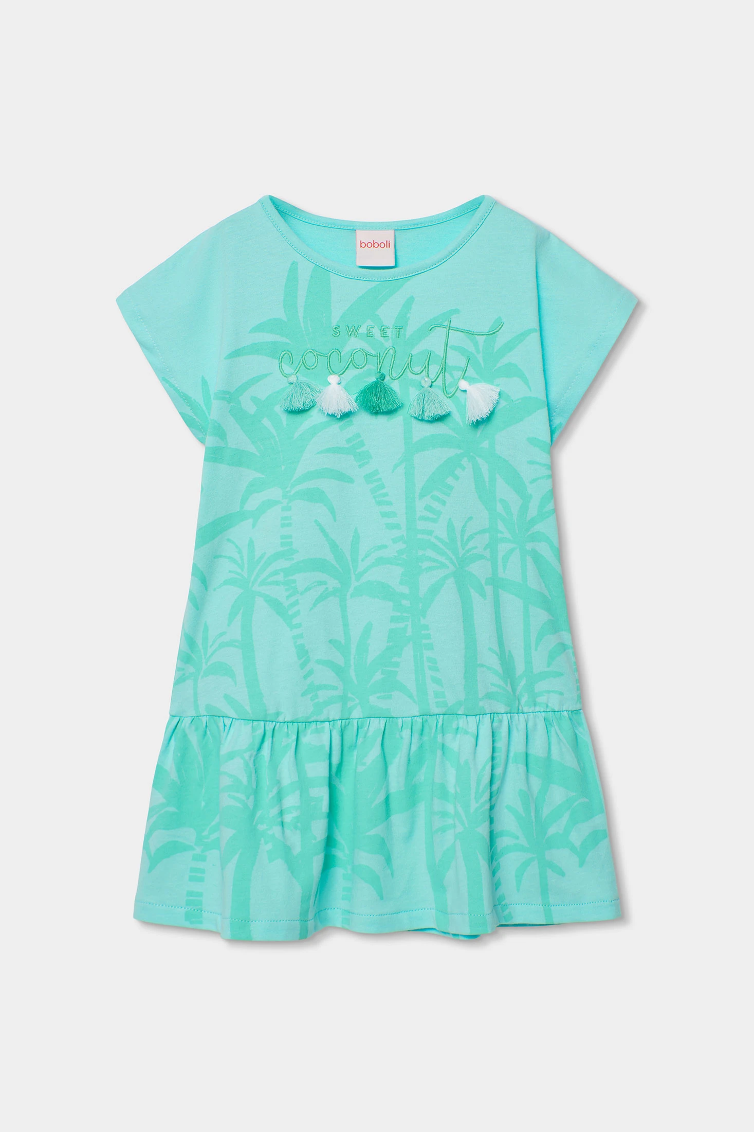 Girls' dress perfect for summer days, made of blue knit fabric with a palm tree design that gives it a tropical and fresh look. It features short sleeves and a flowing cut with a ruched detail on the skirt. Ideal for ages from 2 to 14 years, it offers comfort and style. Its versatile design allows it to be easily paired for any casual occasion. The small tassels at the front add a fun and eye-catching touch, perfect for a beachy summer look.