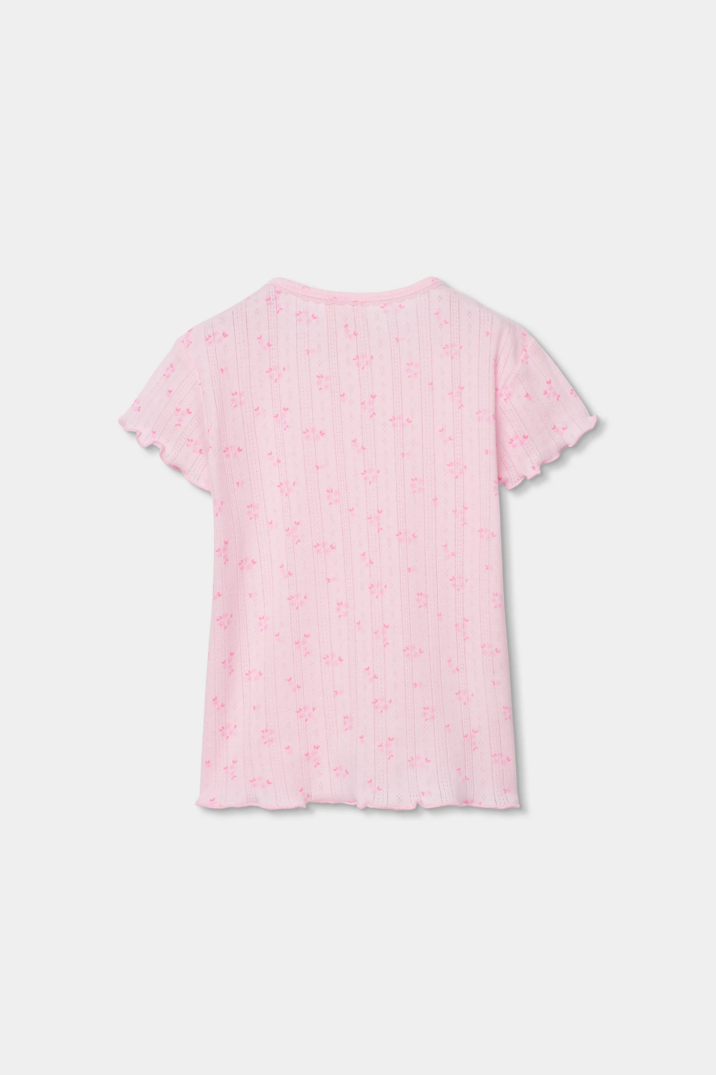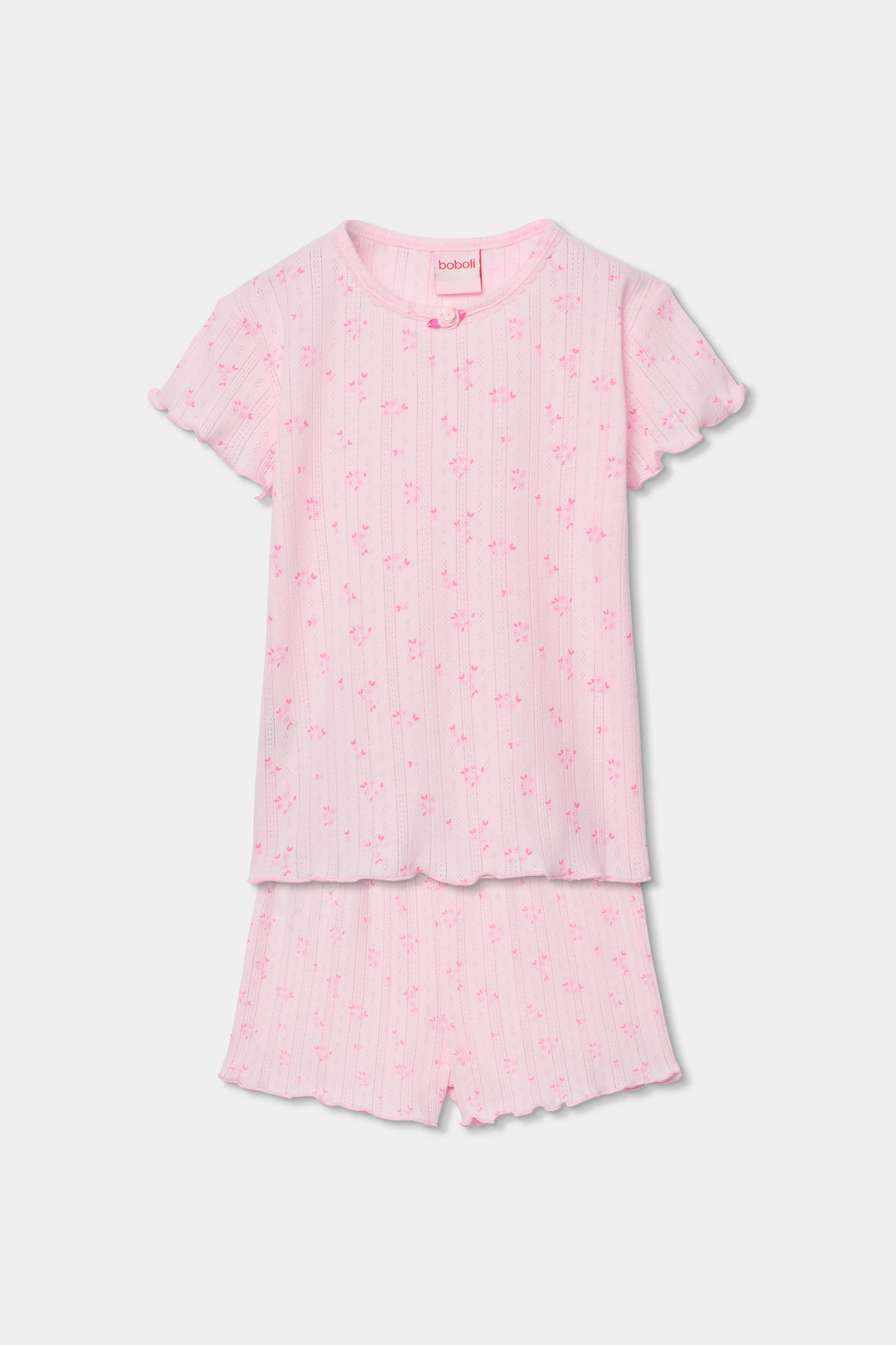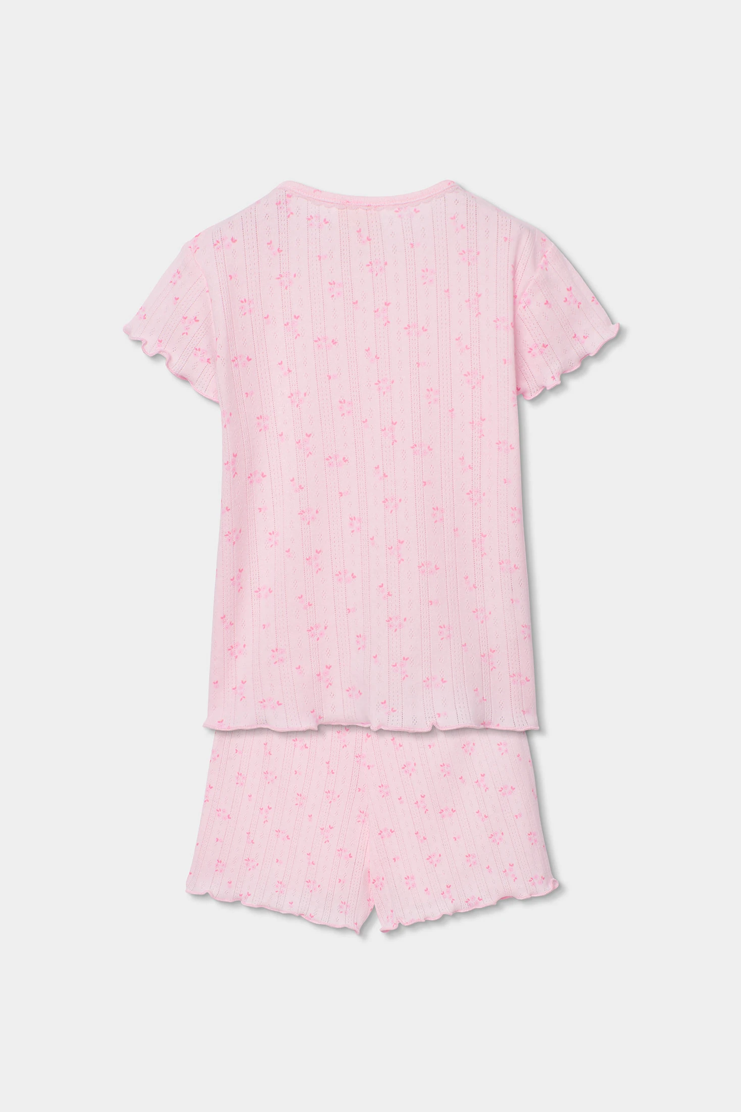 Girl?s pyjamas ideal for spring and summer, crafted in knit fabric offering softness and comfort. In light pink, it features a delicate floral print that adds a charming touch. With a round neck and short sleeves with wavy details, it?s perfect for staying cool throughout the night. Available in sizes for ages 2 to 12 years. Practical and comfortable pyjama set for your little one?s rest.
