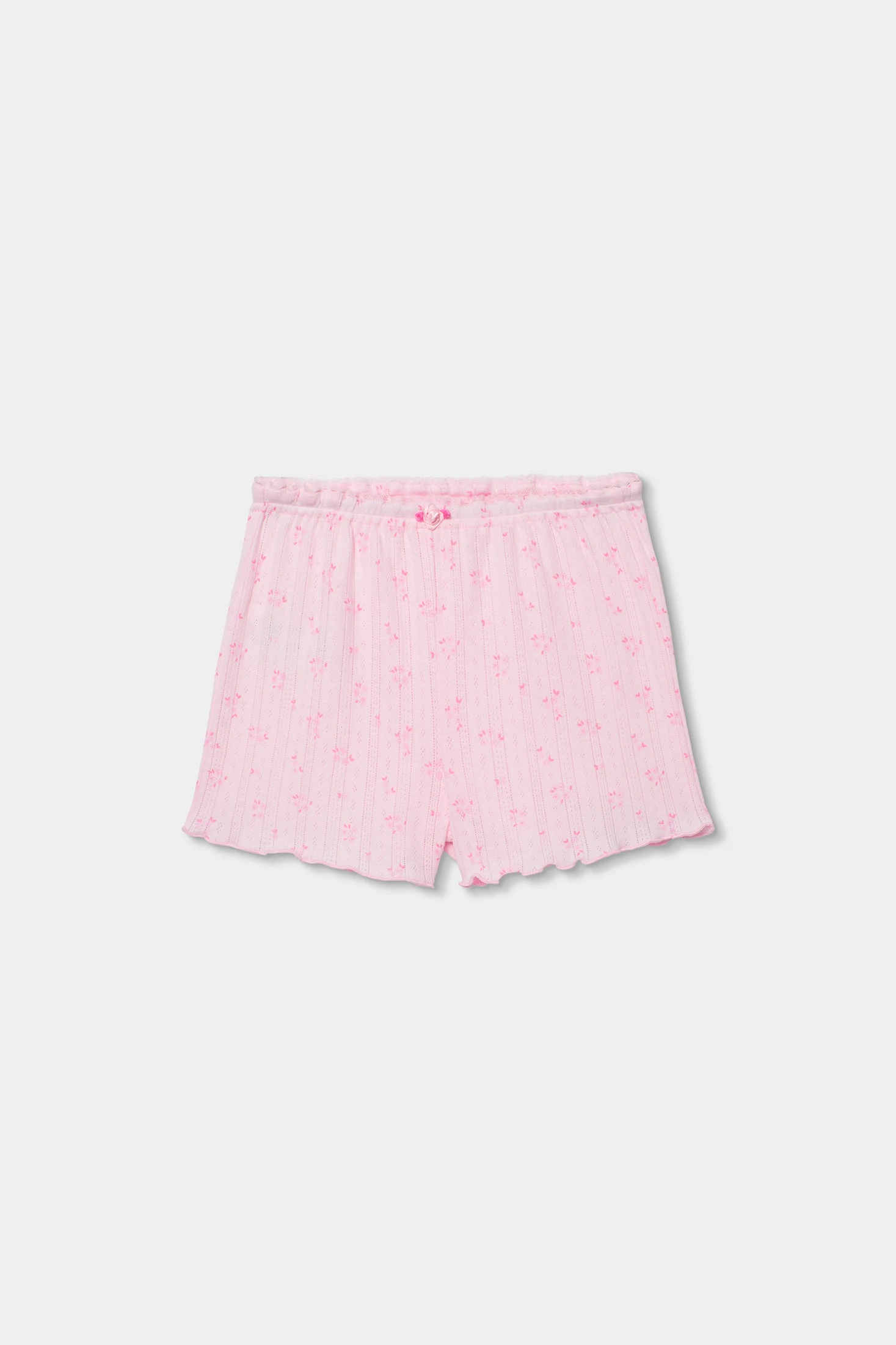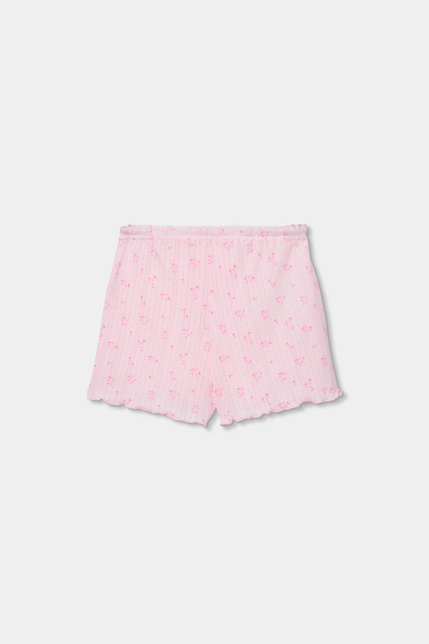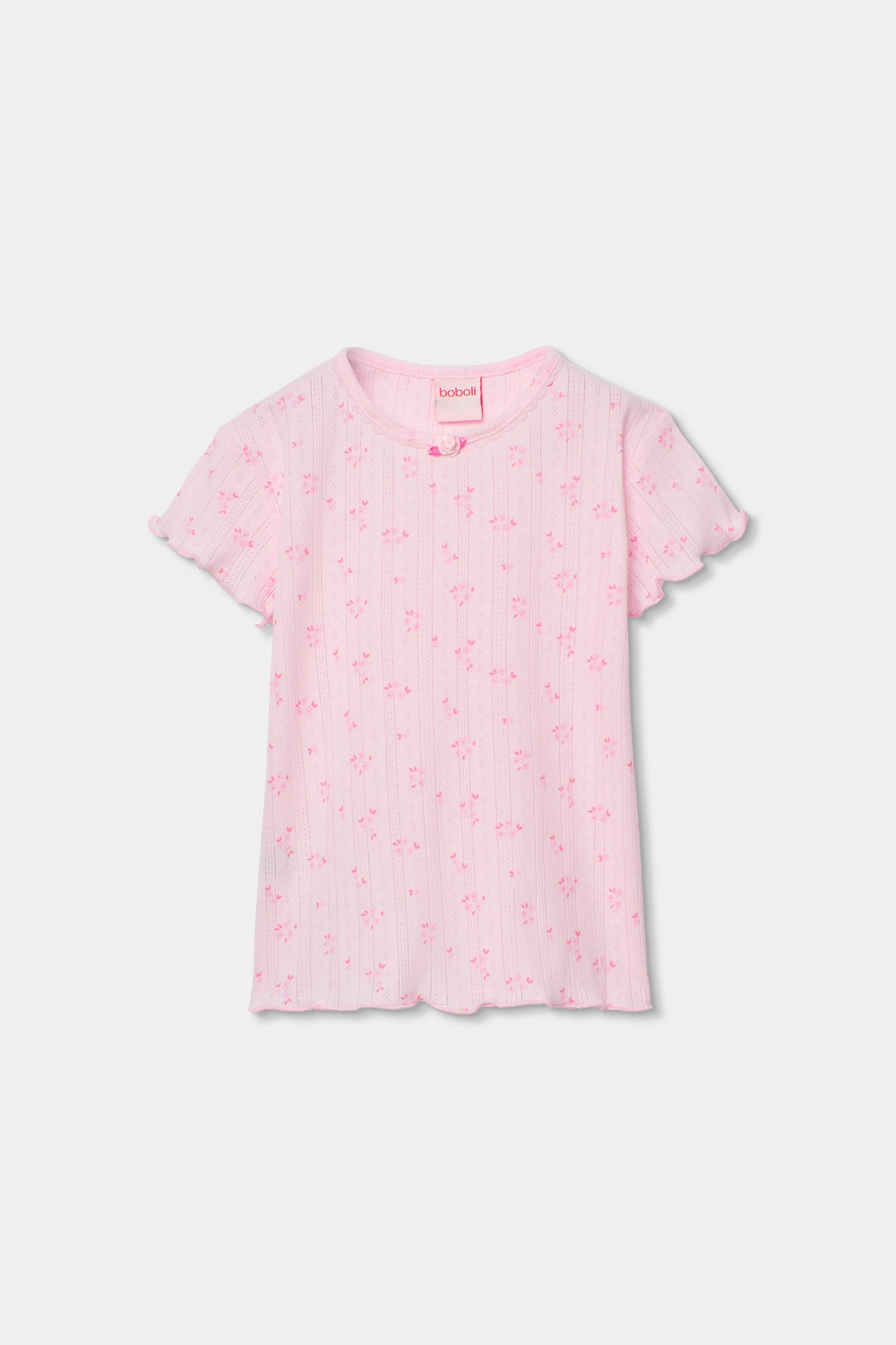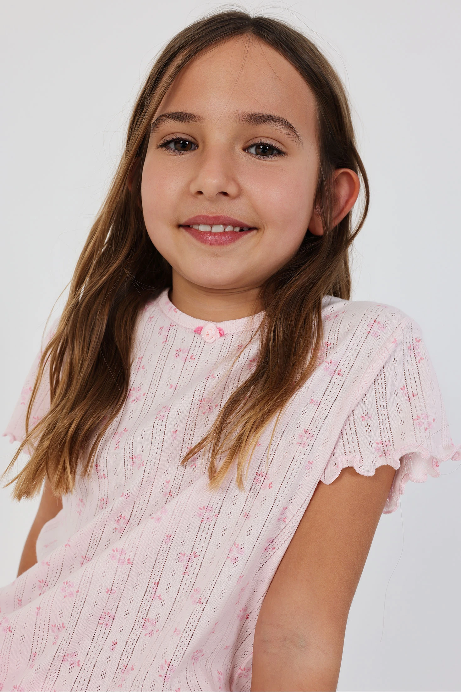 Girl?s pyjamas ideal for spring and summer, crafted in knit fabric offering softness and comfort. In light pink, it features a delicate floral print that adds a charming touch. With a round neck and short sleeves with wavy details, it?s perfect for staying cool throughout the night. Available in sizes for ages 2 to 12 years. Practical and comfortable pyjama set for your little one?s rest.