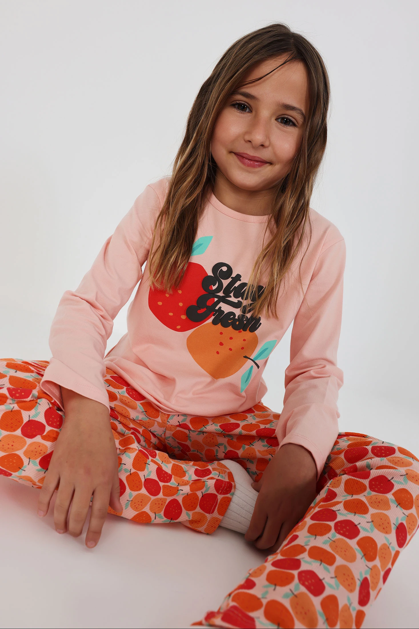 Knitted pyjamas for girls, in a soft salmon tone, perfect for the colder months. Made from stretchy and comfortable material, it features a fun front print of fruits and a trouser design with fruit prints in orange and red tones. The long sleeves ensure warmth throughout the night. Available in sizes from 2 to 12 years. Ideal for providing warmth and style at bedtime.